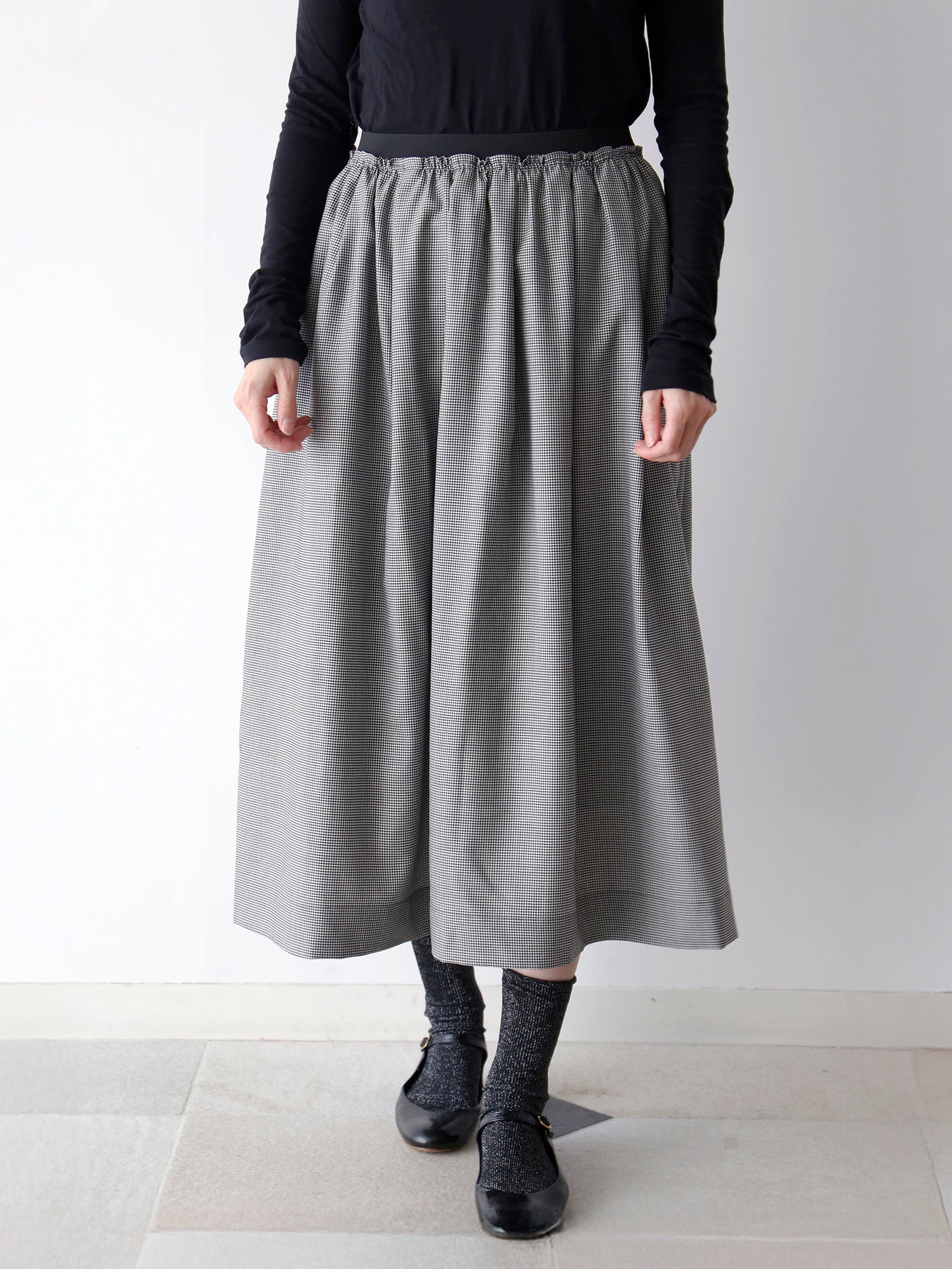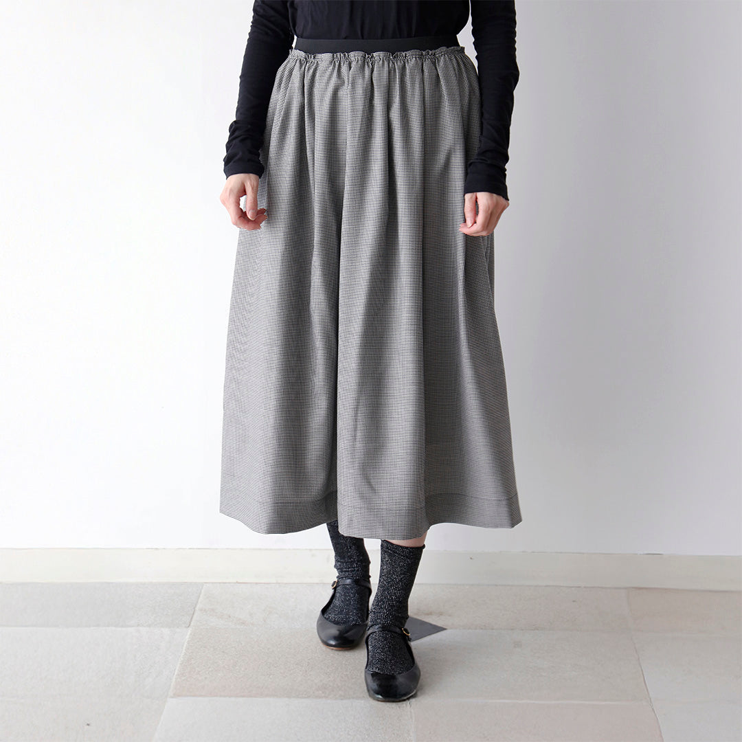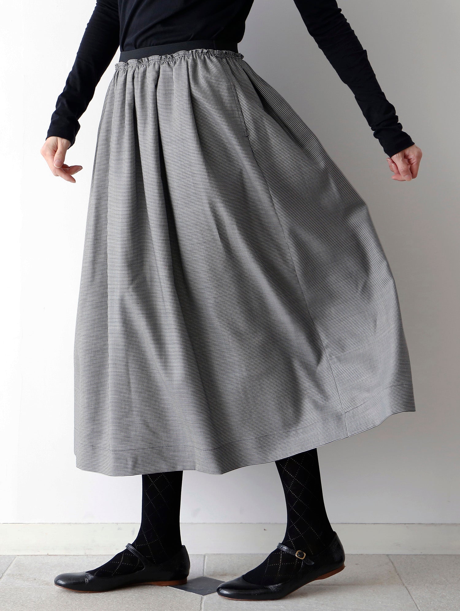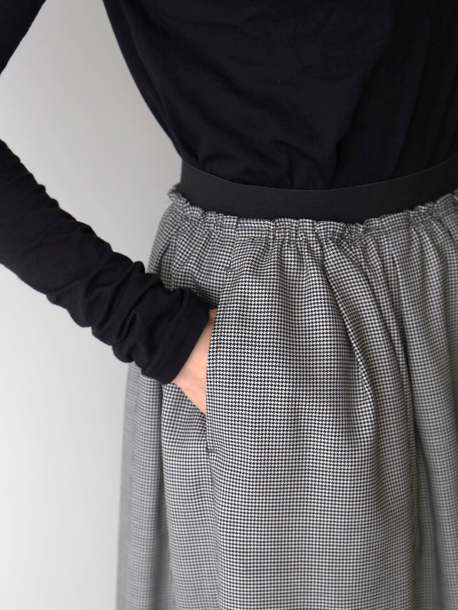 イタリア製ウールで仕立てた千鳥格子柄のスカート《エレノア》。細かな千鳥格子とタックギャザーが生み出す、やわらかなシルエットが魅力の一着です。