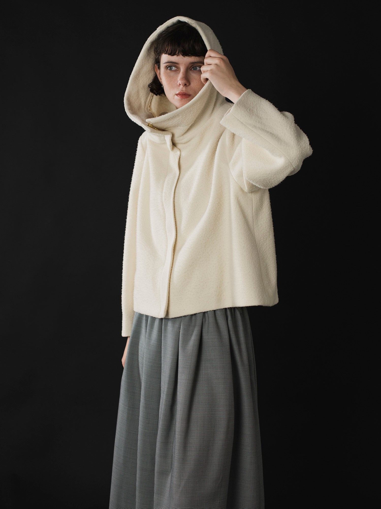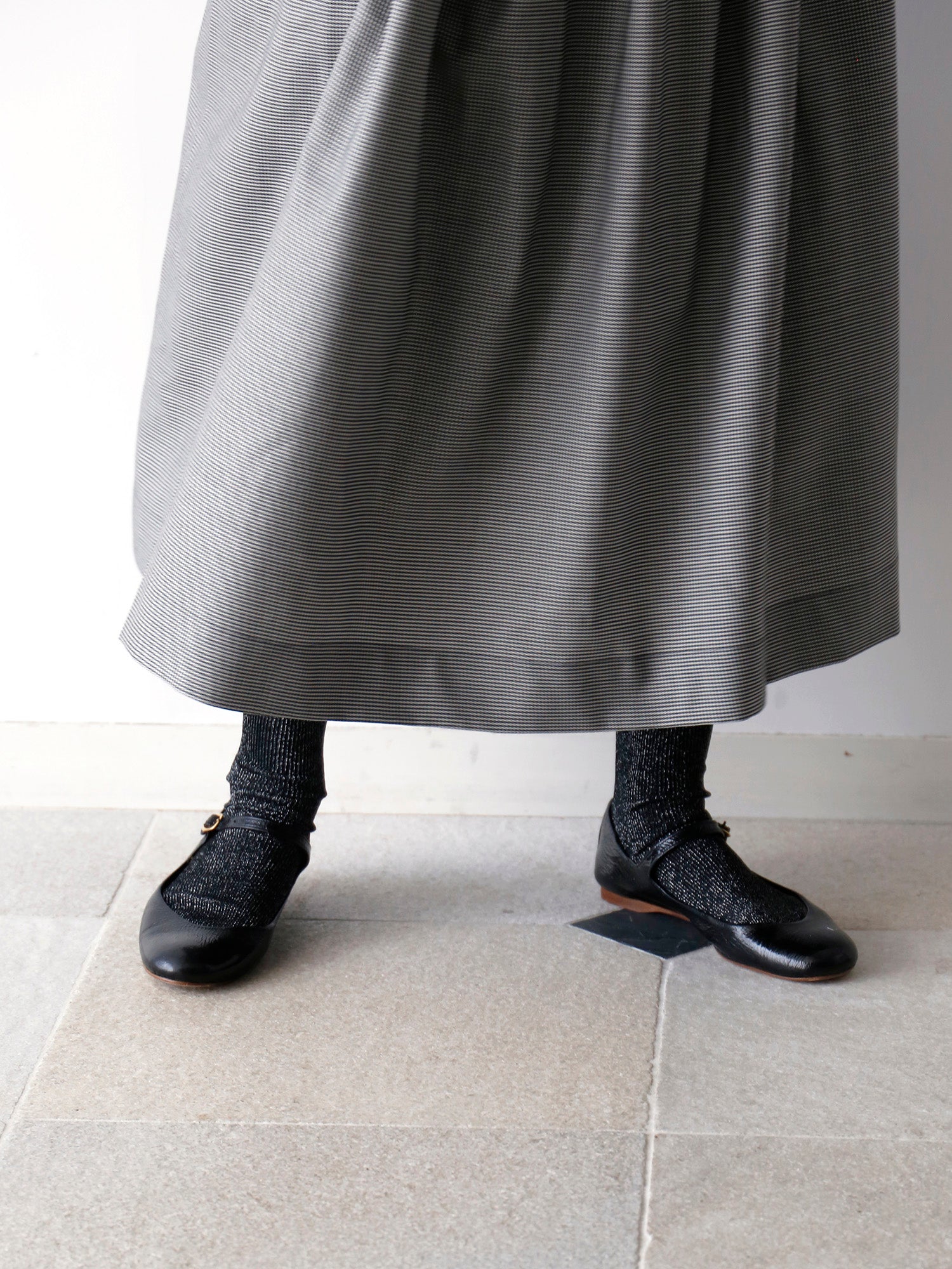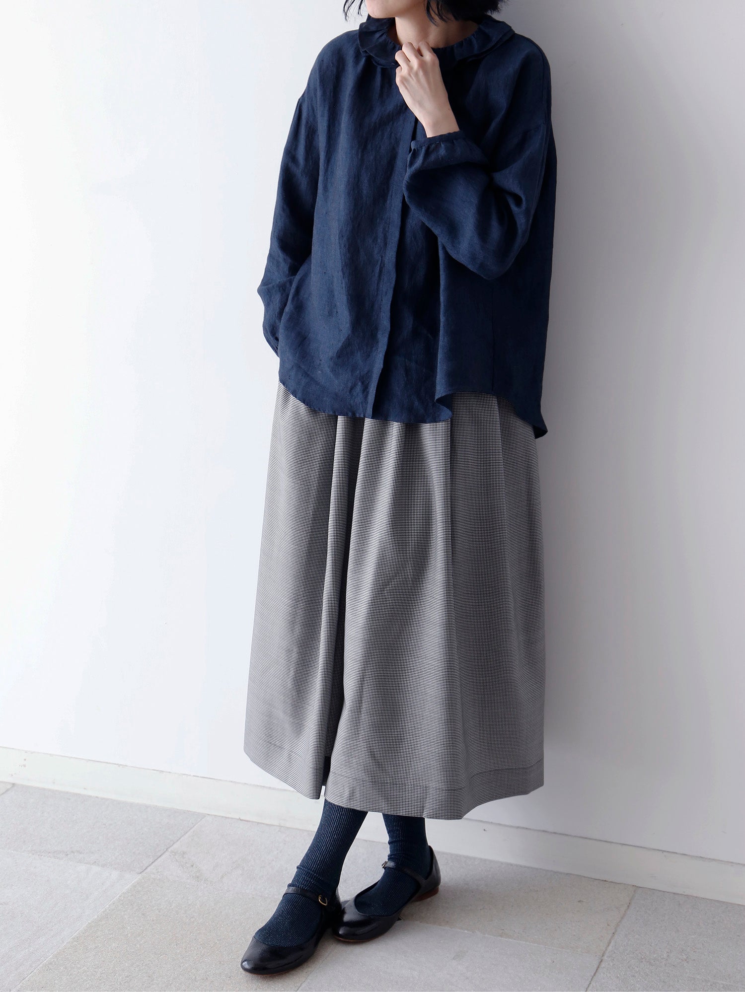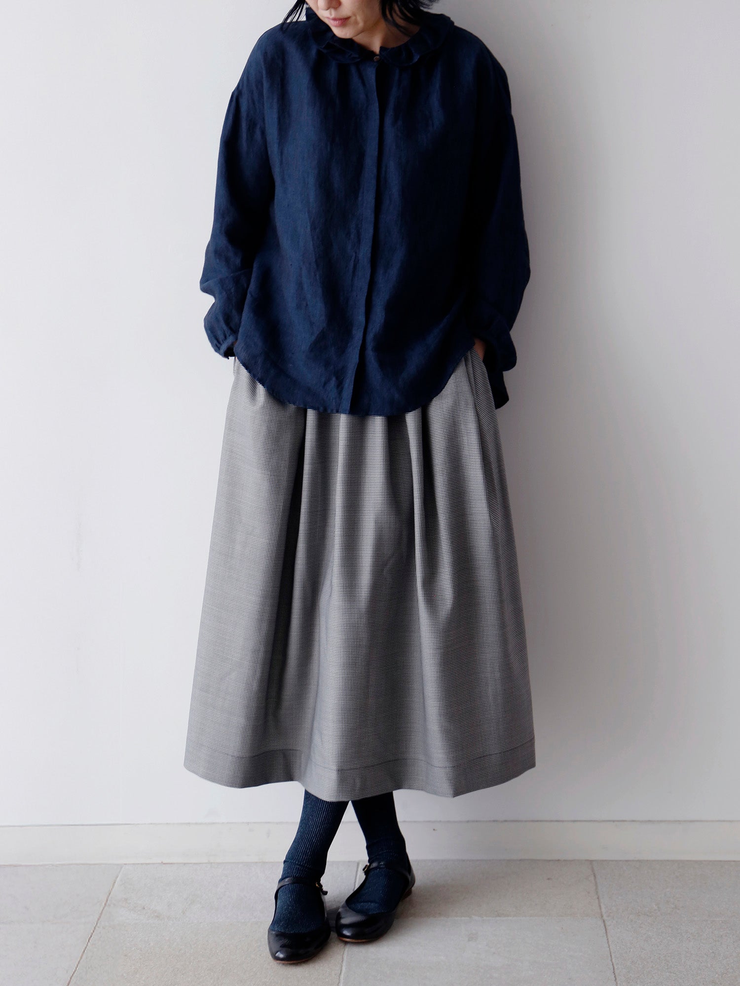 イタリア製ウールで仕立てた千鳥格子柄のスカート《エレノア》。細かな千鳥格子とタックギャザーが生み出す、やわらかなシルエットが魅力の一着です。