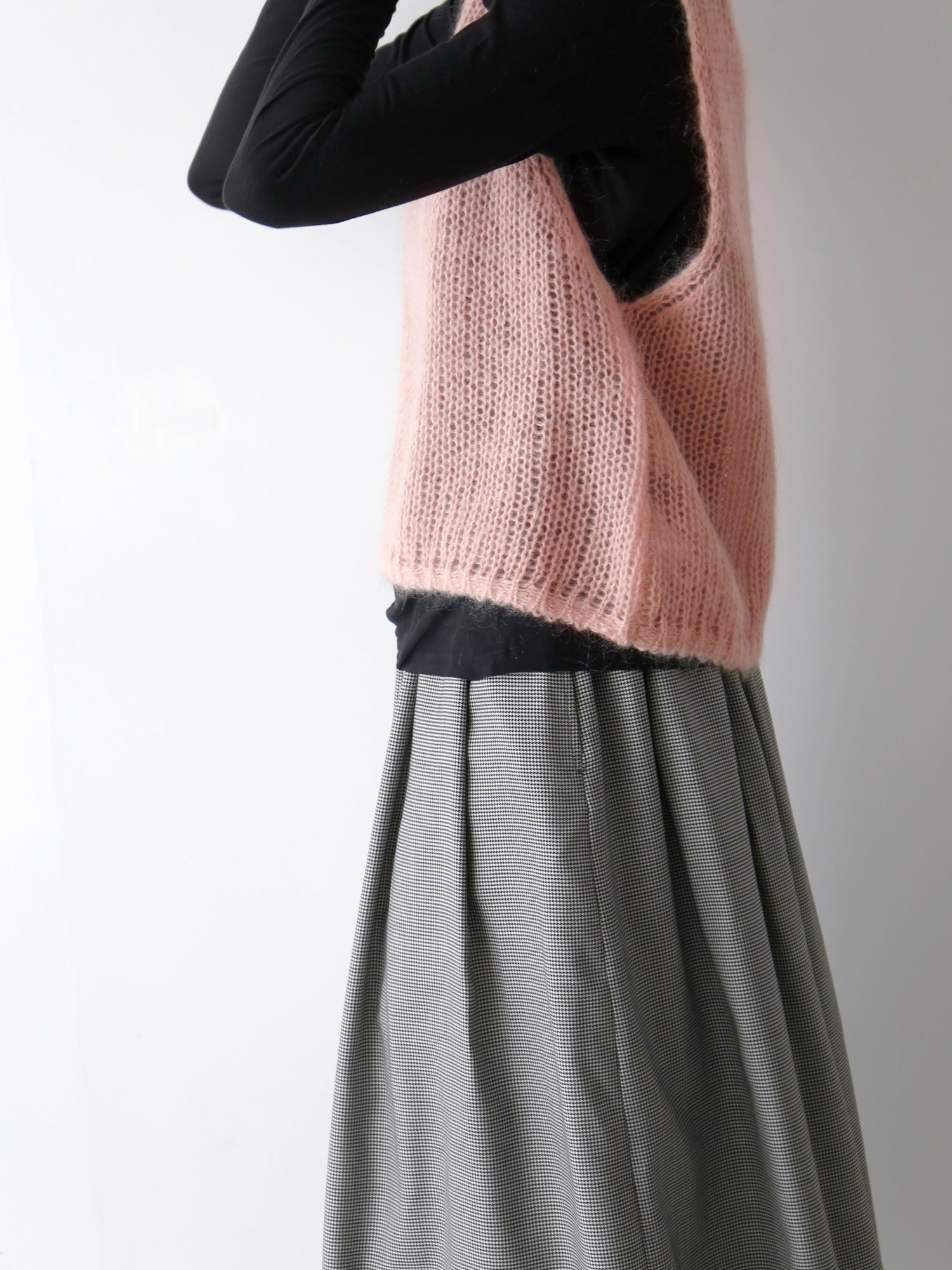 淡いピンクのモヘアベスト《ミュー》に、黒のタートルネックを重ねて。