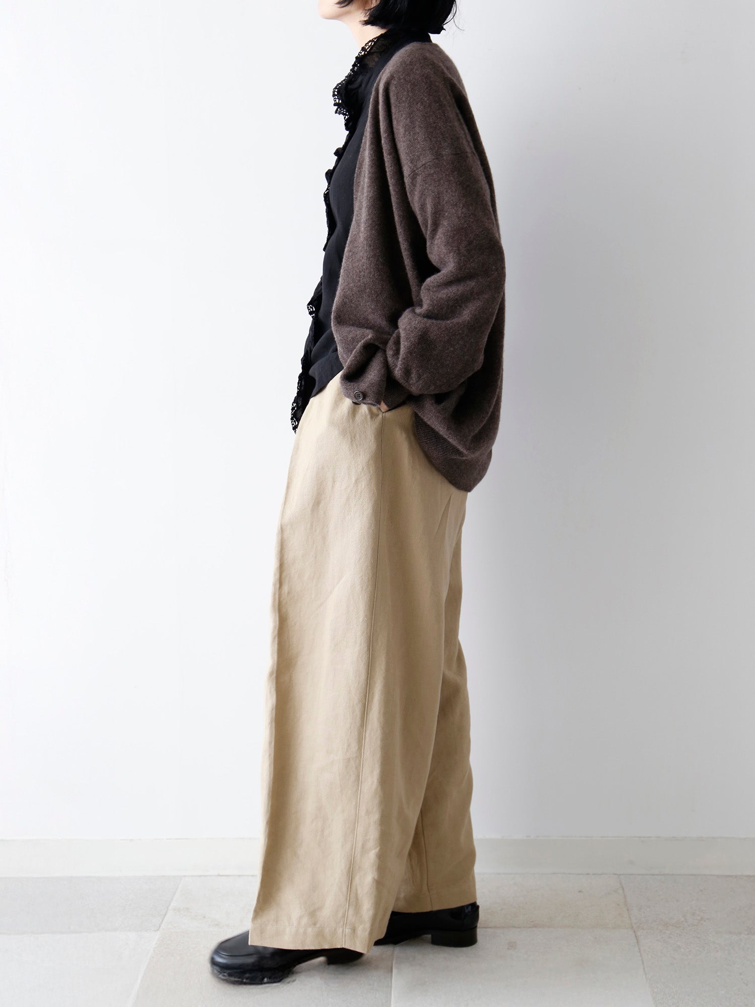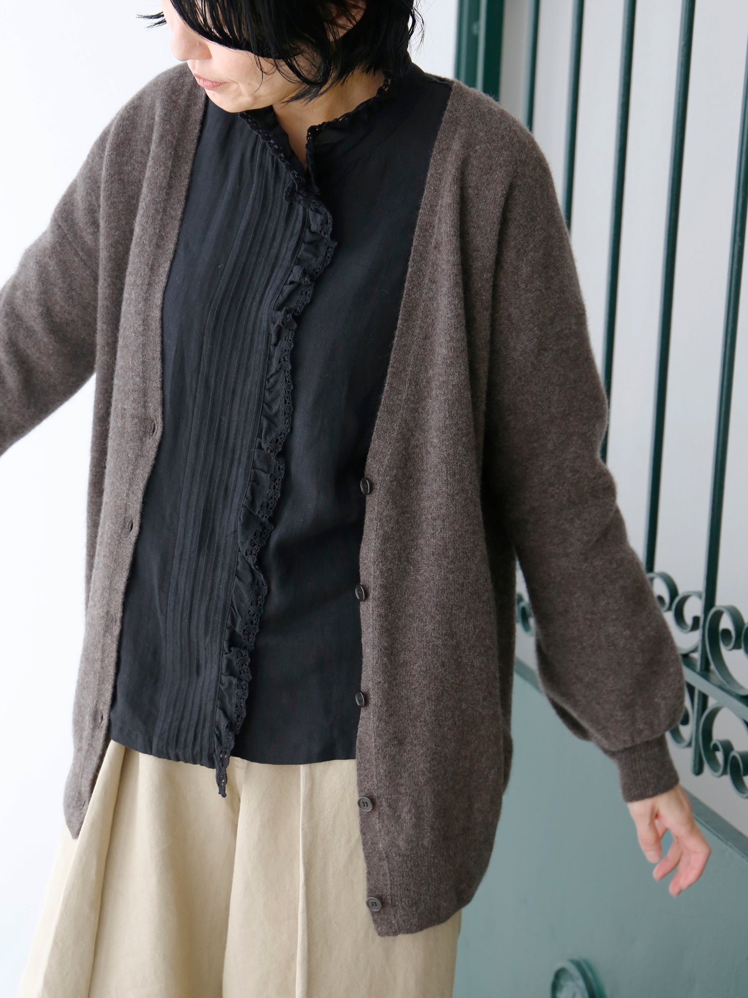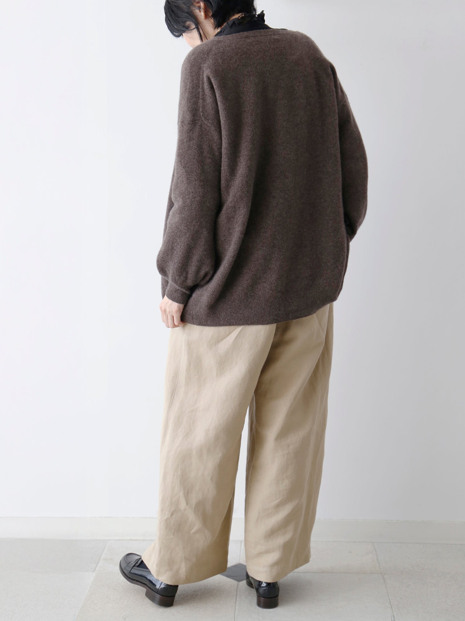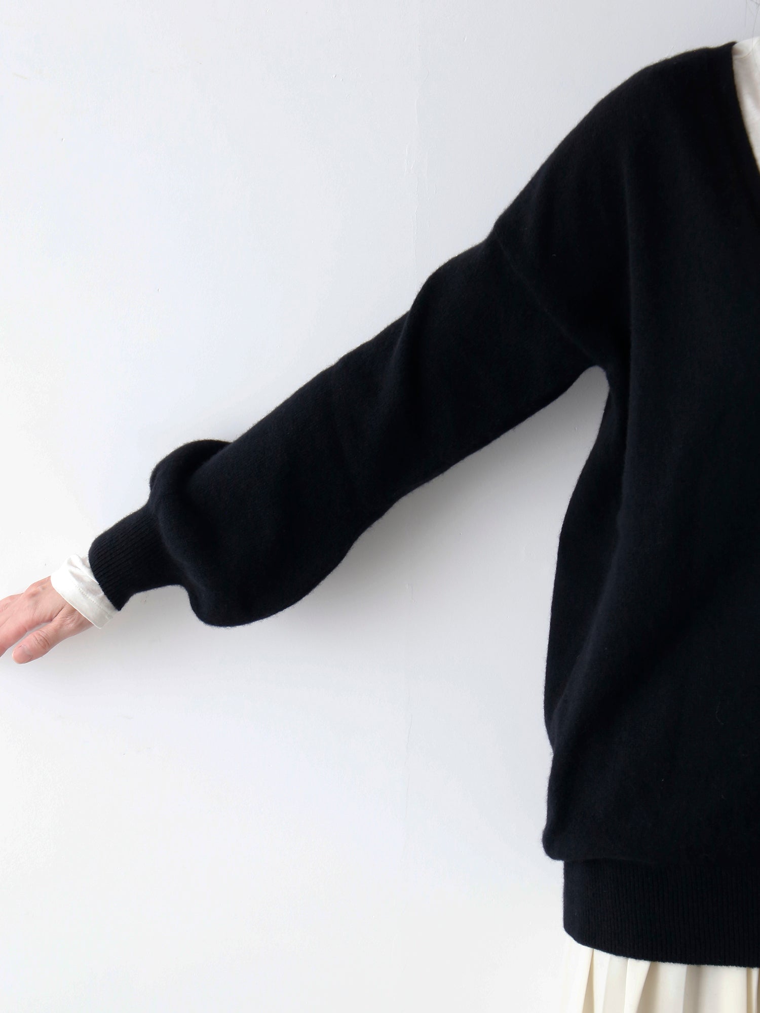 ドロップさせたショルダーラインからたっぷりとした袖。袖口は細めに仕立て、ふんわりとした袖のシルエットは女性らしさがでるところ。