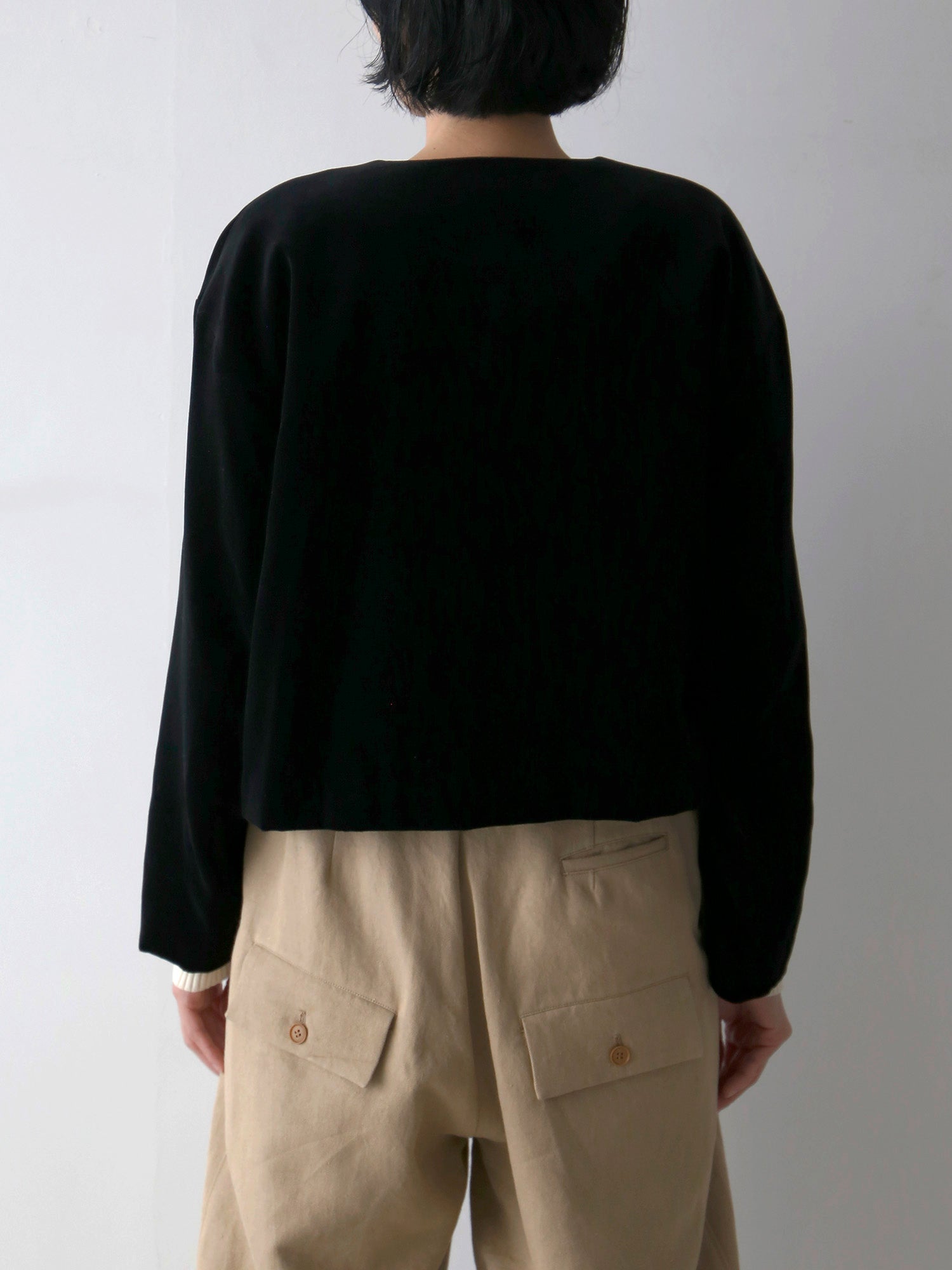 首まわりは、ノーカラーですっきりと。タートルネックやブラウスなど、衿もとを見せるアイテムとも好相性です。