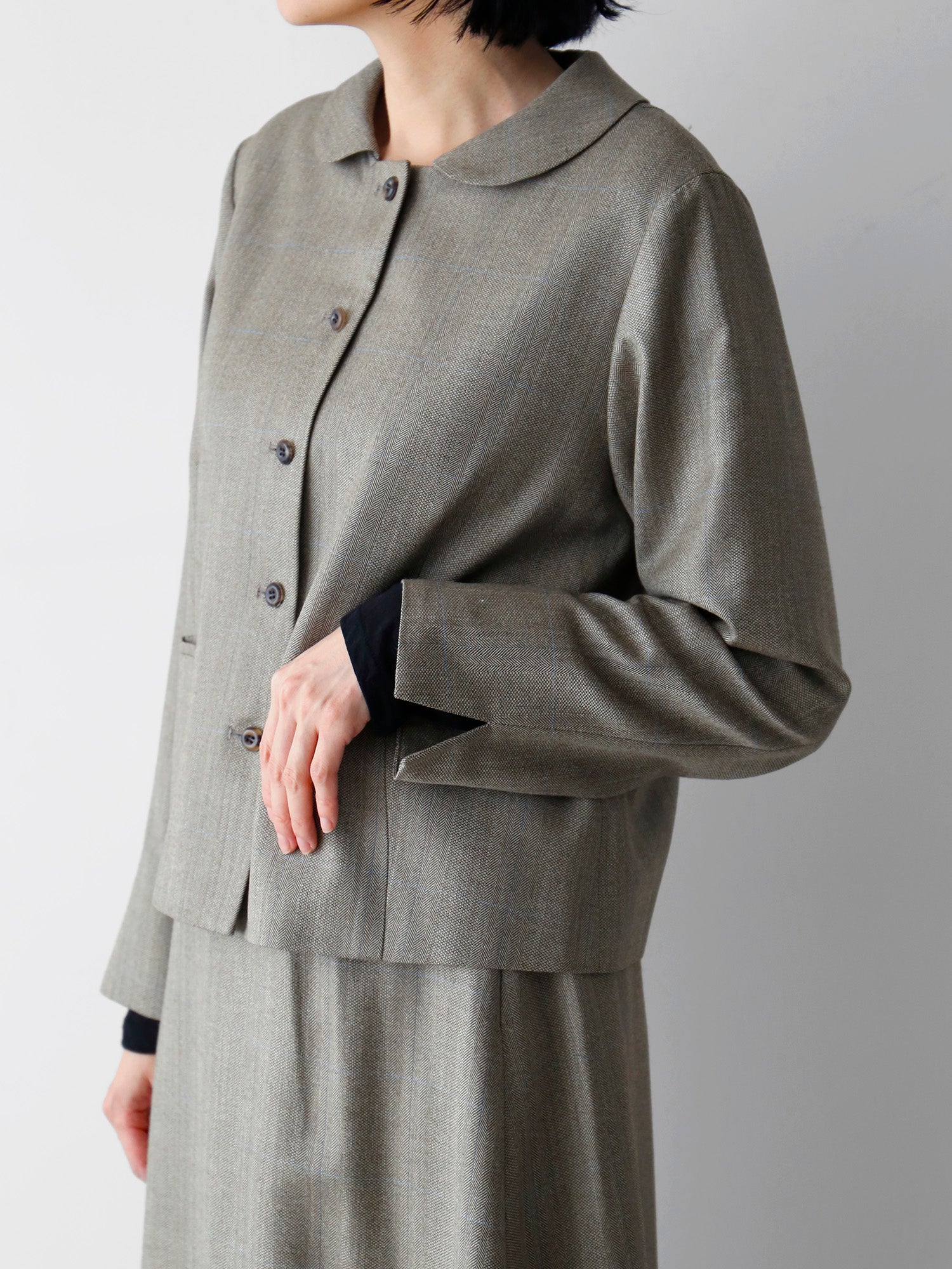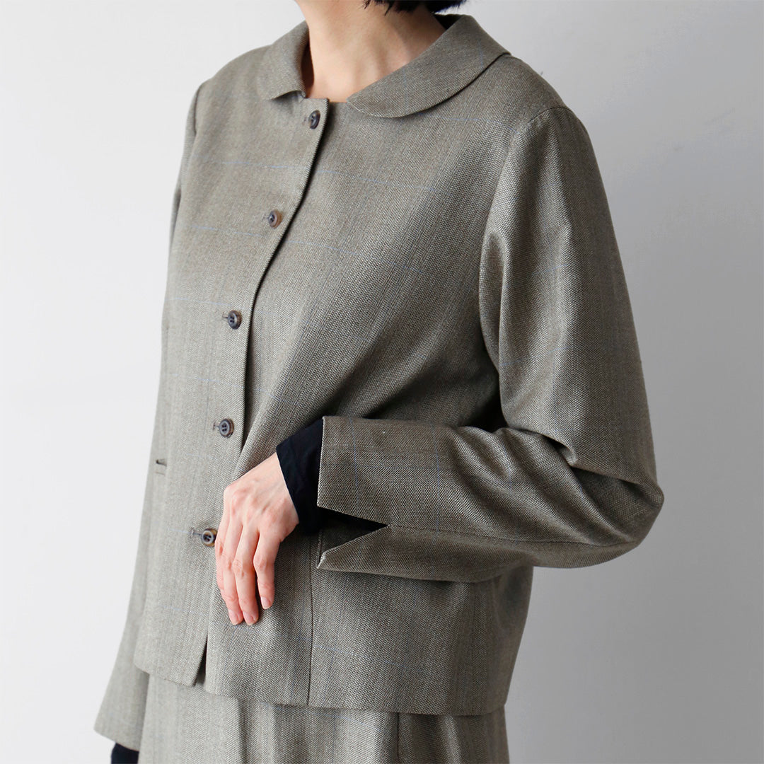 イタリア製のメンズの梳毛のスーツ地で仕立てた、襟越しを少し取ったフラットな丸襟が、フェミニンでクラシックなジャケット。