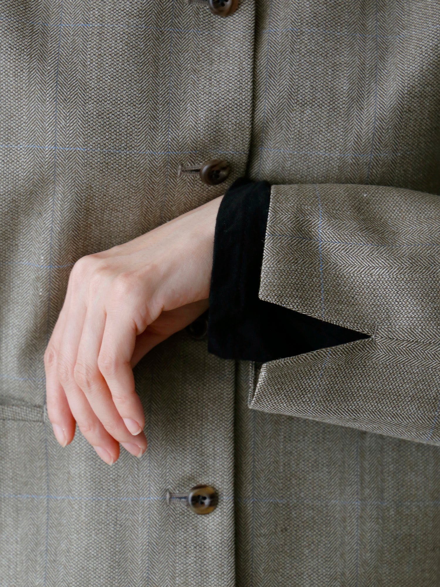 立体的な織り模様と細いブルーチェックが品よく調和し、奥行きのある表情を添えています。
