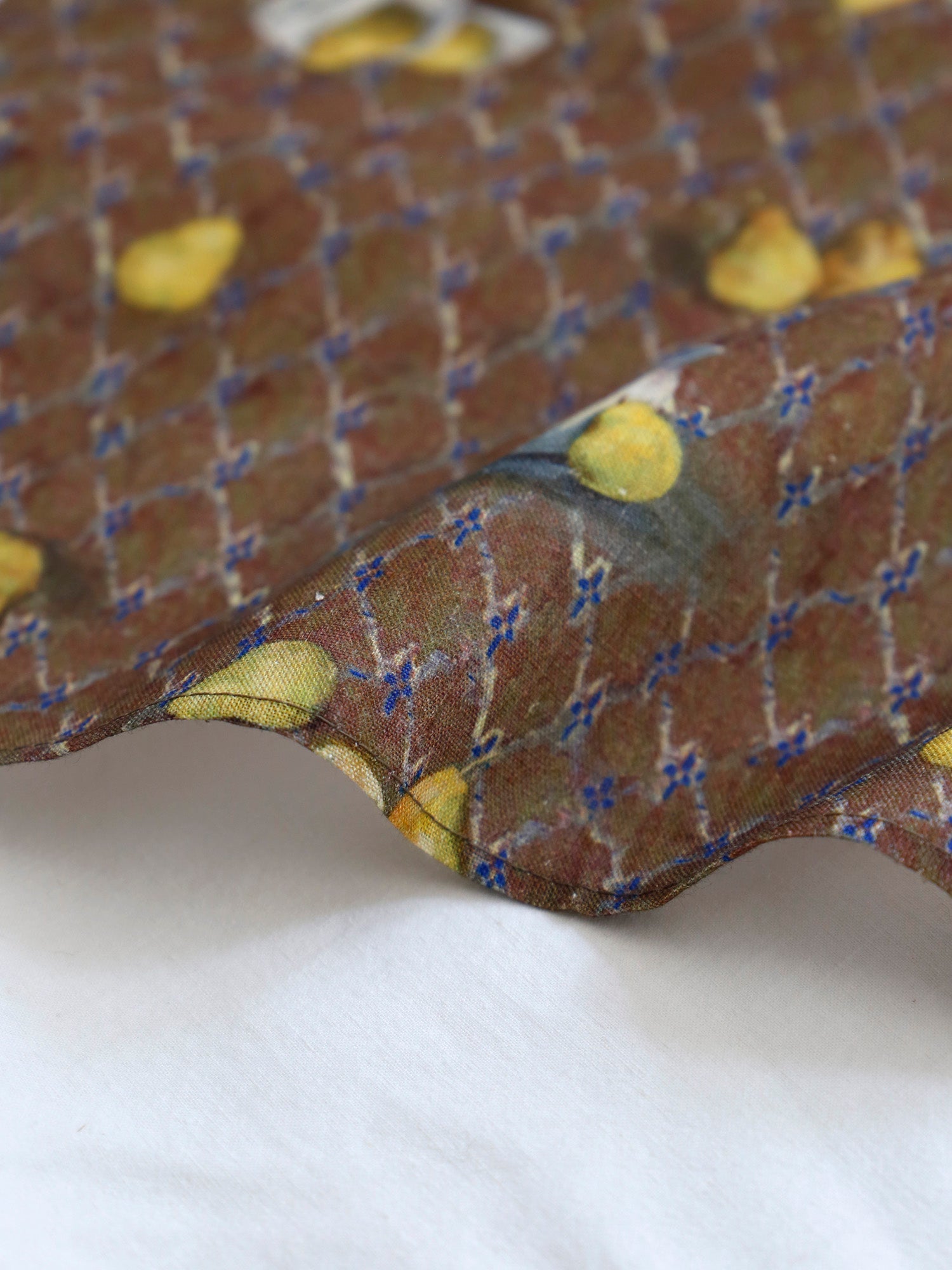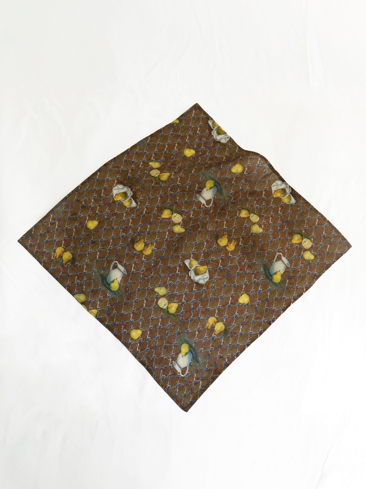 秋冬らしいあたたかみのあるテラコッタ色に乳白色の陶器、熟した西洋梨のアクセント。手描きならではの奥深い色彩だからこそ纏える大人のプリント地です。