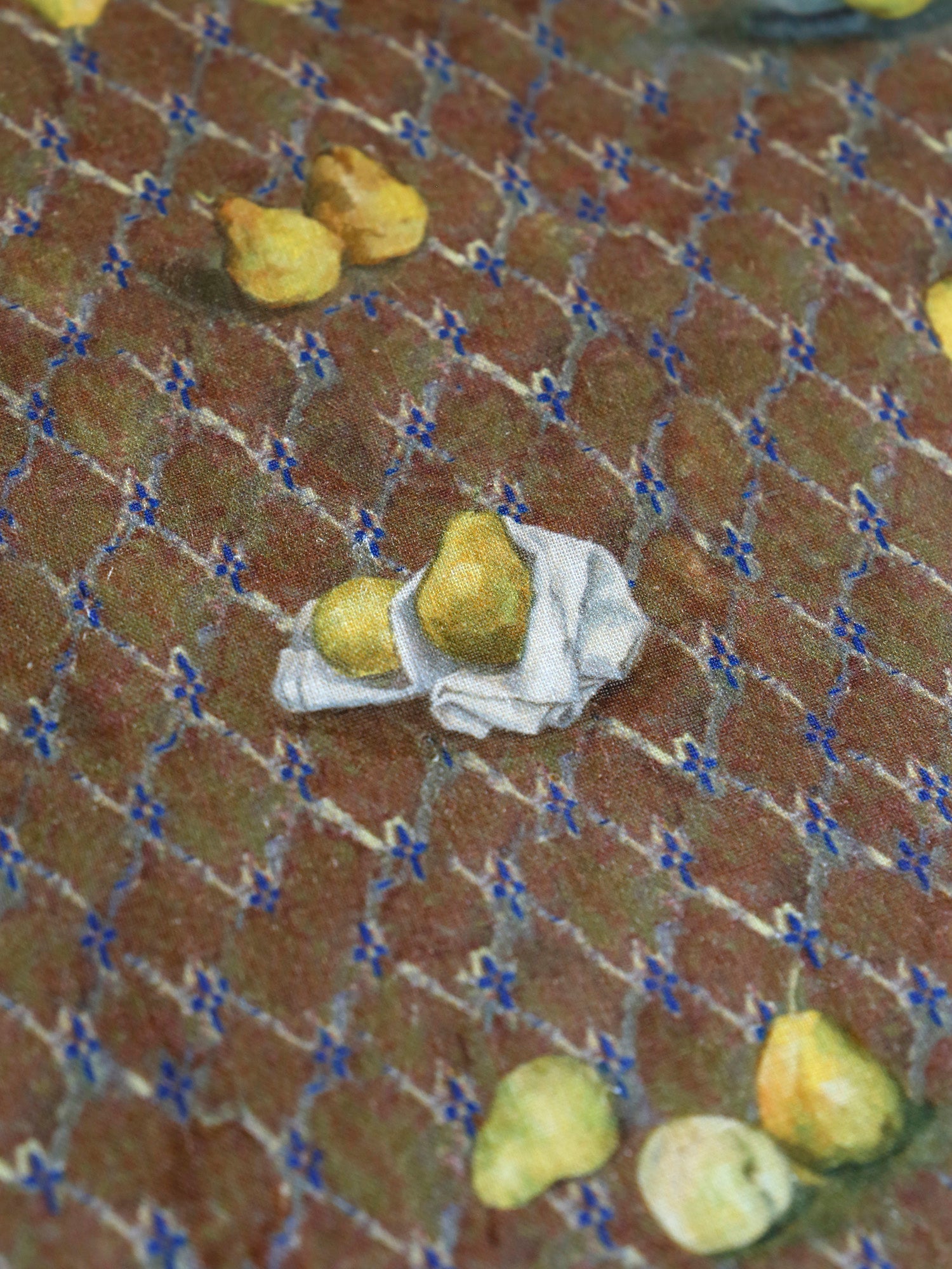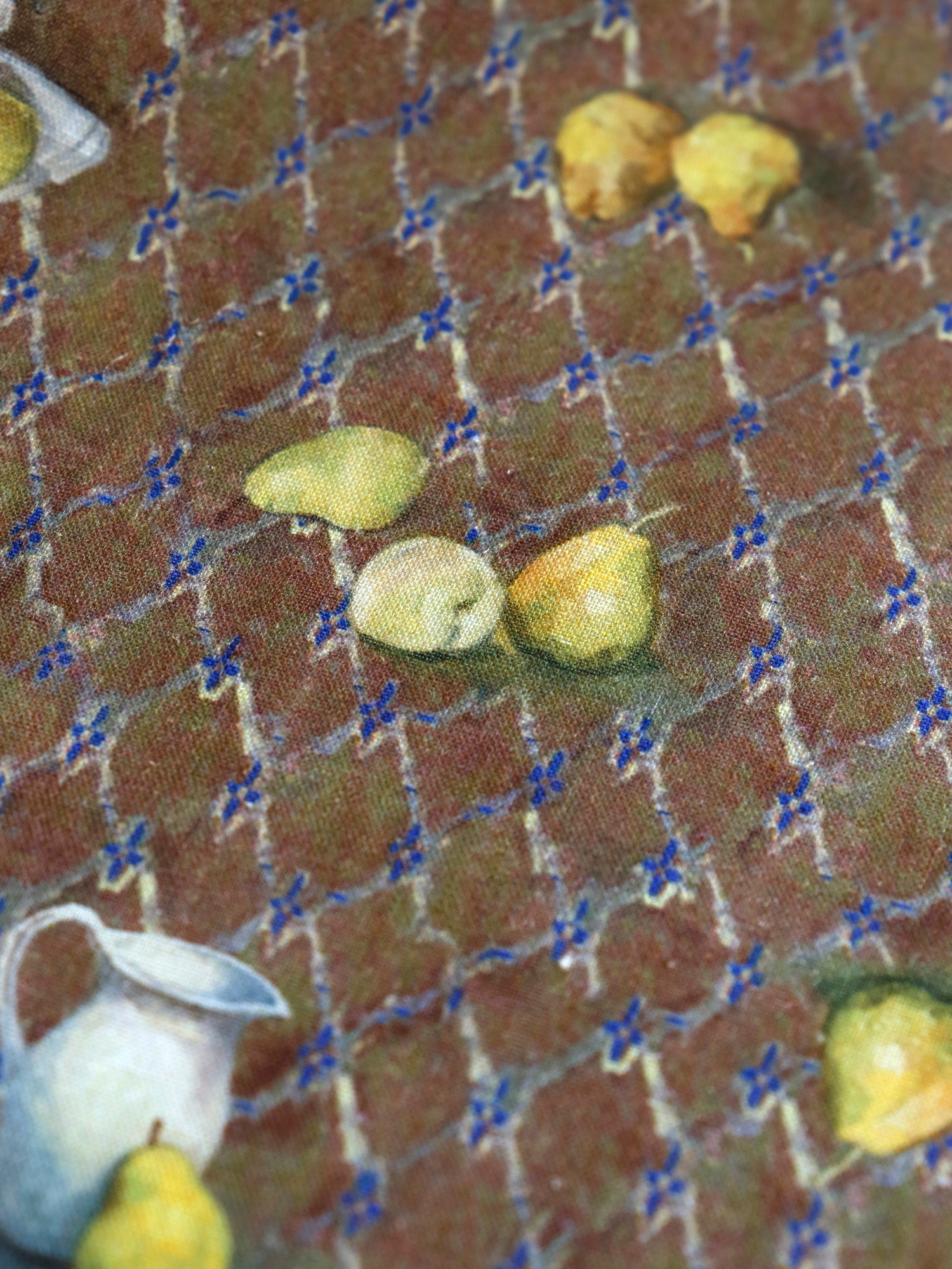 2025AWオリジナルプリント柄「Les Poires」は、印象派の静物画をイメージし、西洋梨をはじめ質感の異なる静物を柄に描きおこしました。