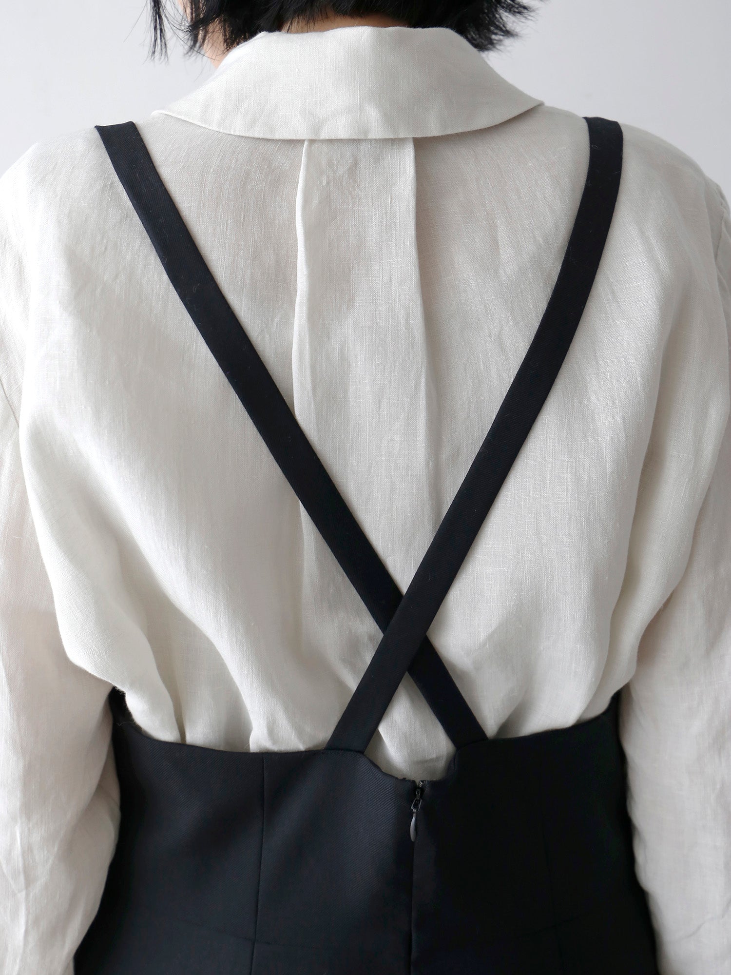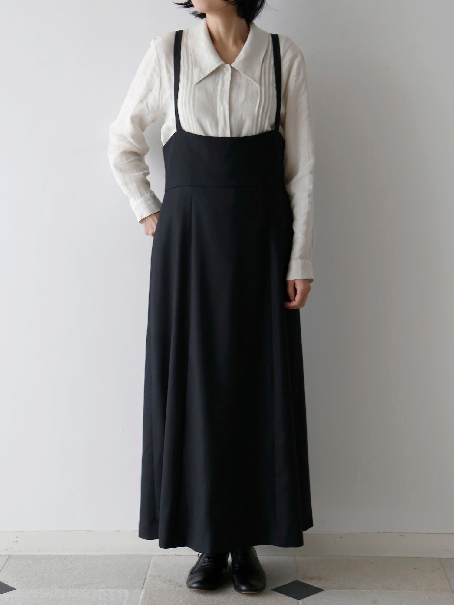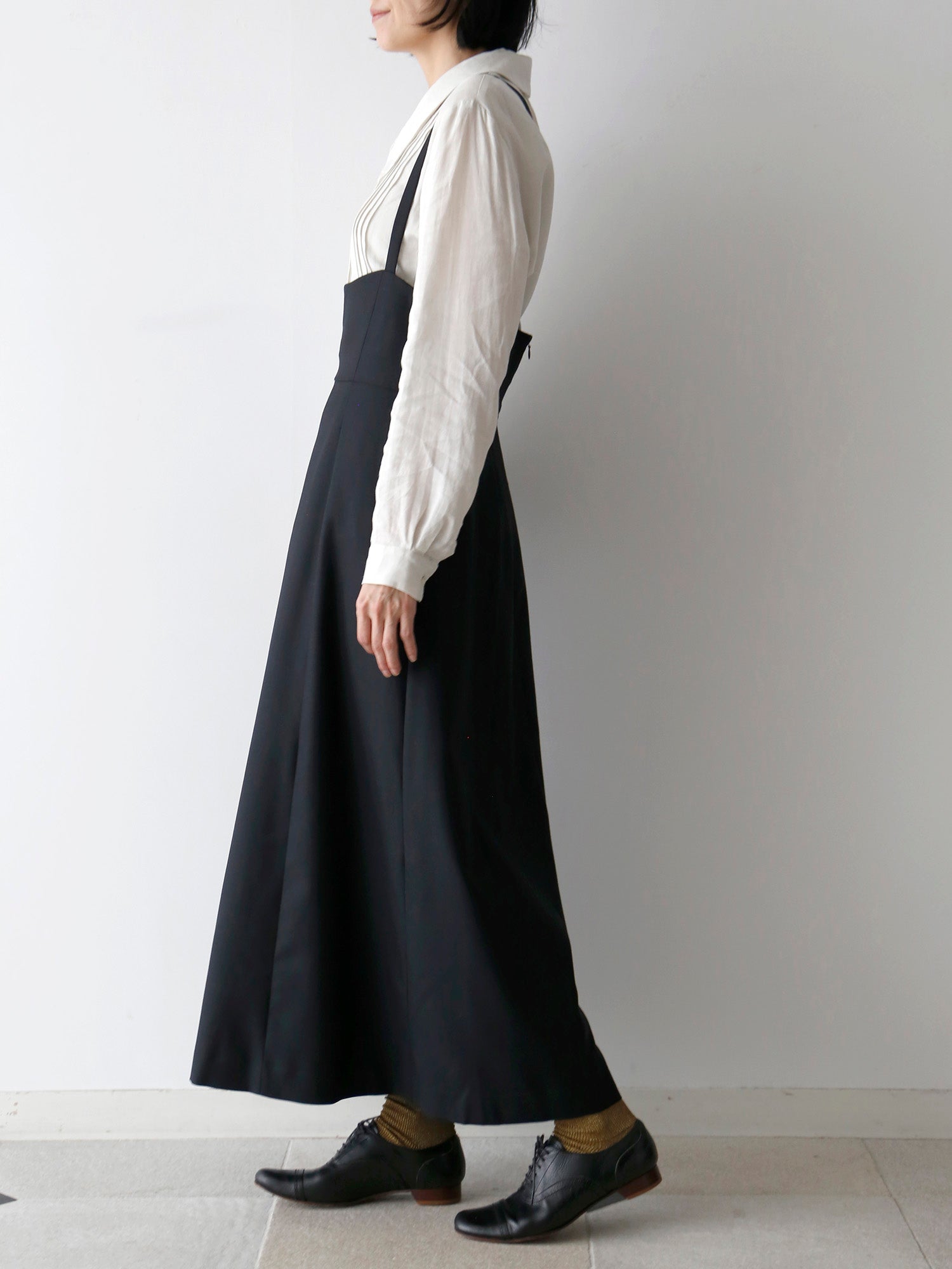 ヨーク部分のゆるやかな曲線が体に自然に沿い、立体的で美しいシルエットをつくります。一般的な胸当てのあるジャンパースカートに比べて抜け感があり、より洗練された大人の印象に。