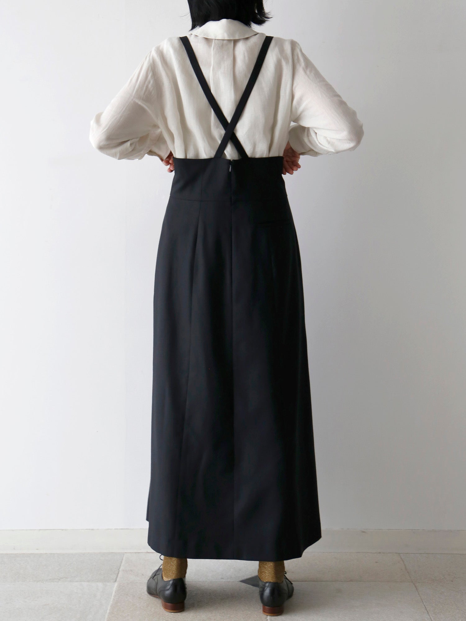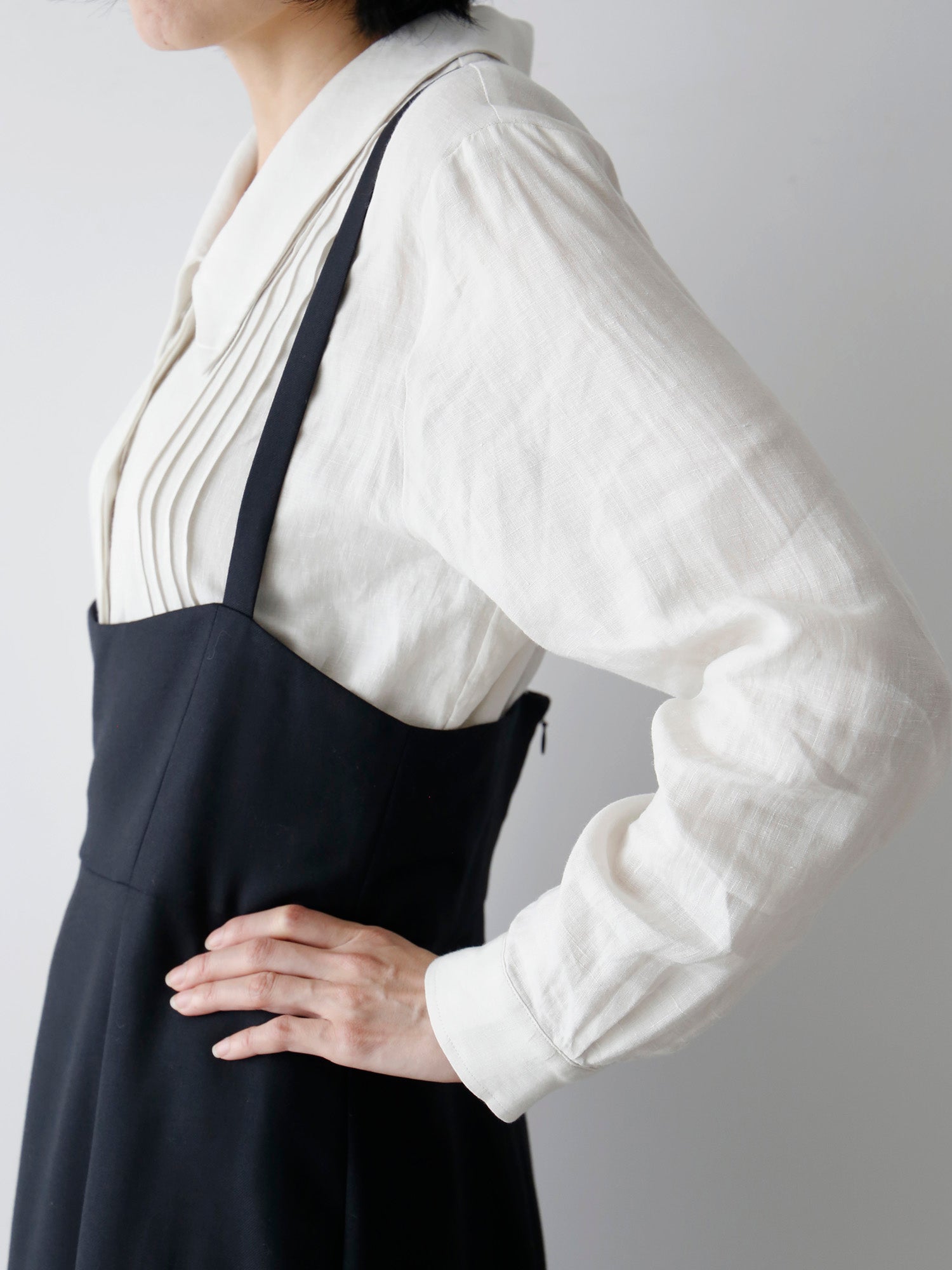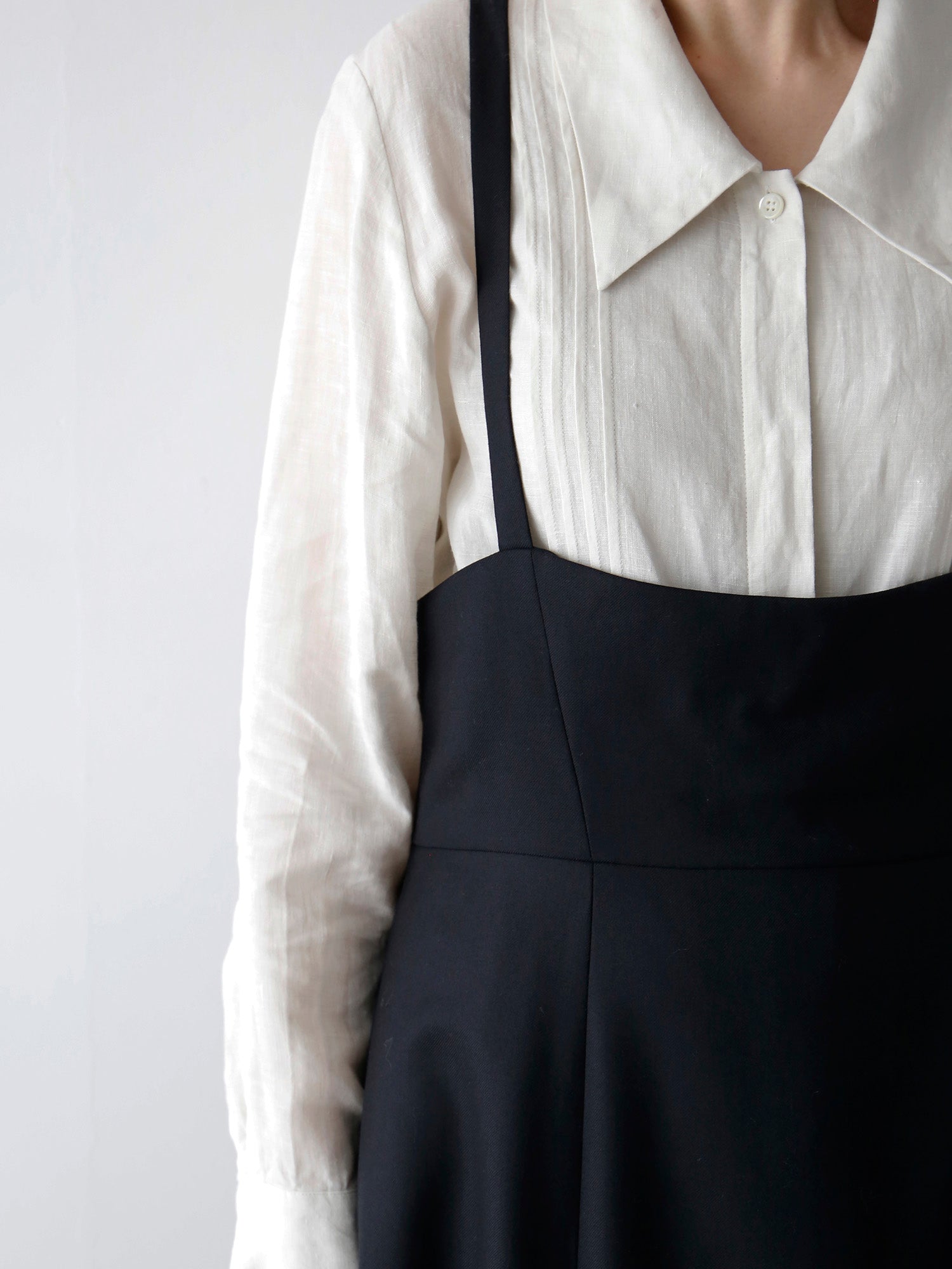 ヨーク部分のゆるやかな曲線が体に自然に沿い、立体的で美しいシルエットをつくります。一般的な胸当てのあるジャンパースカートに比べて抜け感があり、より洗練された大人の印象に。