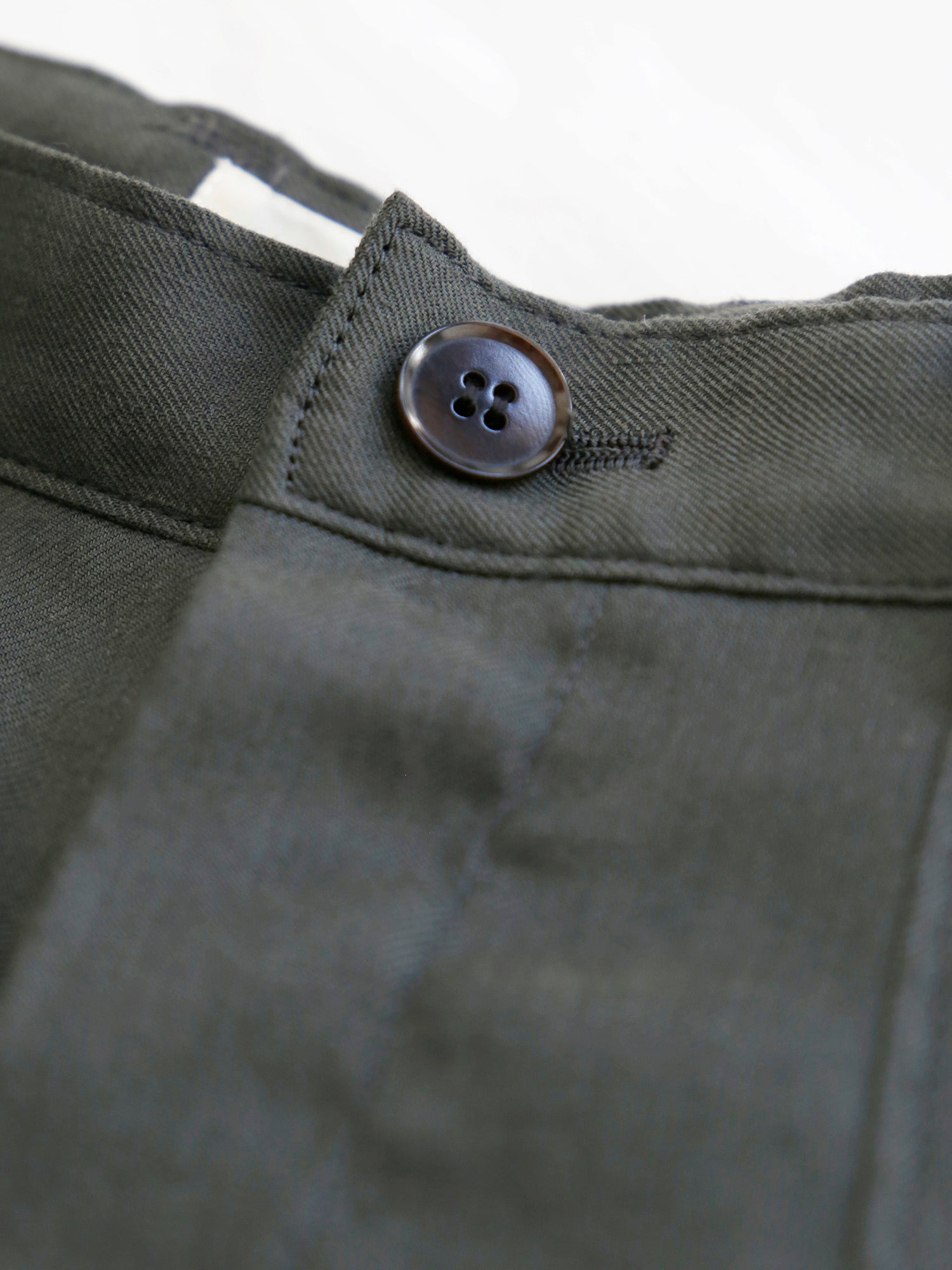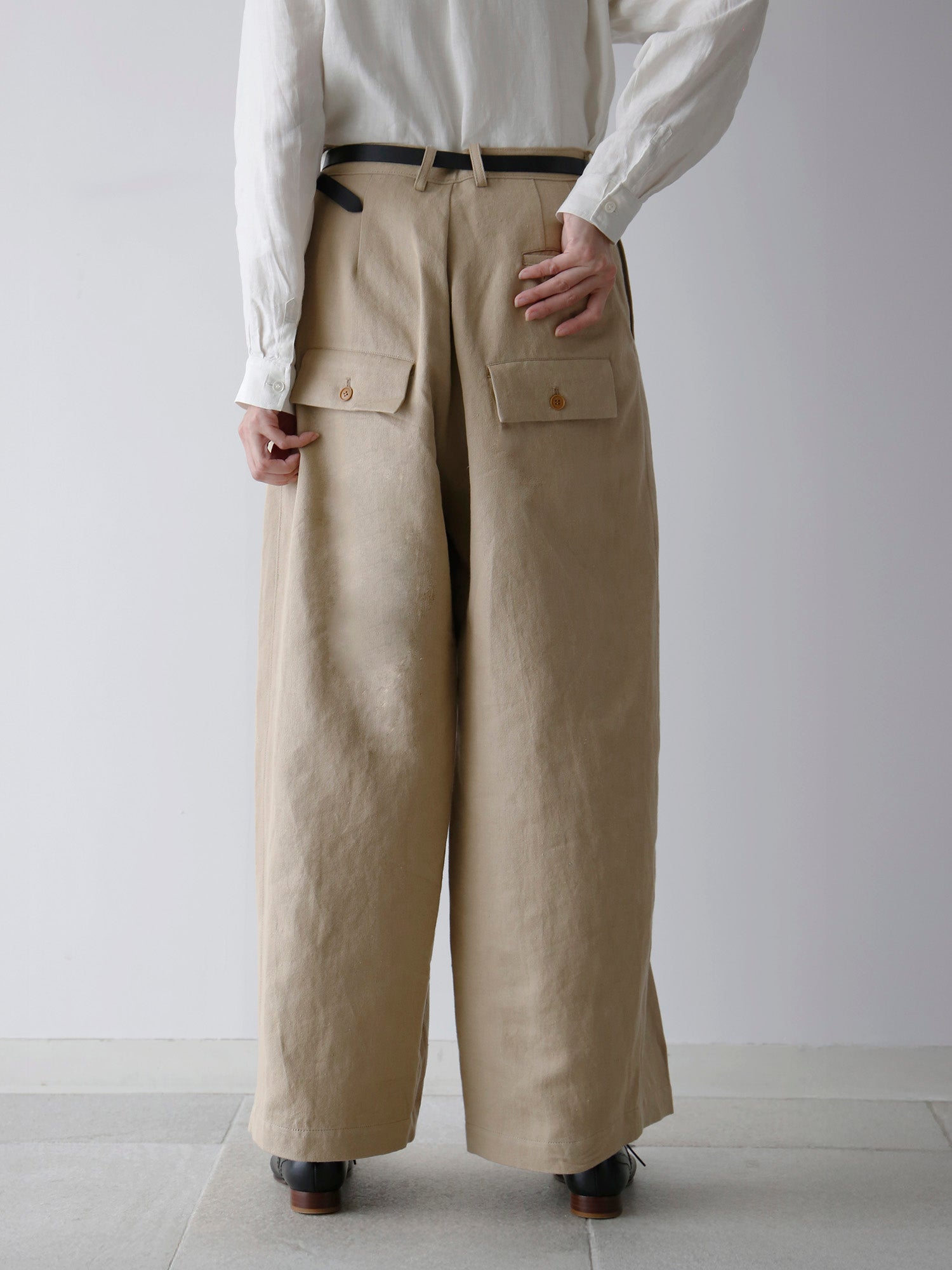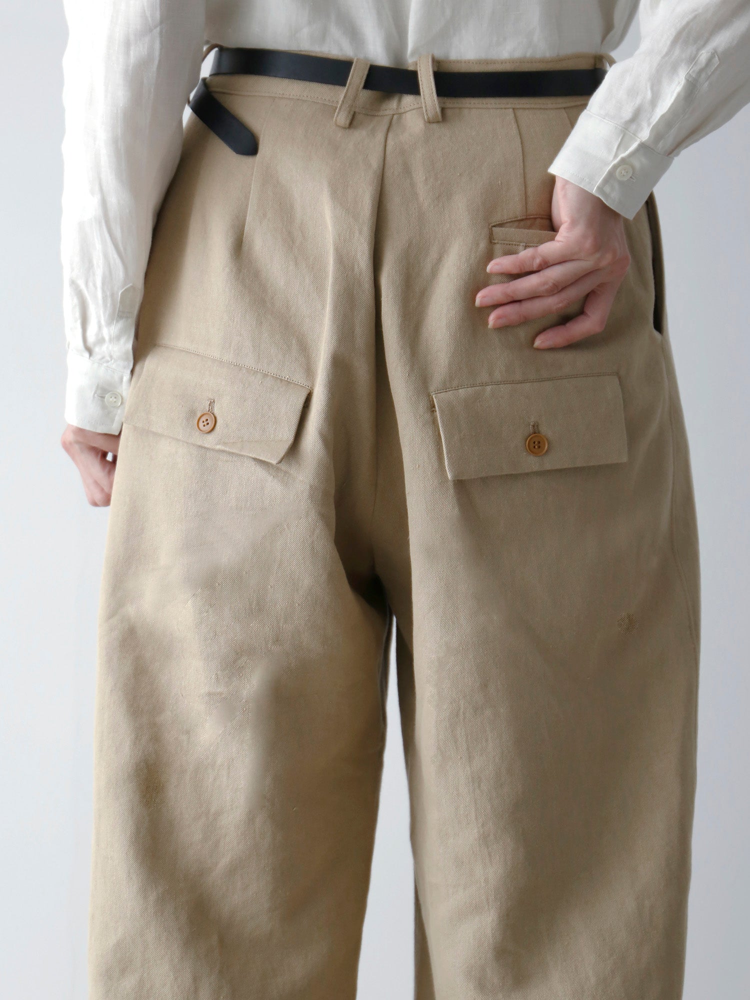 両サイドにスラッシュポケット、後ろに片玉縁ポケットとフラップ付きポケットを配置。実用性を備えながら、後ろ姿のアクセントにもなります。