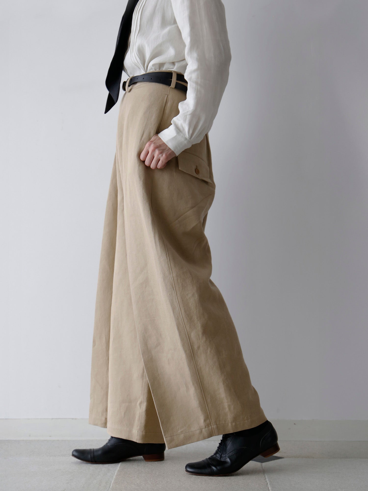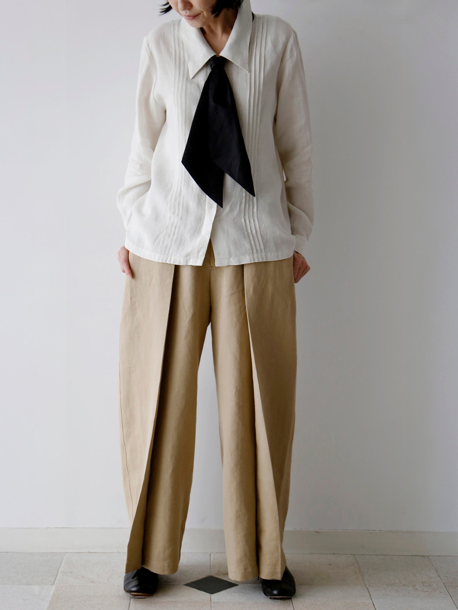 タックが生み出す立体的なフォルムで、裾に向かって広がるラインが美しい。ダーツを入れてウエスト周りはすっきり、裾はゆとりをもたせて、軽やかなシルエットに仕上がりました。