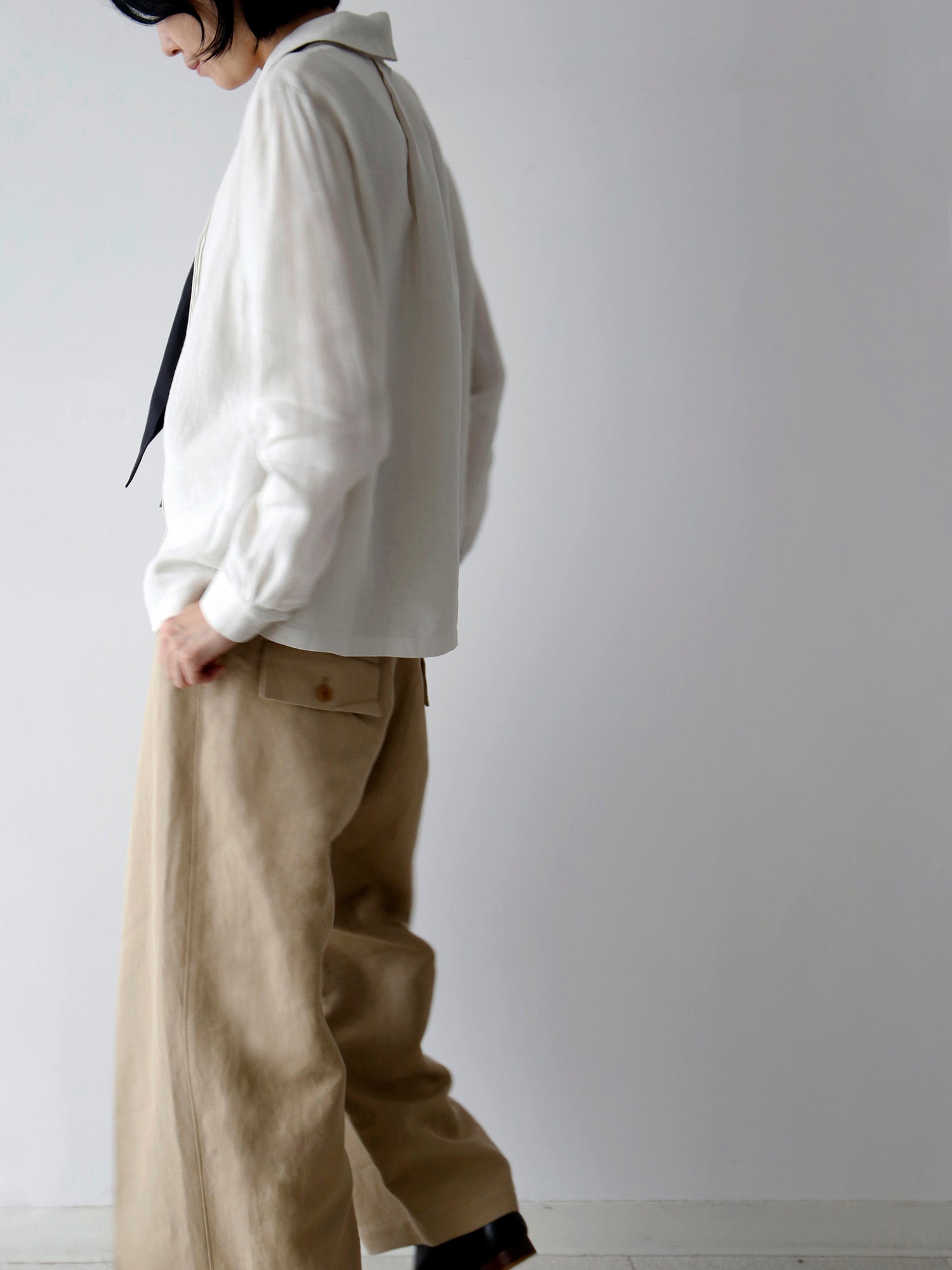 カラーは、ベージュとアルドワーズの2色。ベージュは、尾州のリネンコットンの綾織り、ほどよいハリとナチュラルな風合いが魅力です。