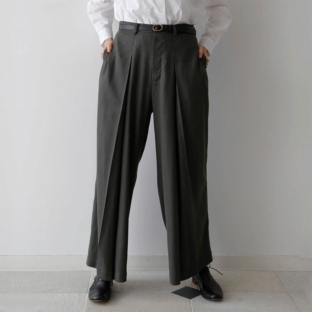 タックが生み出す立体的なフォルムで、裾に向かって広がるラインが美しい。ダーツを入れてウエスト周りはすっきり、裾はゆとりをもたせて、軽やかなシルエットに仕上がりました。