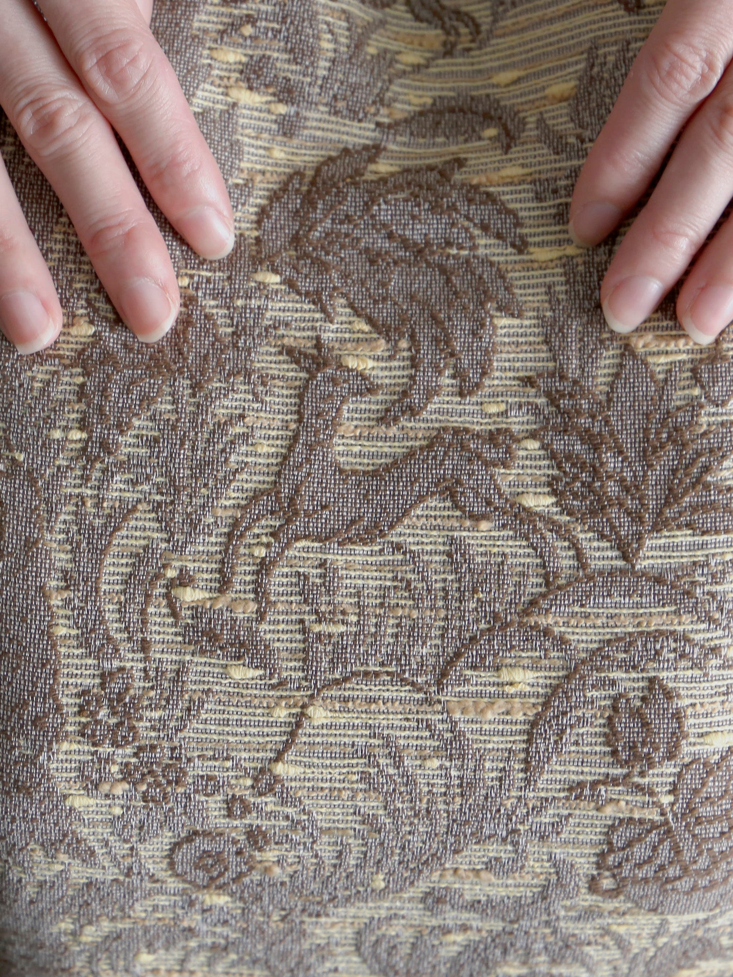 緻密で美しい織り模様の中には、よく見ると鹿、うさぎ、豹、トカゲ、鳥の5種類の動物たちが隠れています。そのチャーミングなモチーフが、大人の遊び心をくすぐります。