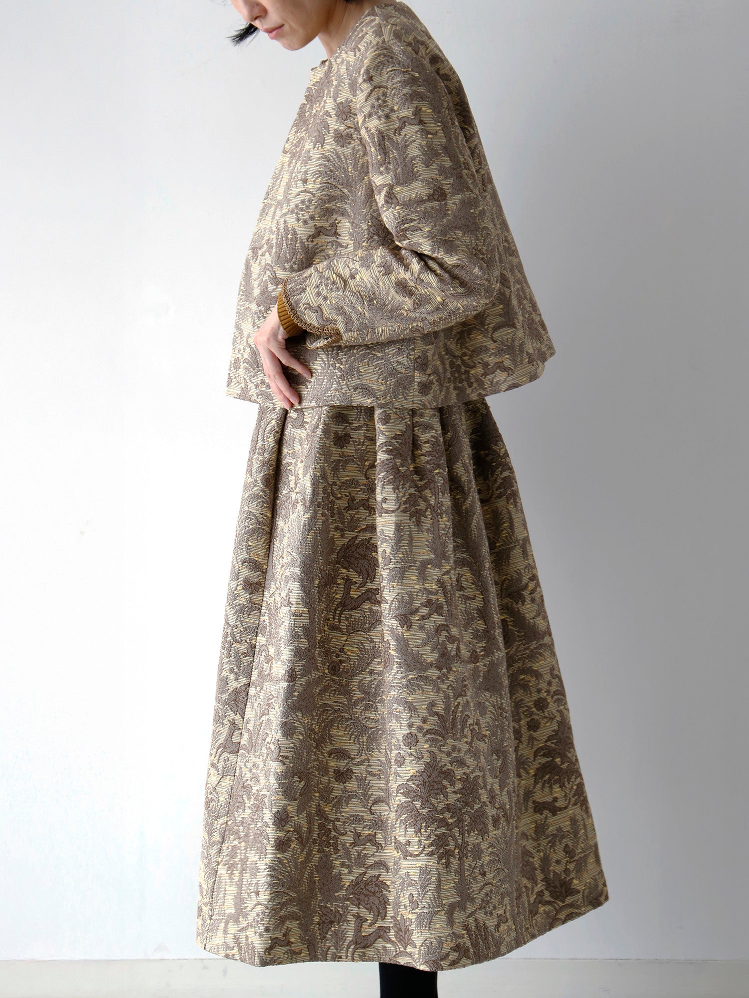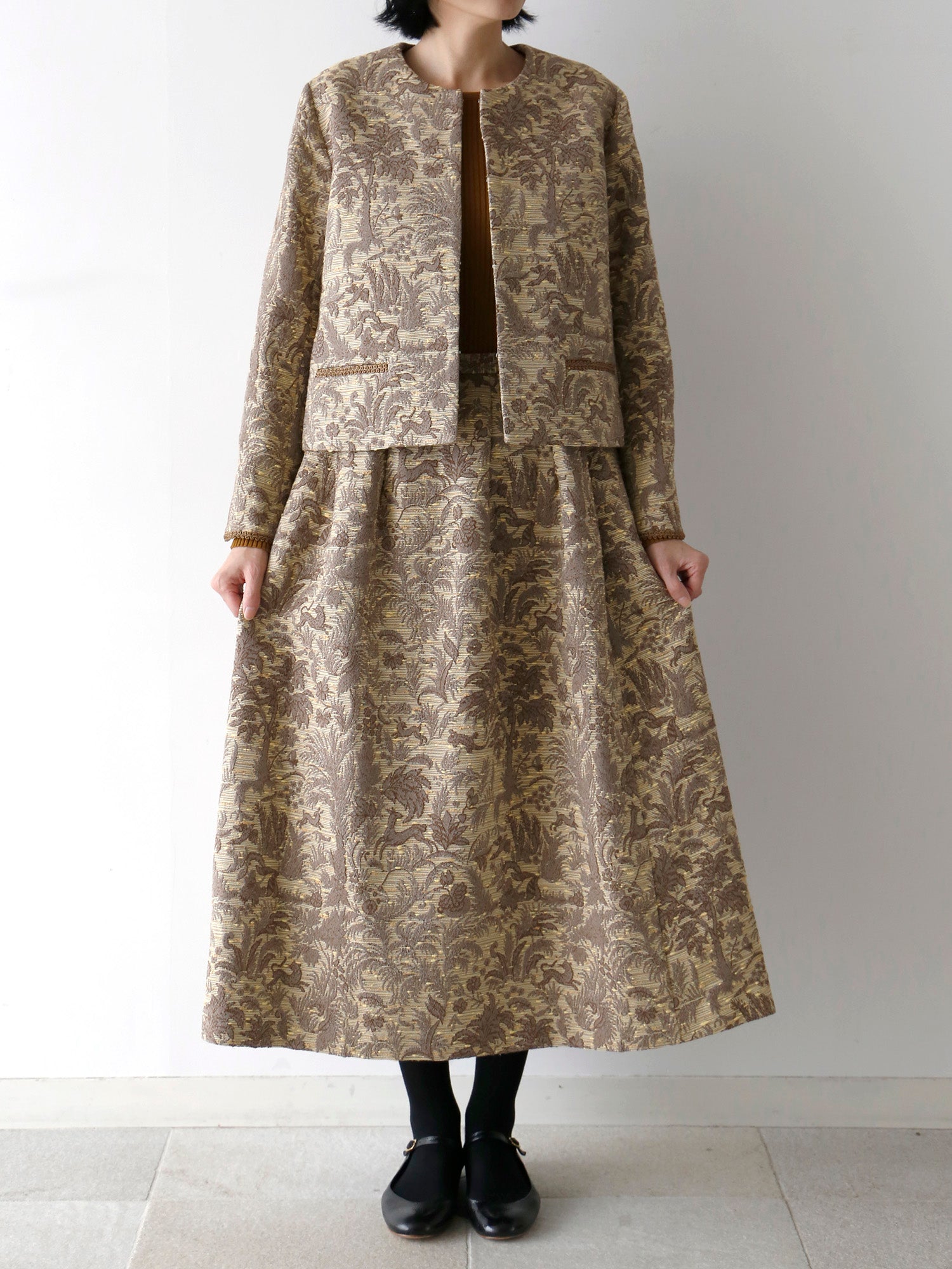 同生地のスカート「ニルデ」と合わせれば、優雅なセットアップスタイルが完成。食事会やセミフォーマルな場など、華やかなシーンにも活躍します。
