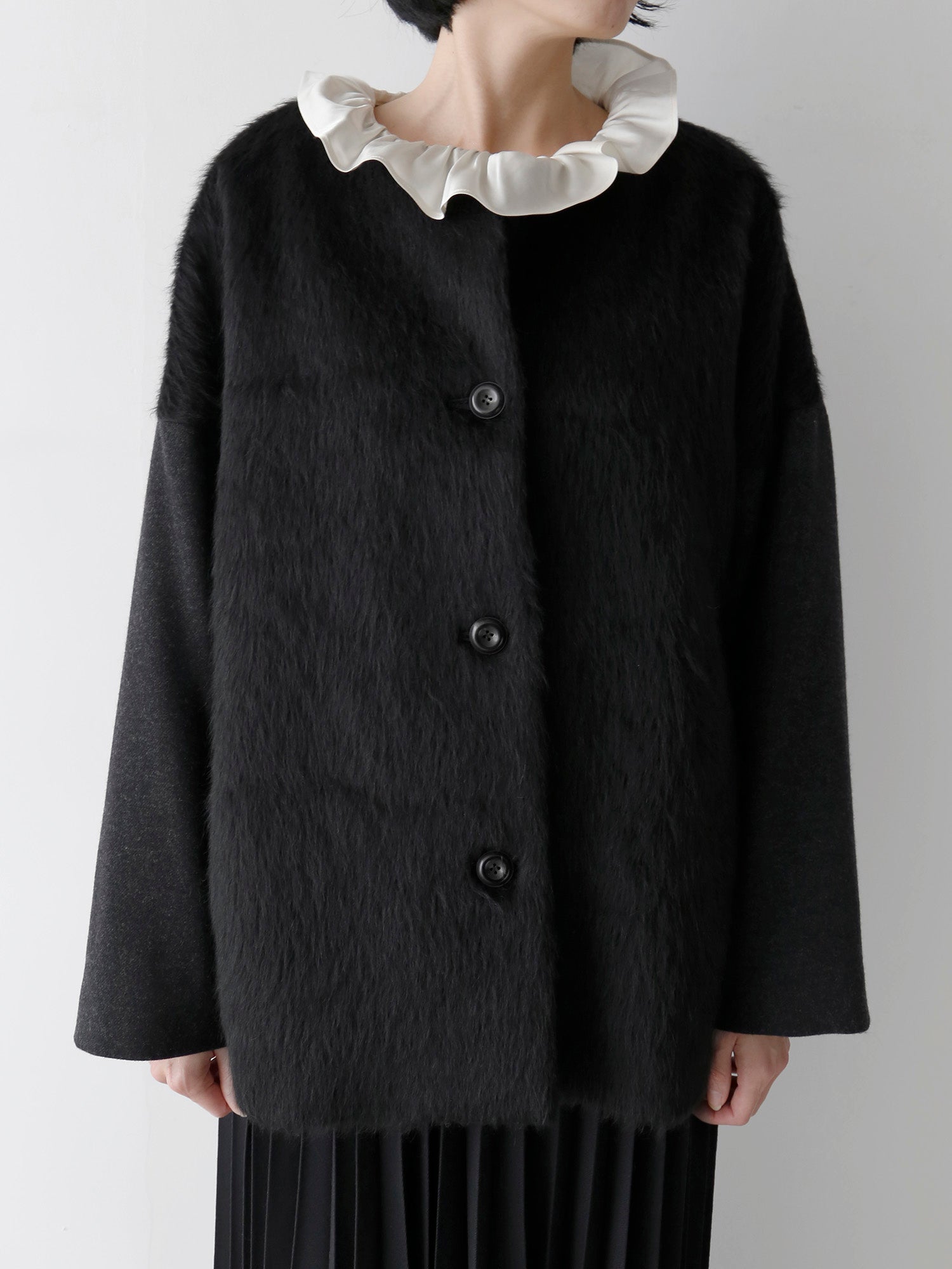 立体的に仕立てたフリルカラーが顔まわりに華やかさを添えます。一枚で着ても、ニットやベストから覗かせるレイヤードスタイルでも、美しい存在感に。