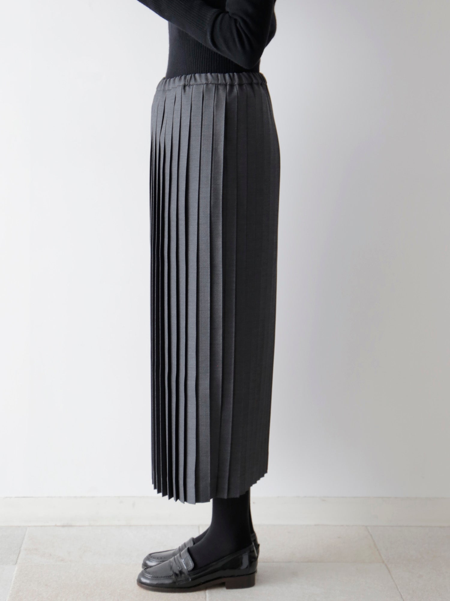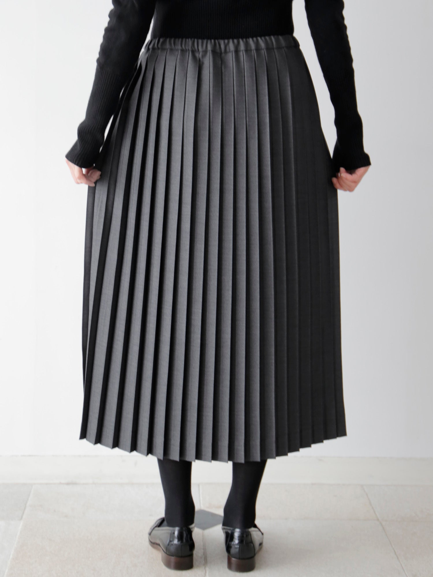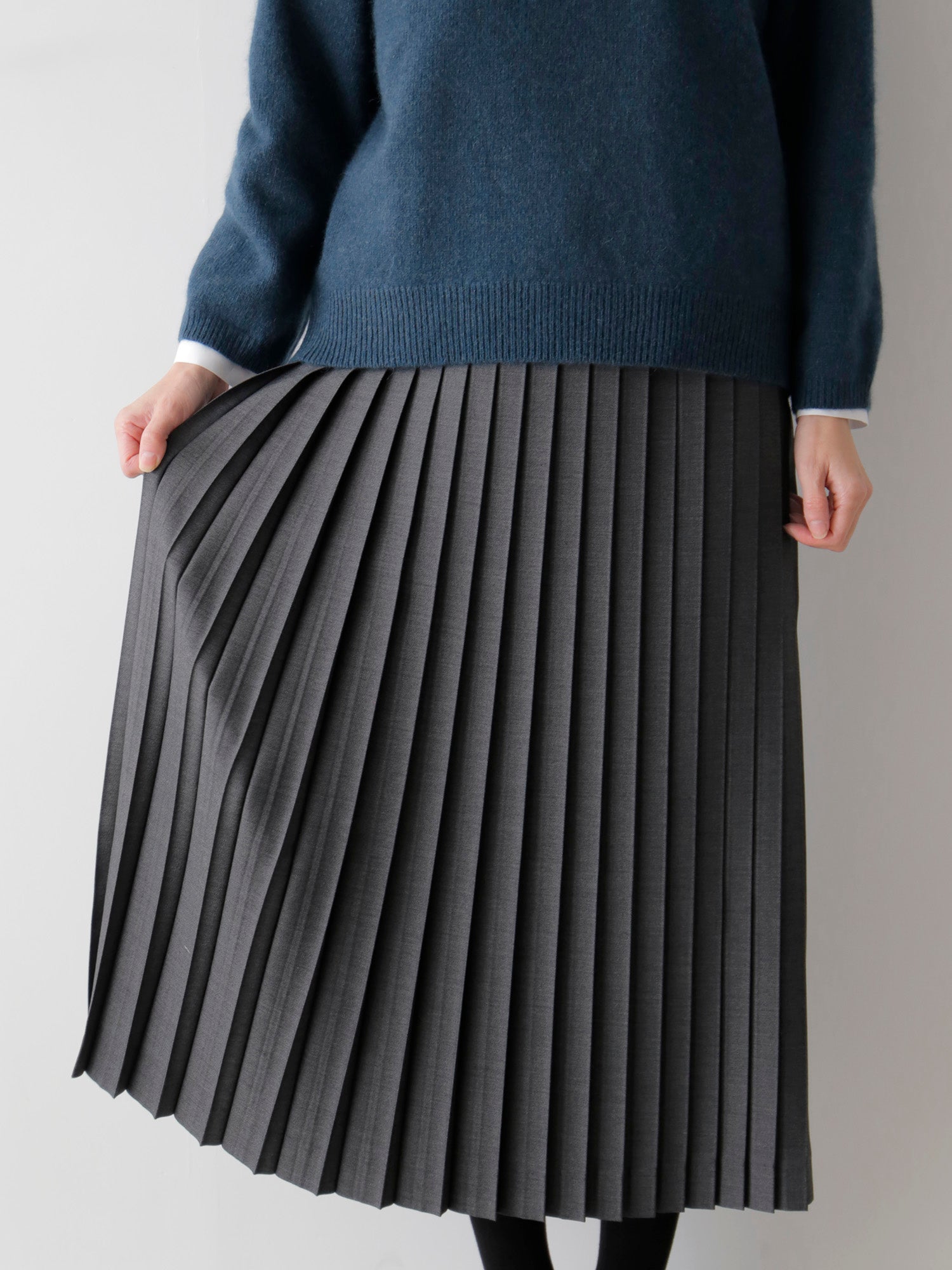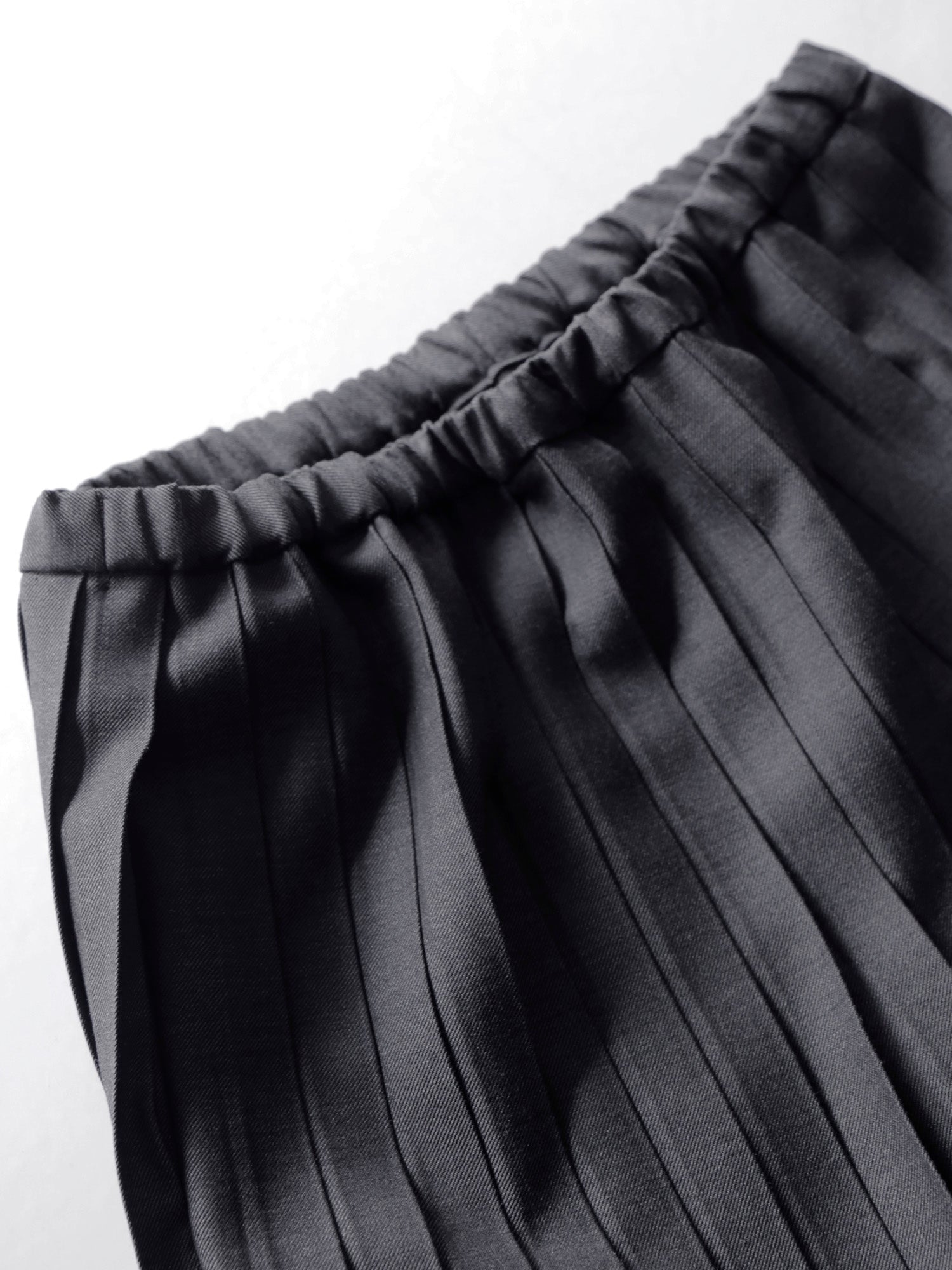 尾州の梳毛ギャバジンのほどよいハリと上品な艶感が、プリーツの端正な表情を際立たせます。