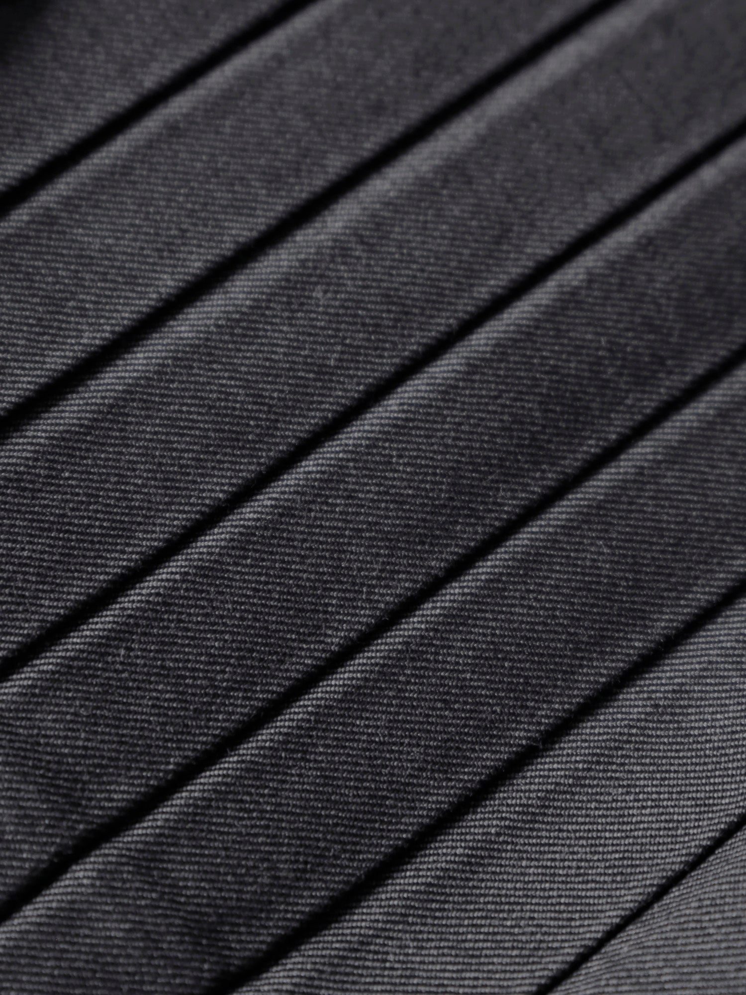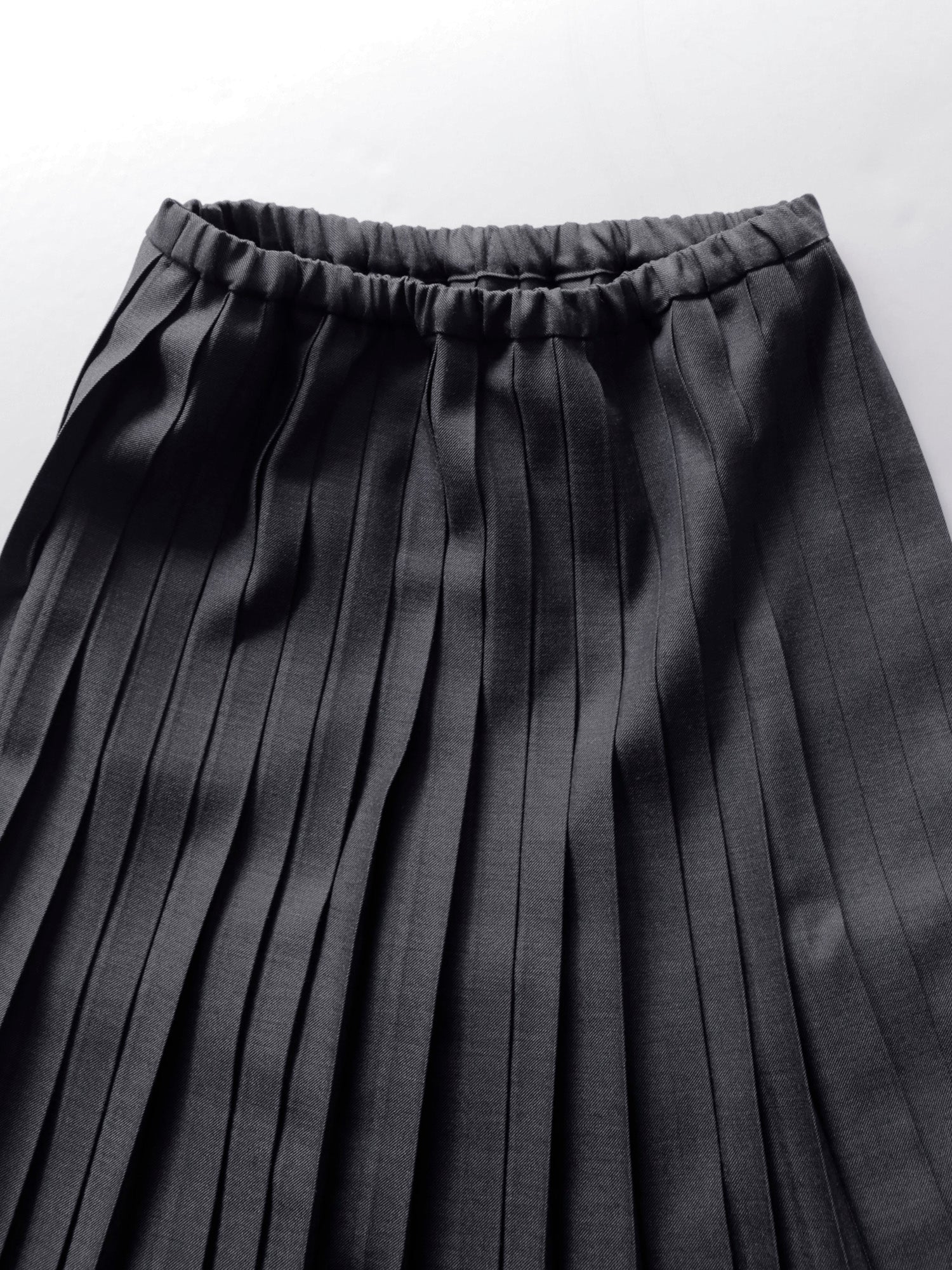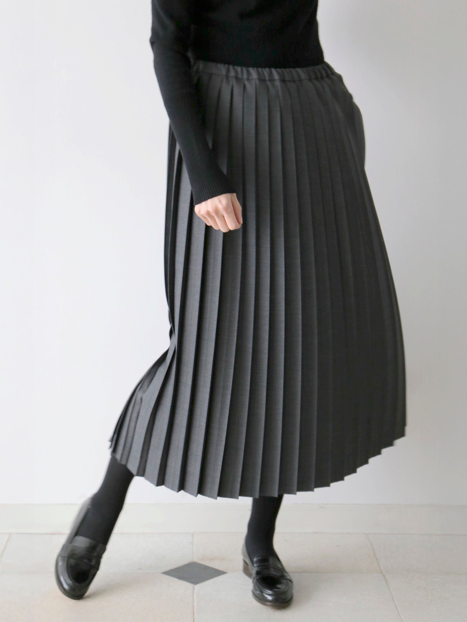 尾州の梳毛ギャバジンのほどよいハリと上品な艶感が、プリーツの端正な表情を際立たせます。