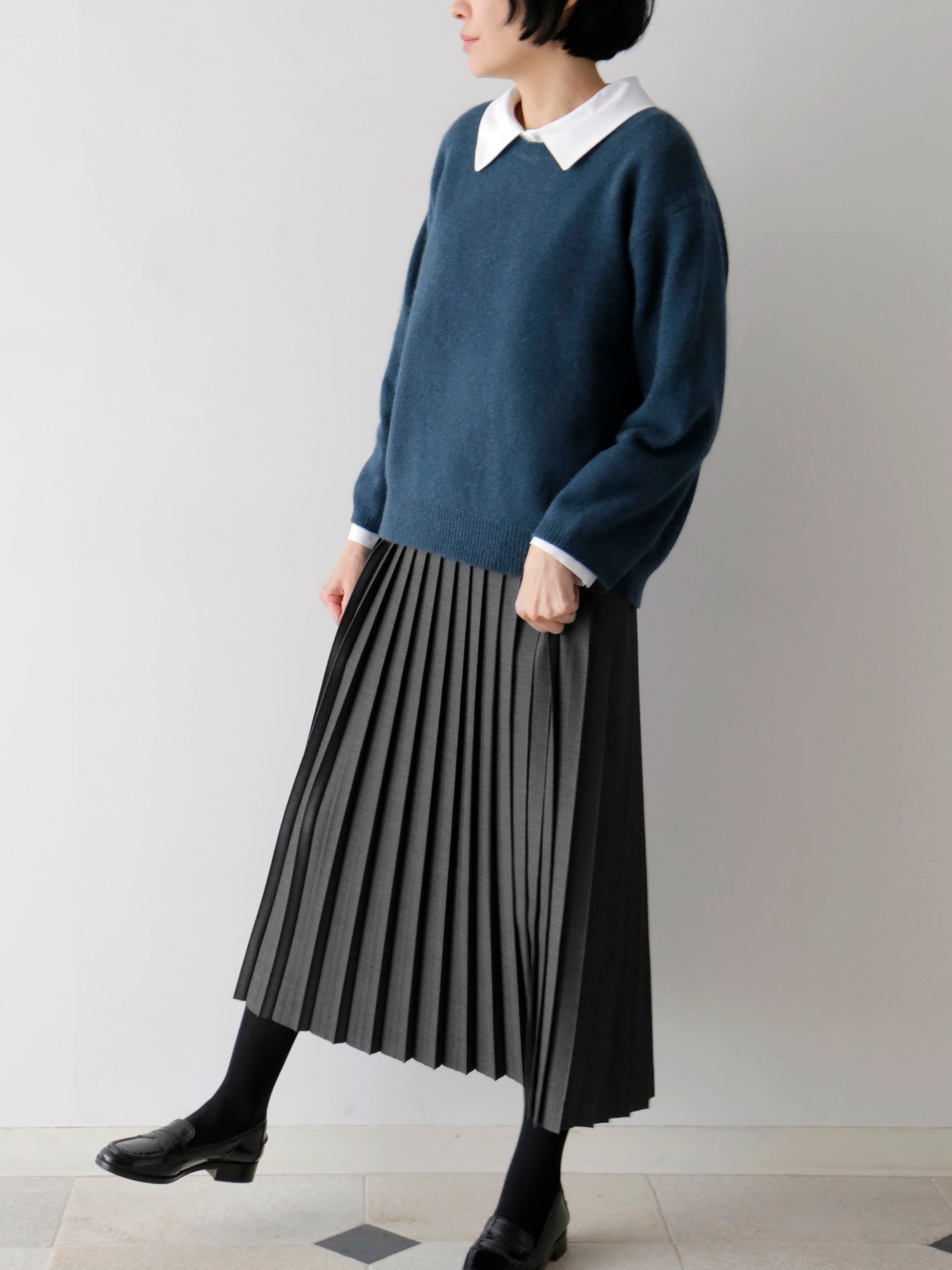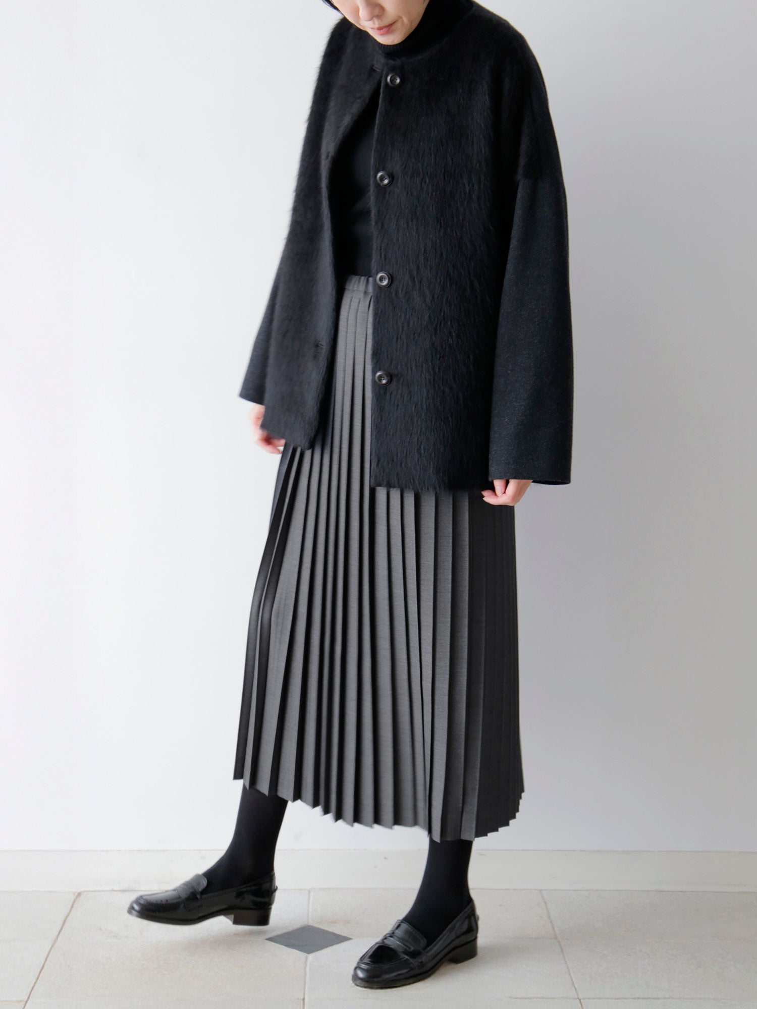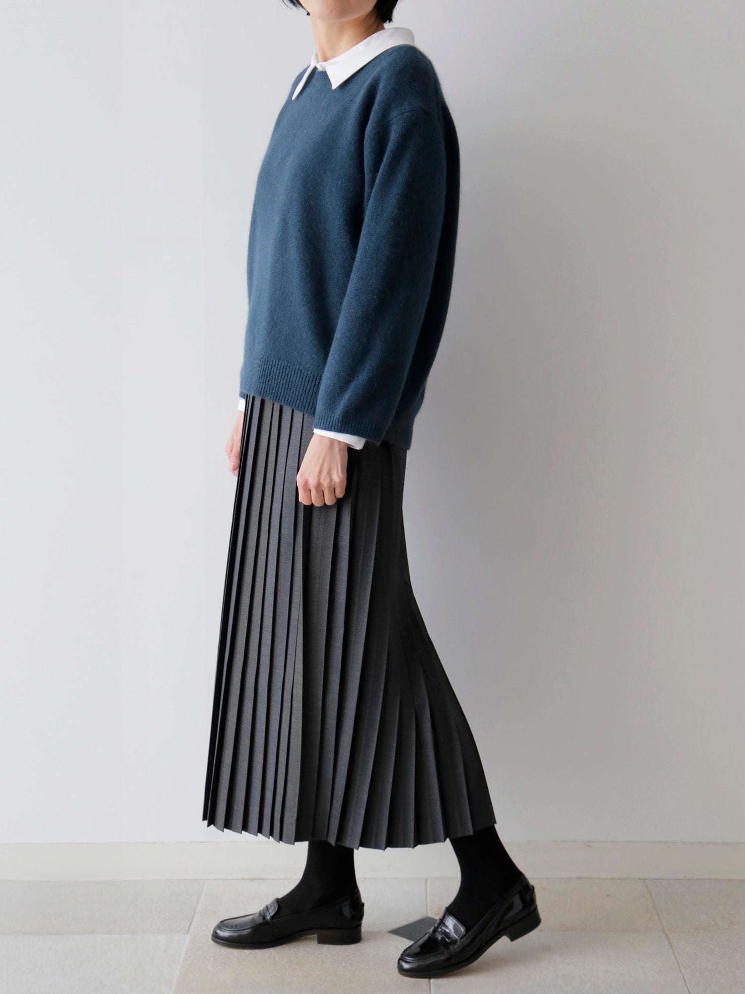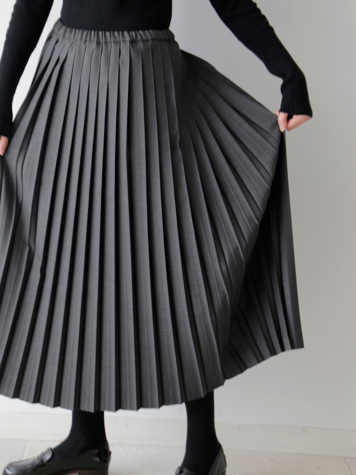 生地をたっぷりと使うことで、ベーシックでありながら質のよさを感じる一着です。日々の装いにすんなりと溶け込む軽やかさ。プリーツの整った佇まいが、静かな上品さを添えます。