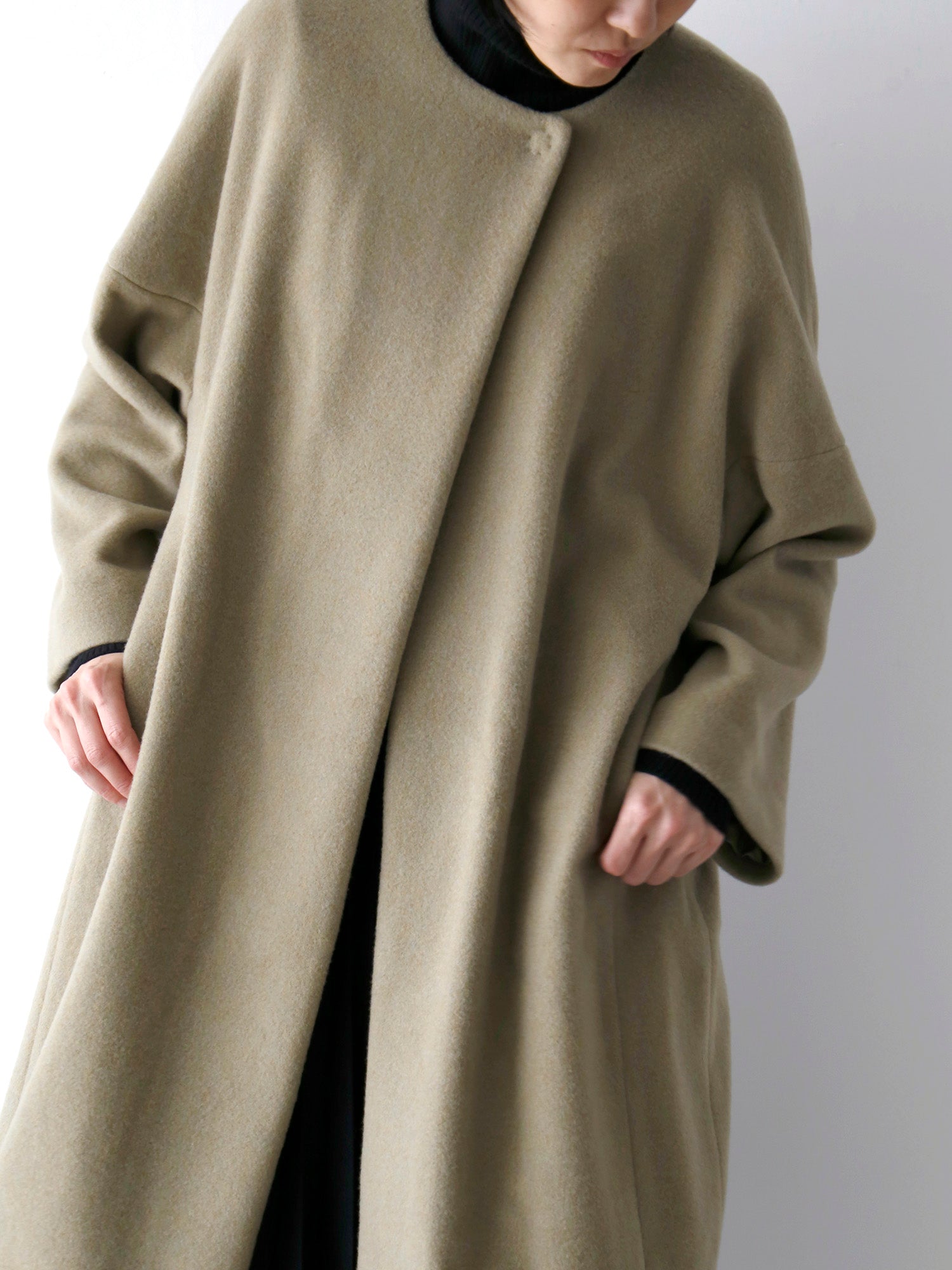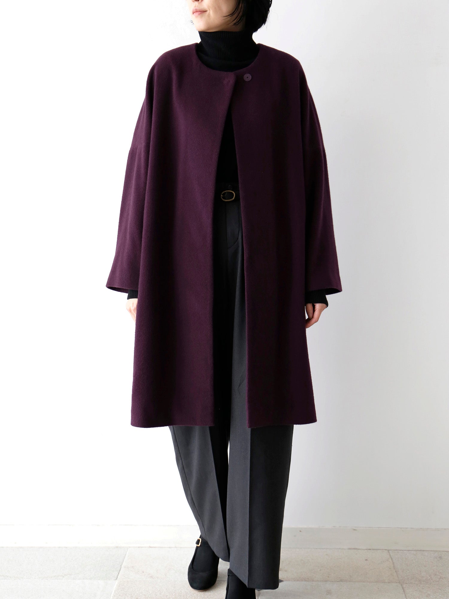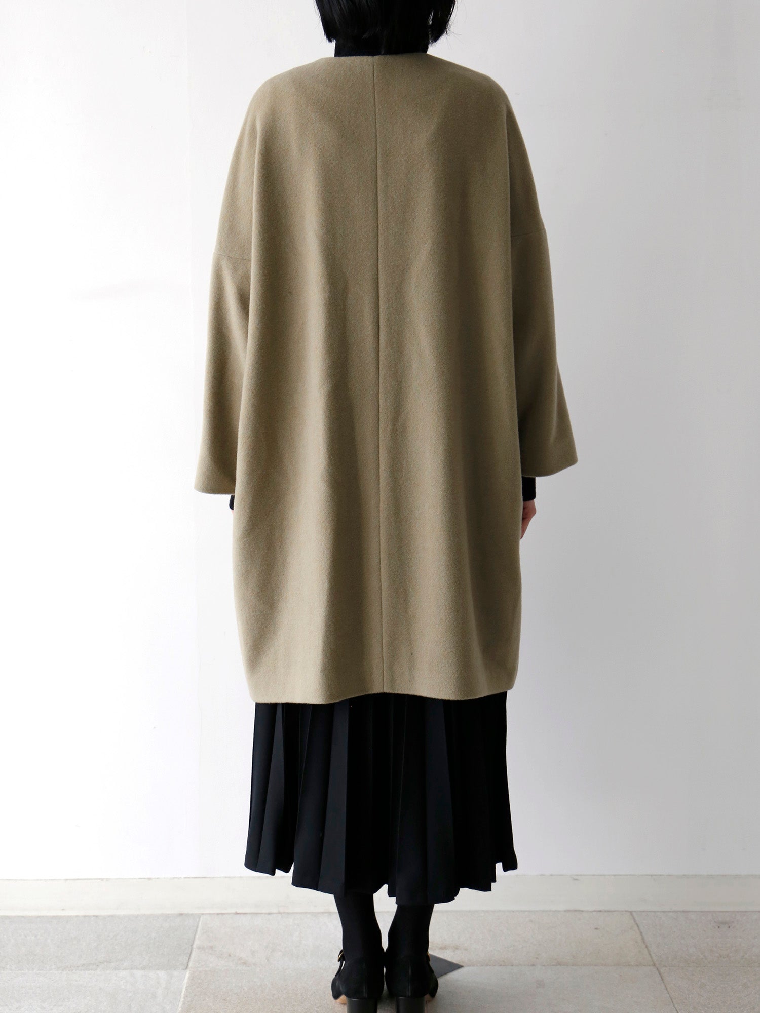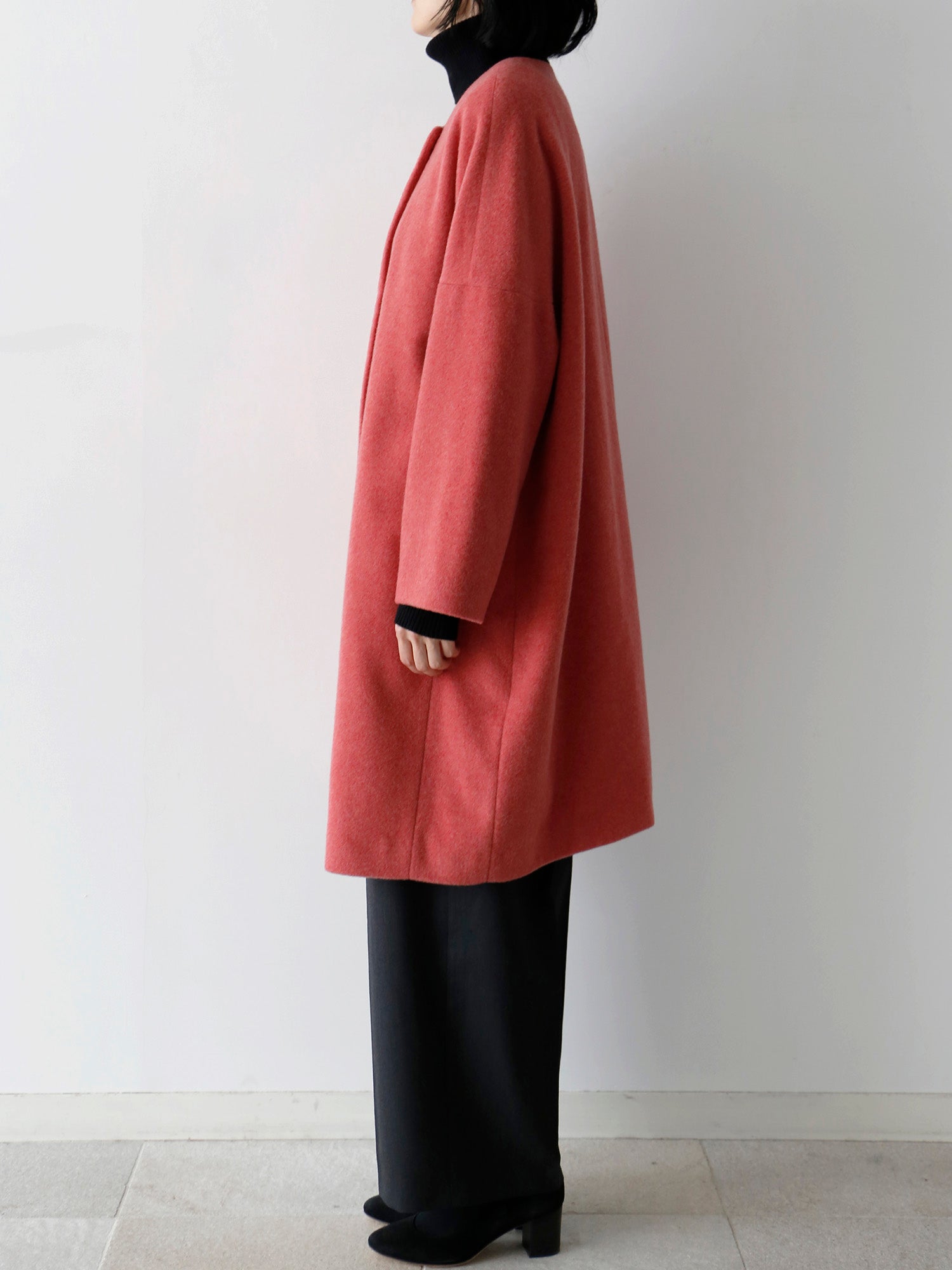 カシミヤ100%のノーカラーコート。