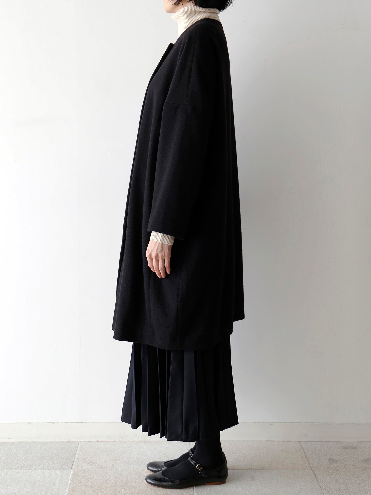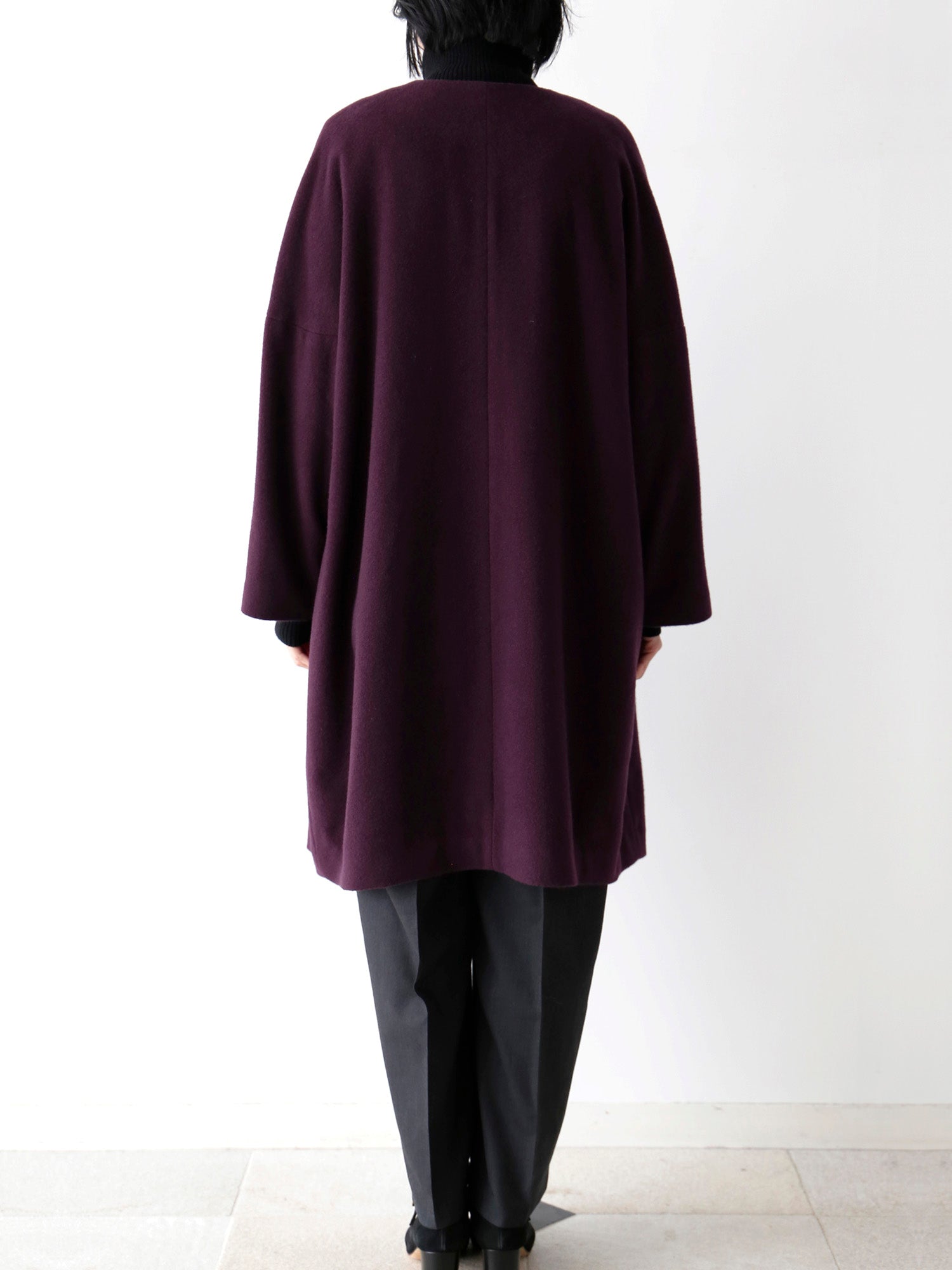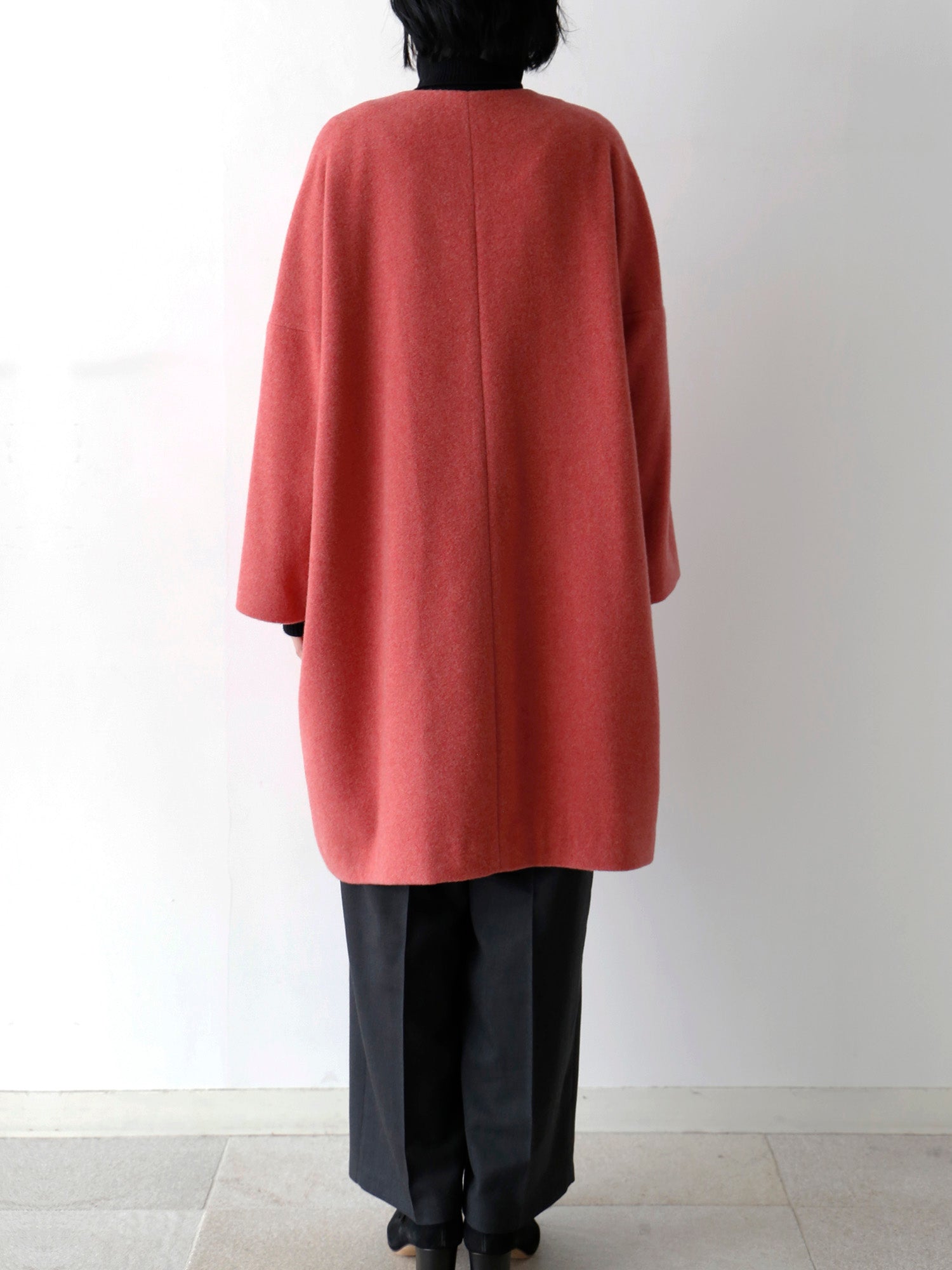 カシミヤ100%のノーカラーコート。