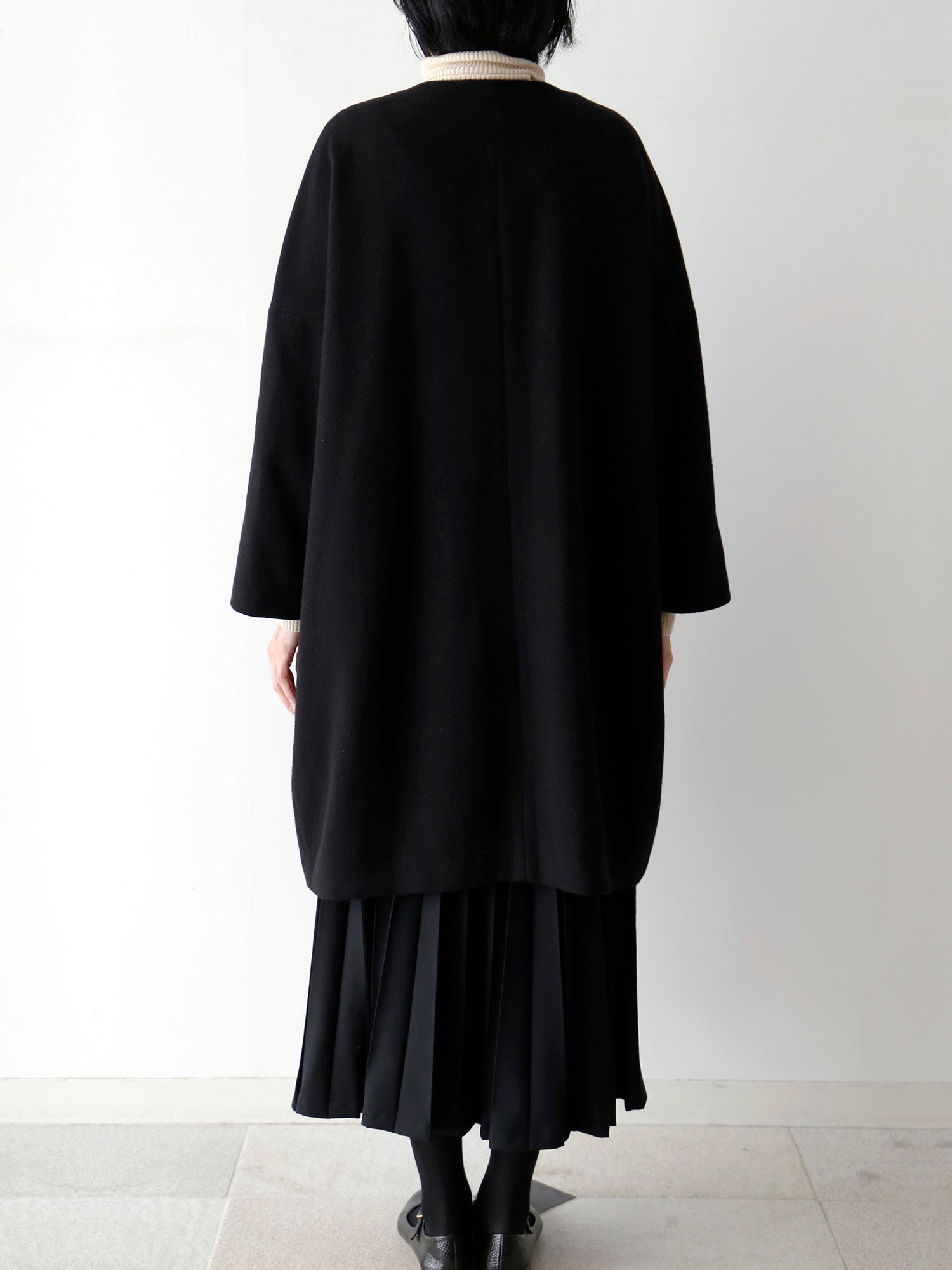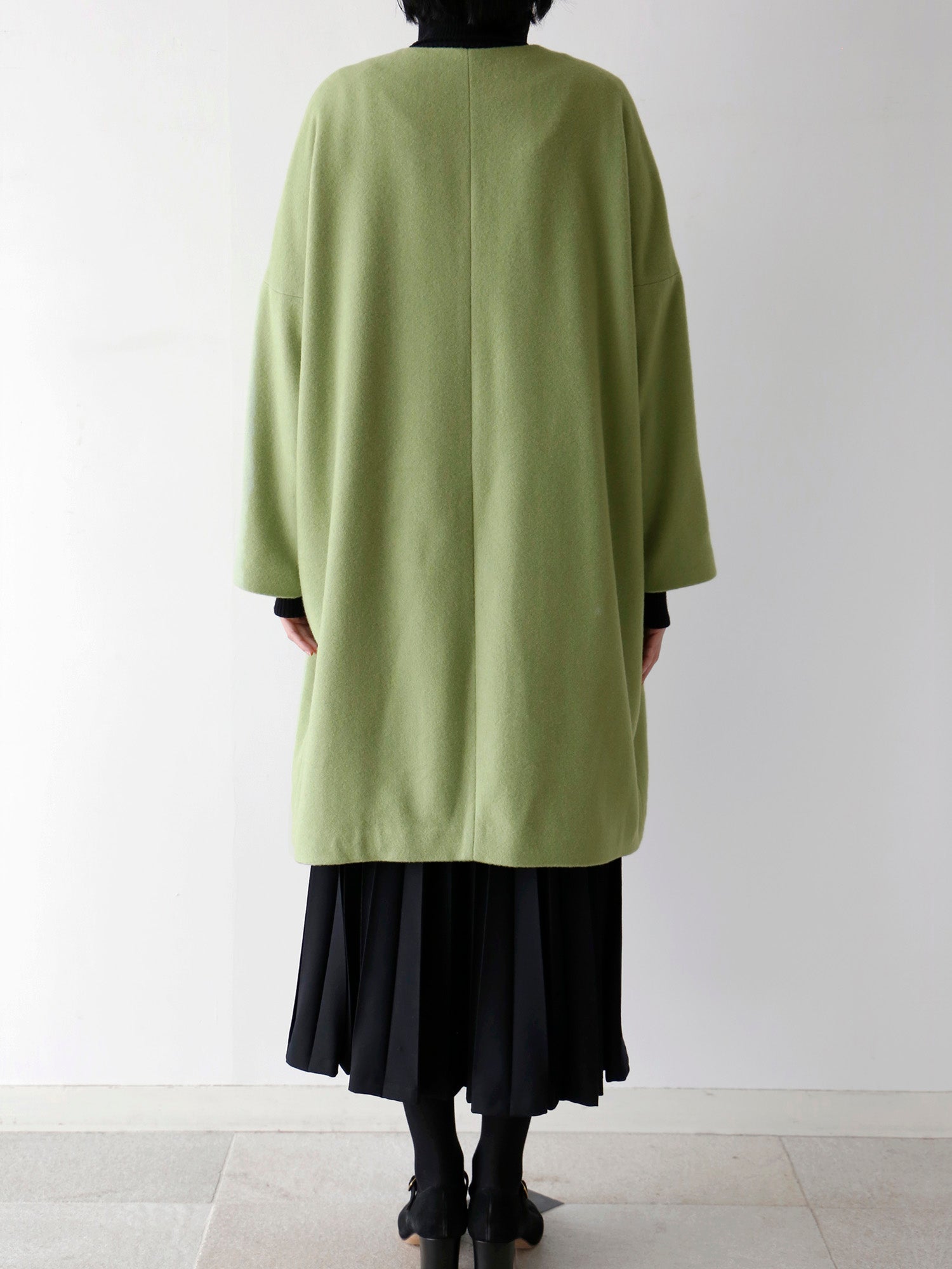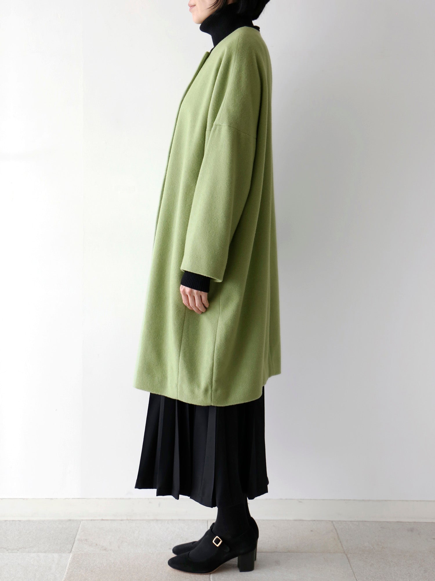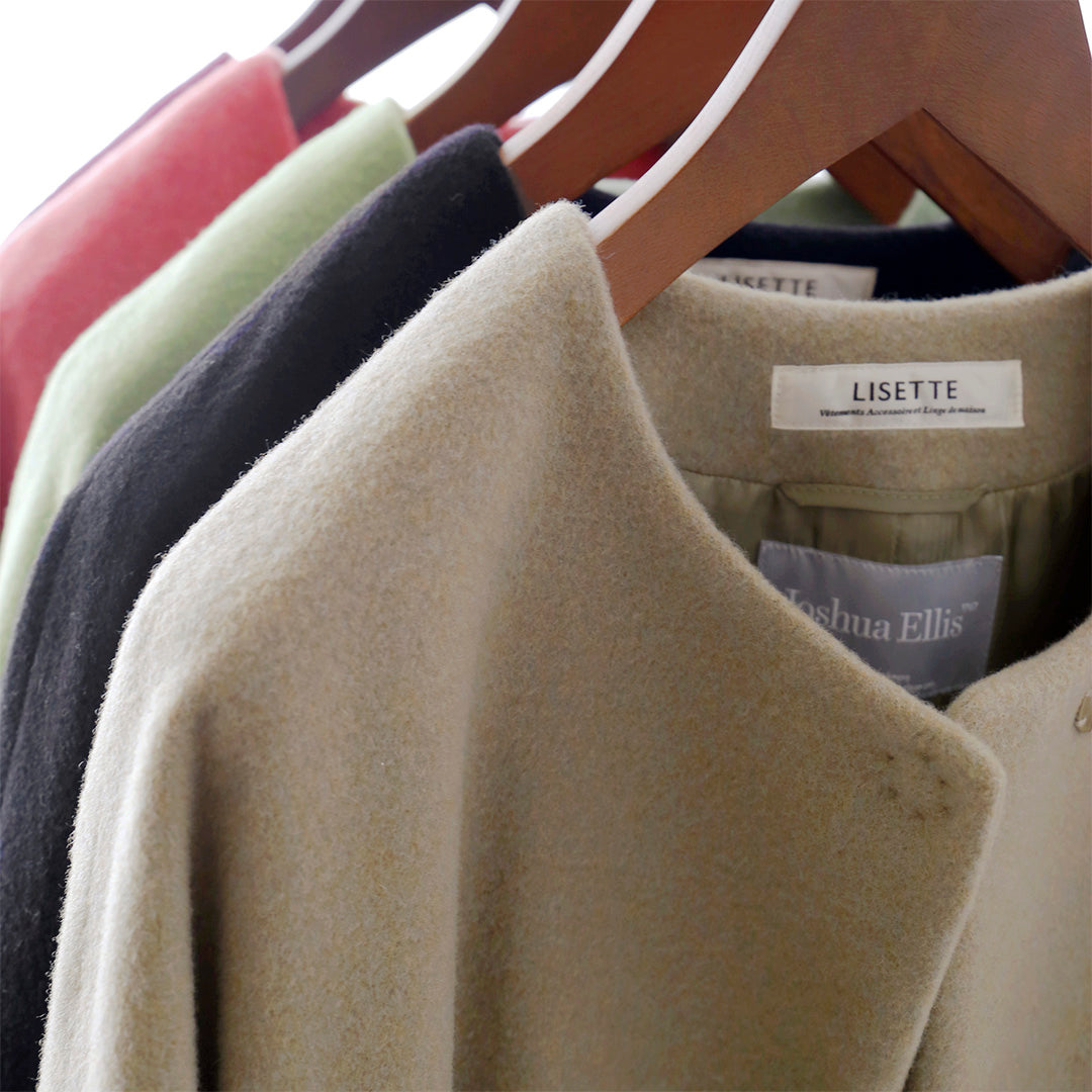 カシミヤ100%のノーカラーコート。