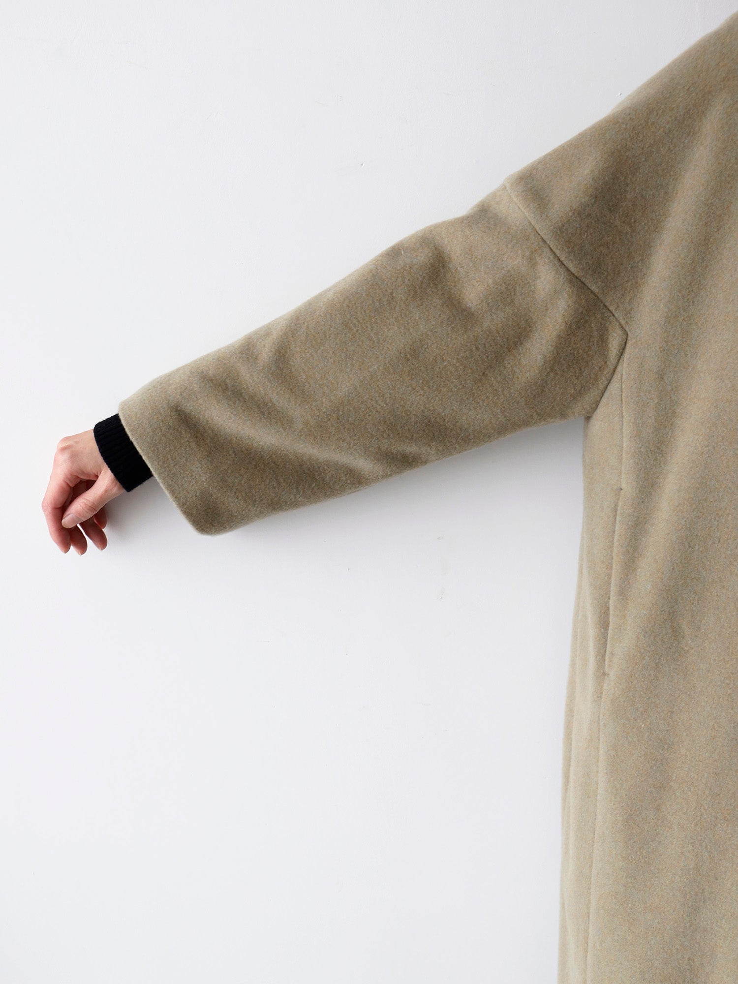 ふっくらとした起毛感と、まとうだけで感じる軽やかさ。表面には自然な光沢があり、しっとりとした肌ざわりが特徴です。