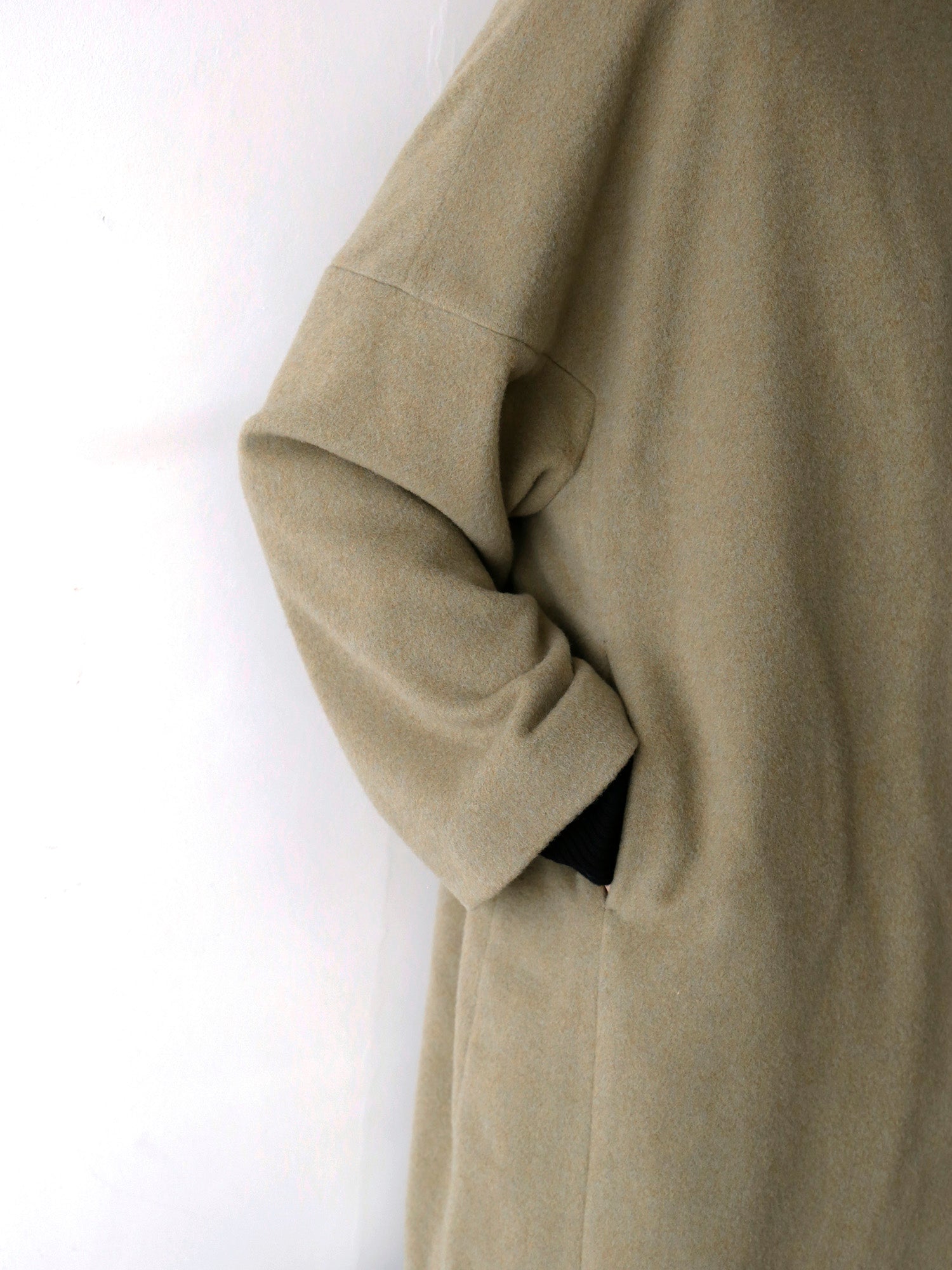 肩をなだらかに落としたドロップショルダーと、ゆとりのあるシルエットが、ニットを中に着ても美しく見えるよう仕立てています。