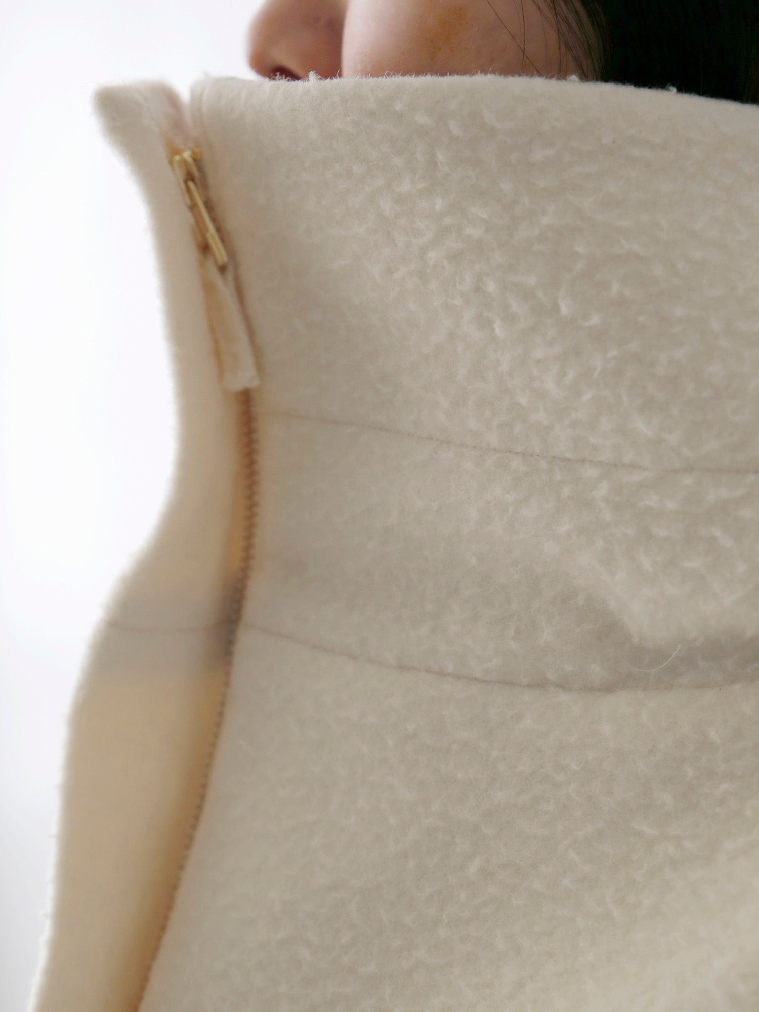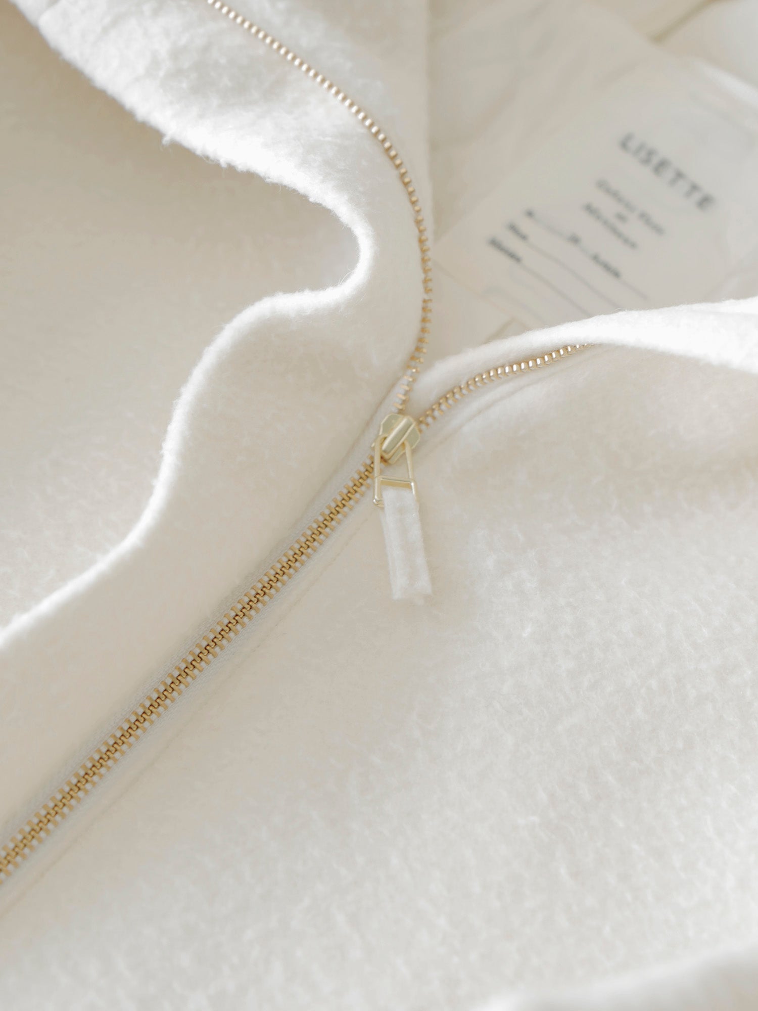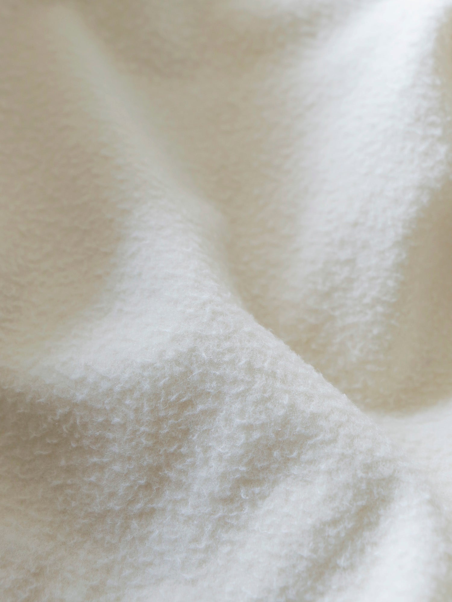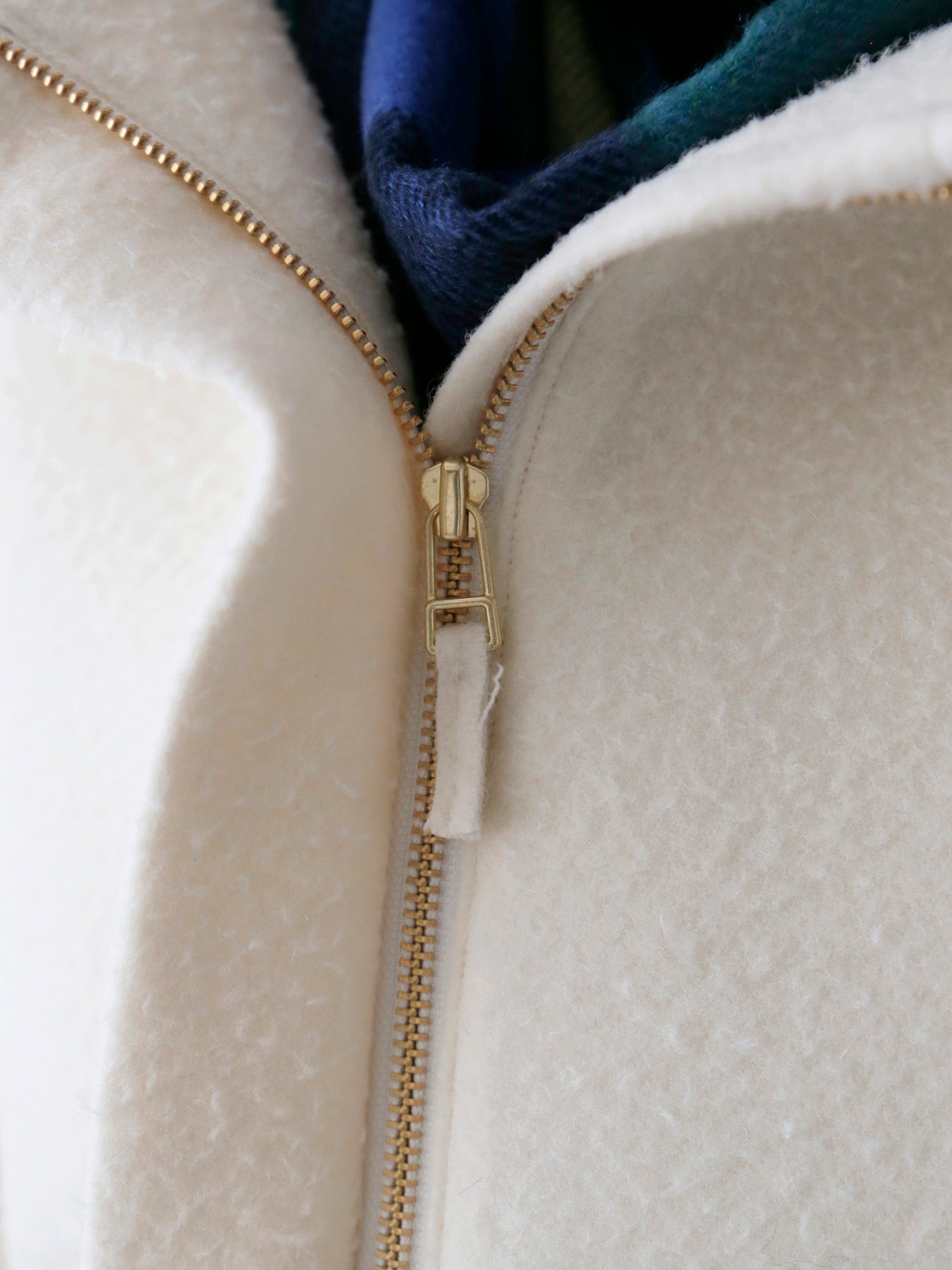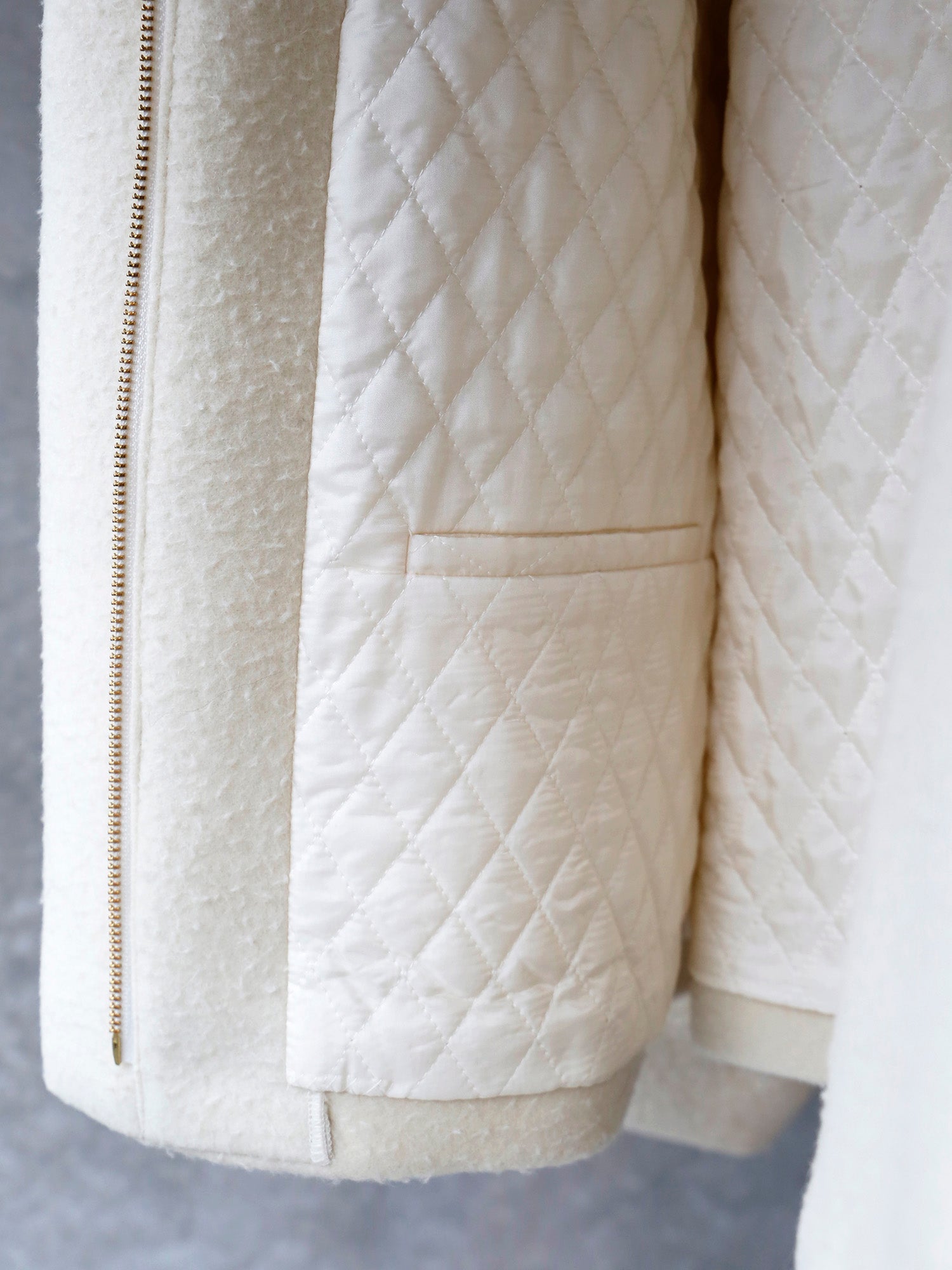 表面の毛がくるくると絡み合う独特のディテールを持ち、空気をしっかりと含むため、軽くあたたかな着心地です。ここに中わたを重ねることで、さらに保温性を高めています。