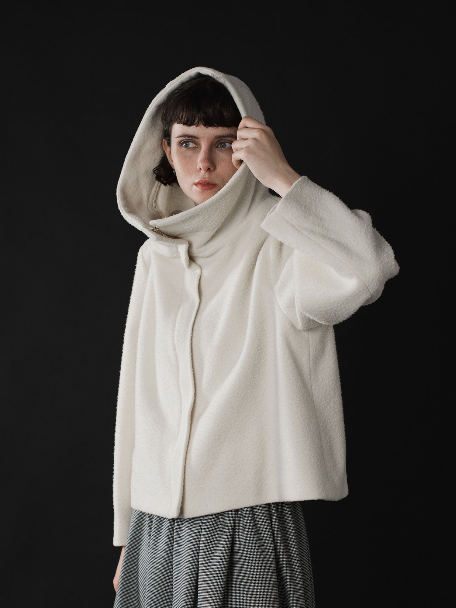 モードな印象を感じさせる立ち上がったフードが首元まで包み込み、冷たい風をしっかり遮ります。