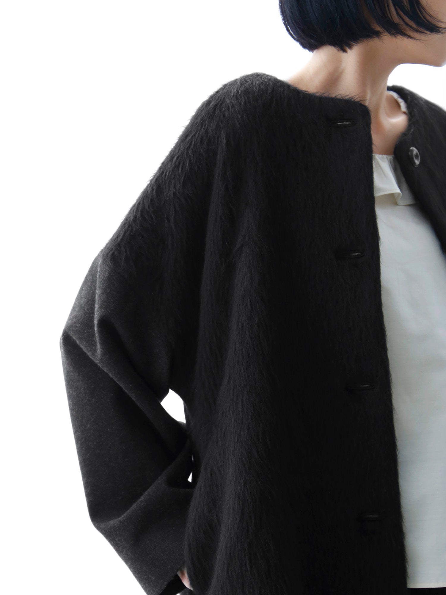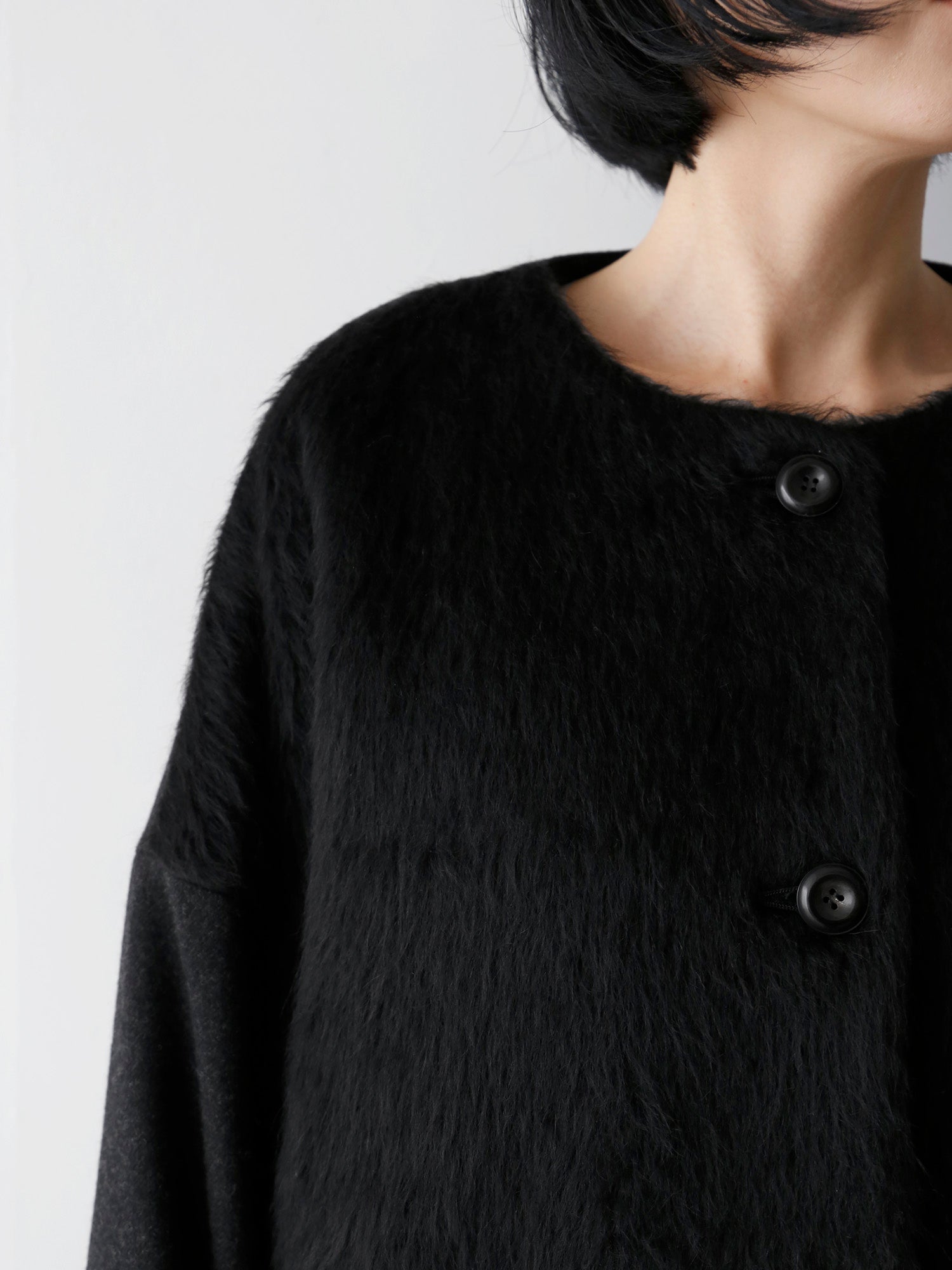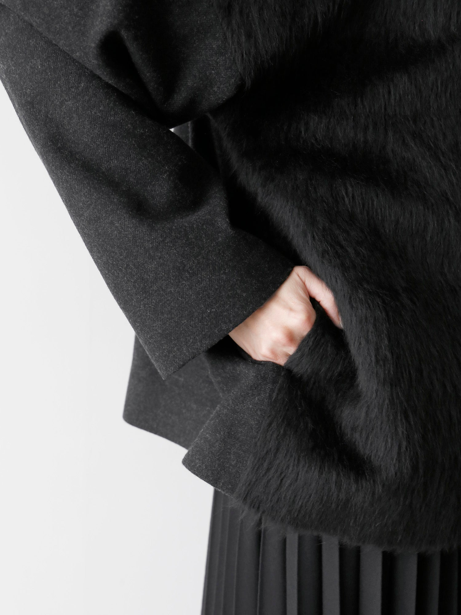 前身頃は毛足のあるアルパカ混のイタリアンシャギー、後ろ身頃と袖にはなめらかなウールフラノを使用。質感の異なる2つの素材を組み合わせたハーフコートです。