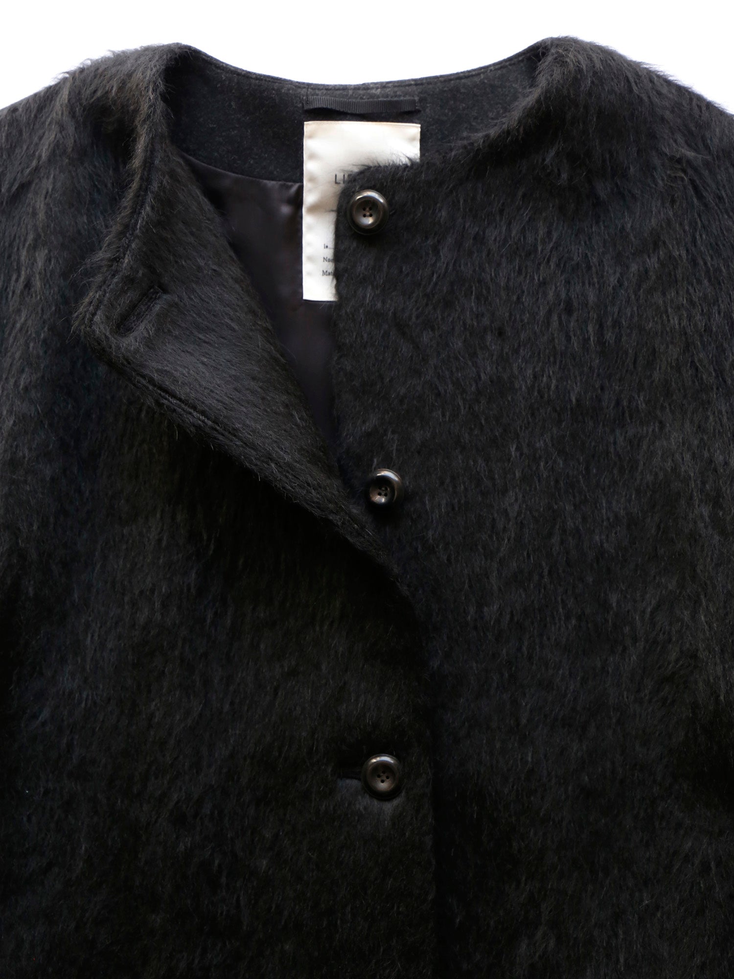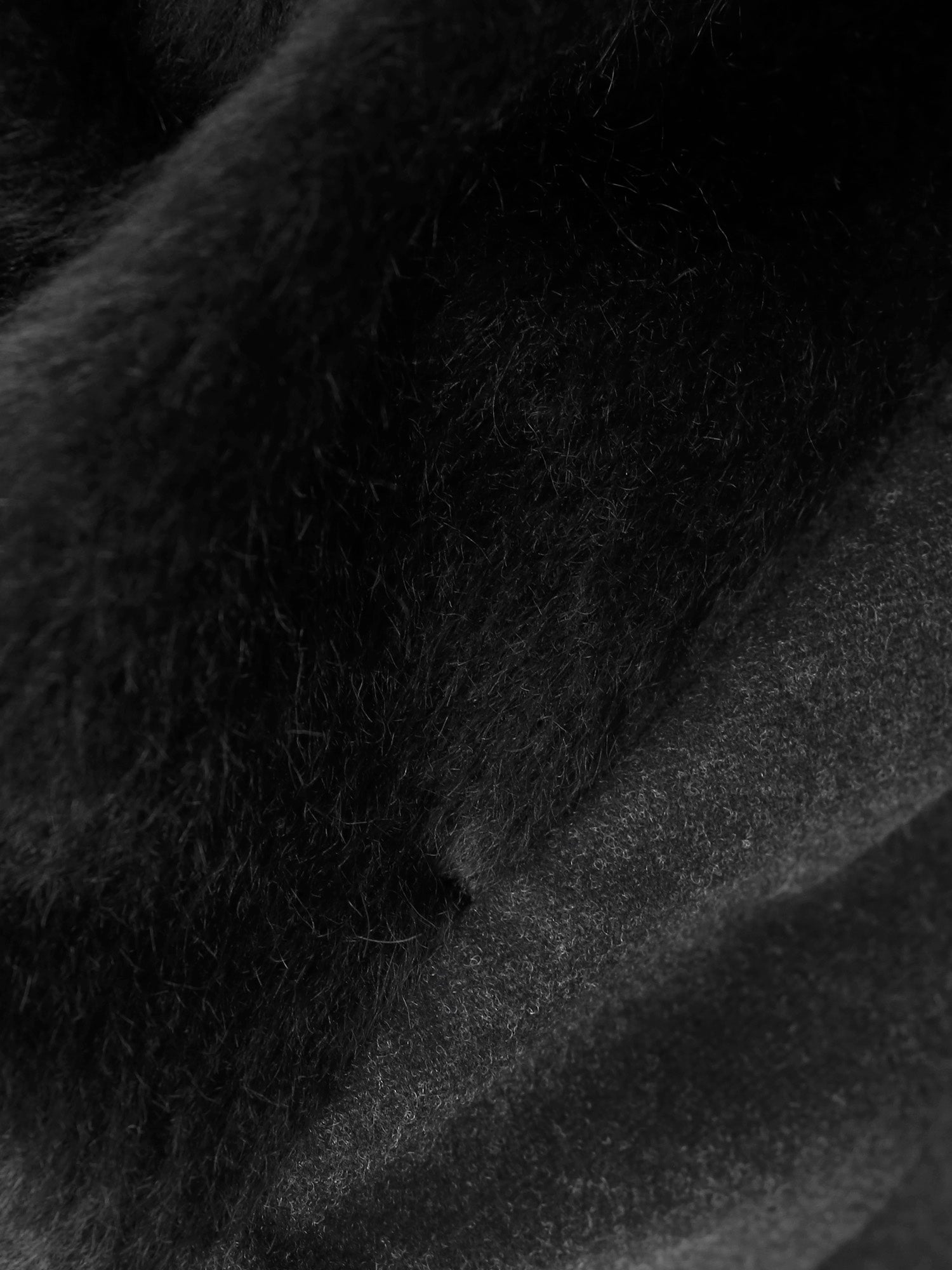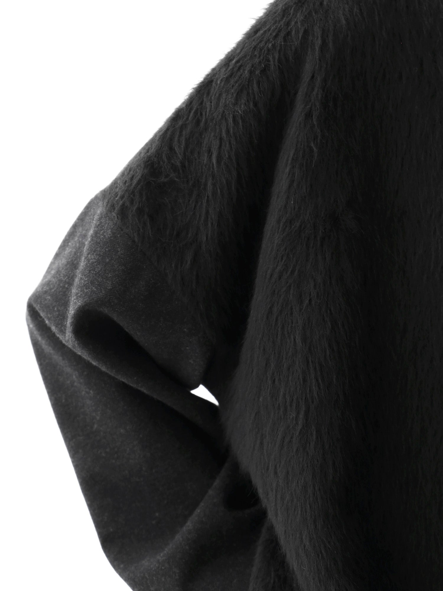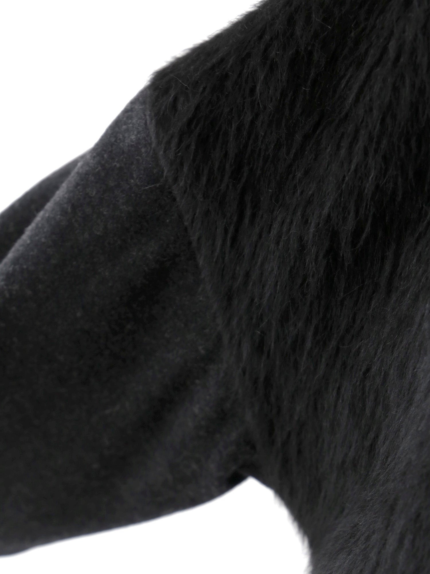 前身頃は毛足のあるアルパカ混のイタリアンシャギー、後ろ身頃と袖にはなめらかなウールフラノを使用。質感の異なる2つの素材を組み合わせたハーフコートです。