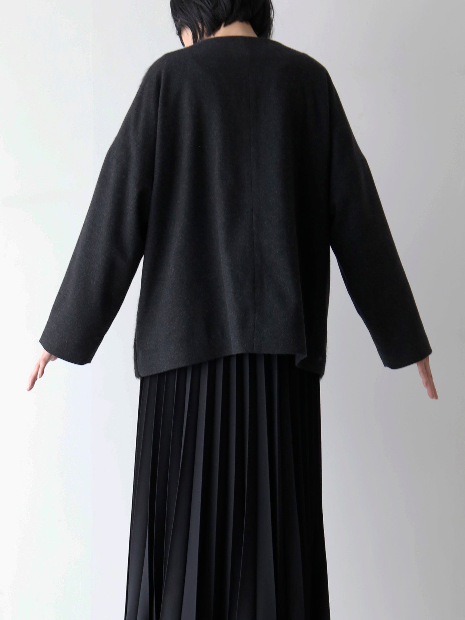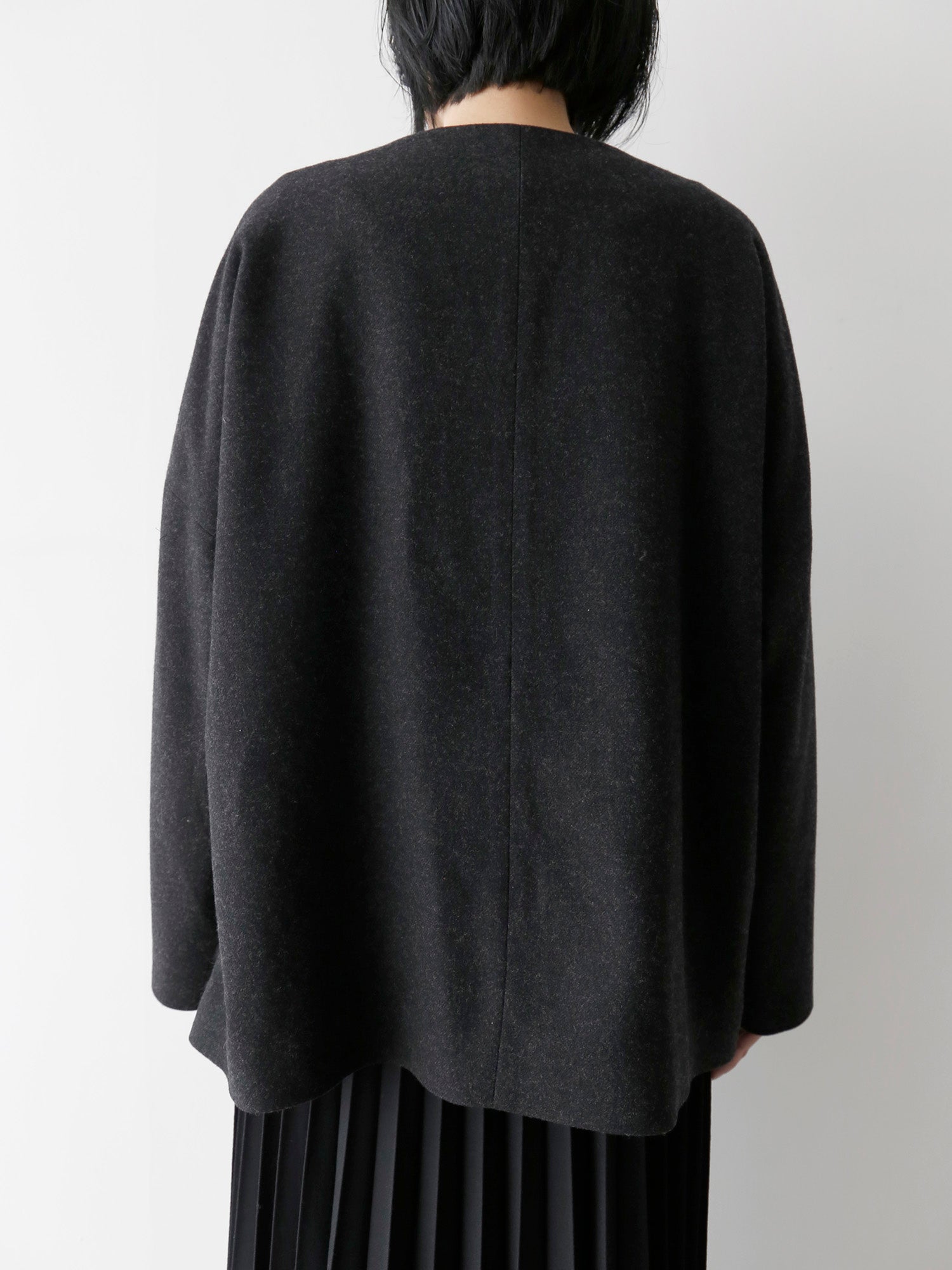袖下にゆとりを持たせたドロップショルダーは、身体を包み込むようなラインで着脱しやすく、中に合わせるものを選ばないのもうれしい。