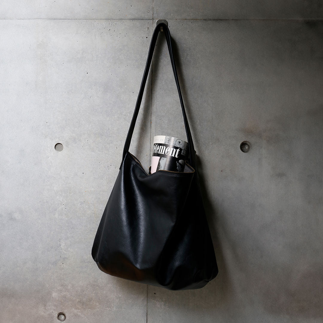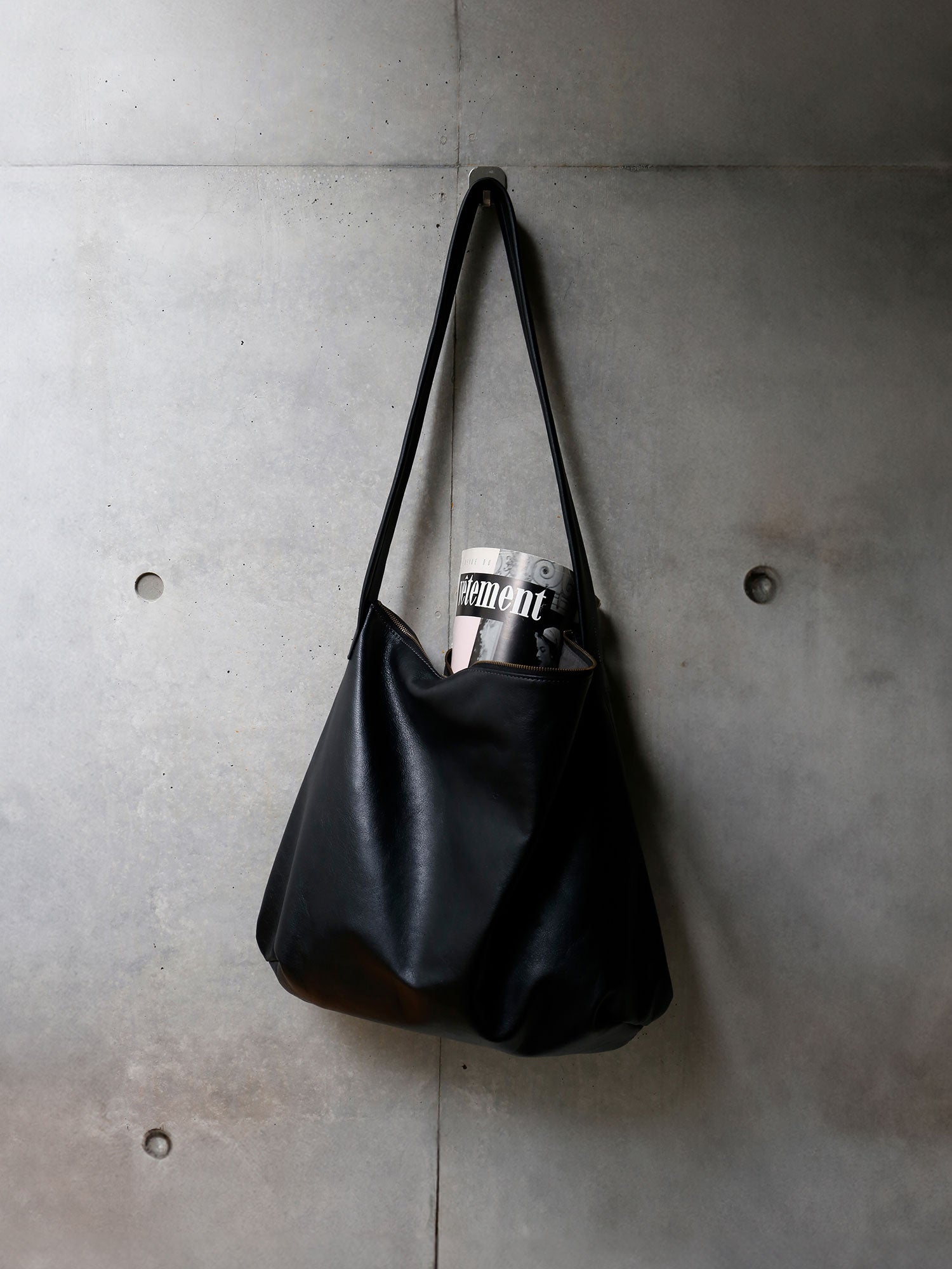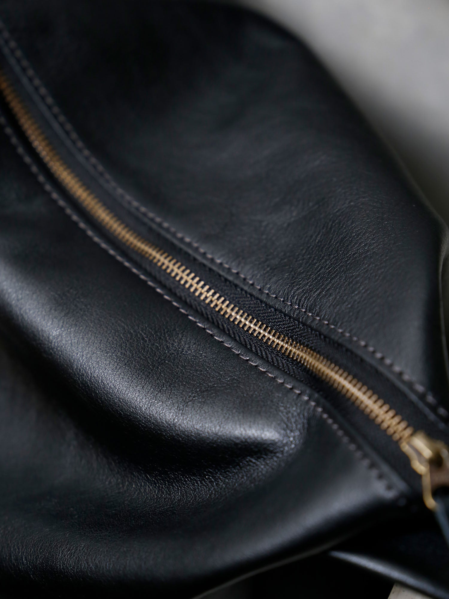 カジュアルな用途の多いワンショルダーを、黒のレザーでシックに仕上げました。ニュートラルで、装いやシーンの振り幅が広いバッグです。