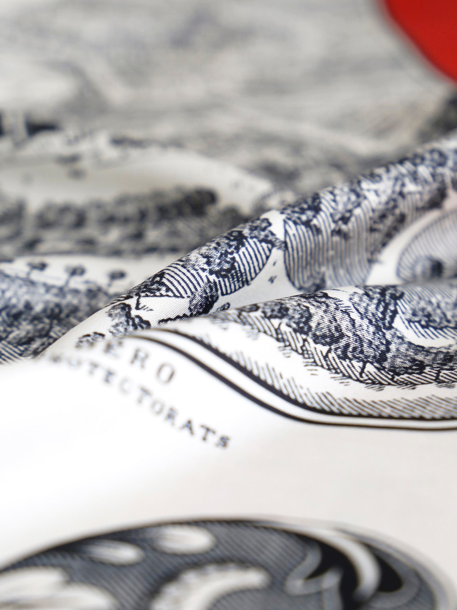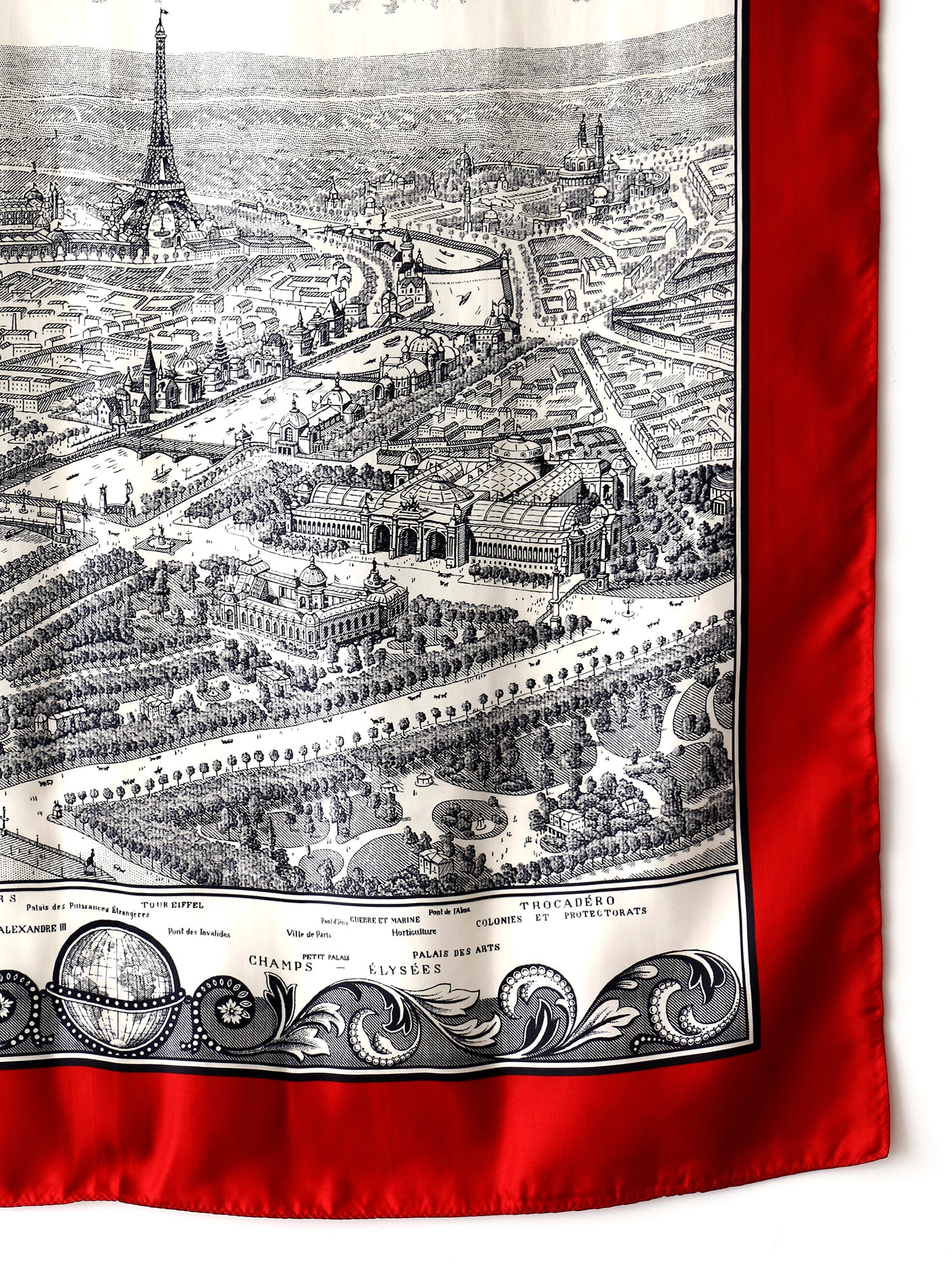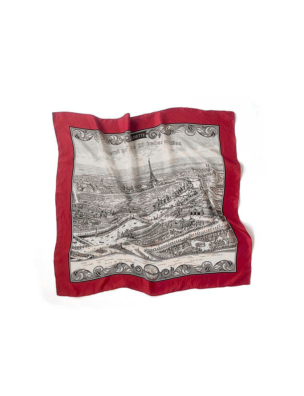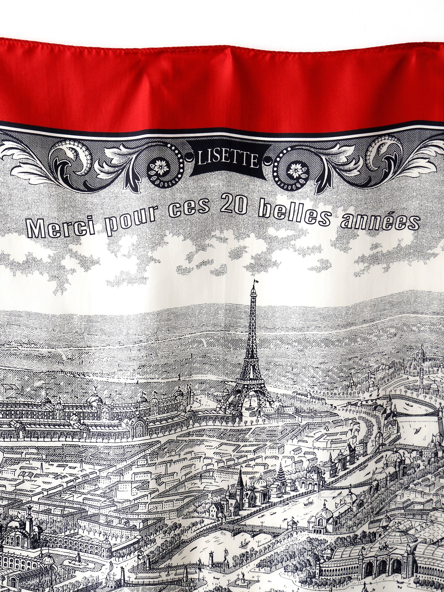 縁取りには、建設当時のエッフェル塔を思わせるルージュの色を。装いに華を添え、首元に結ぶだけで洗練された印象に仕上がります。