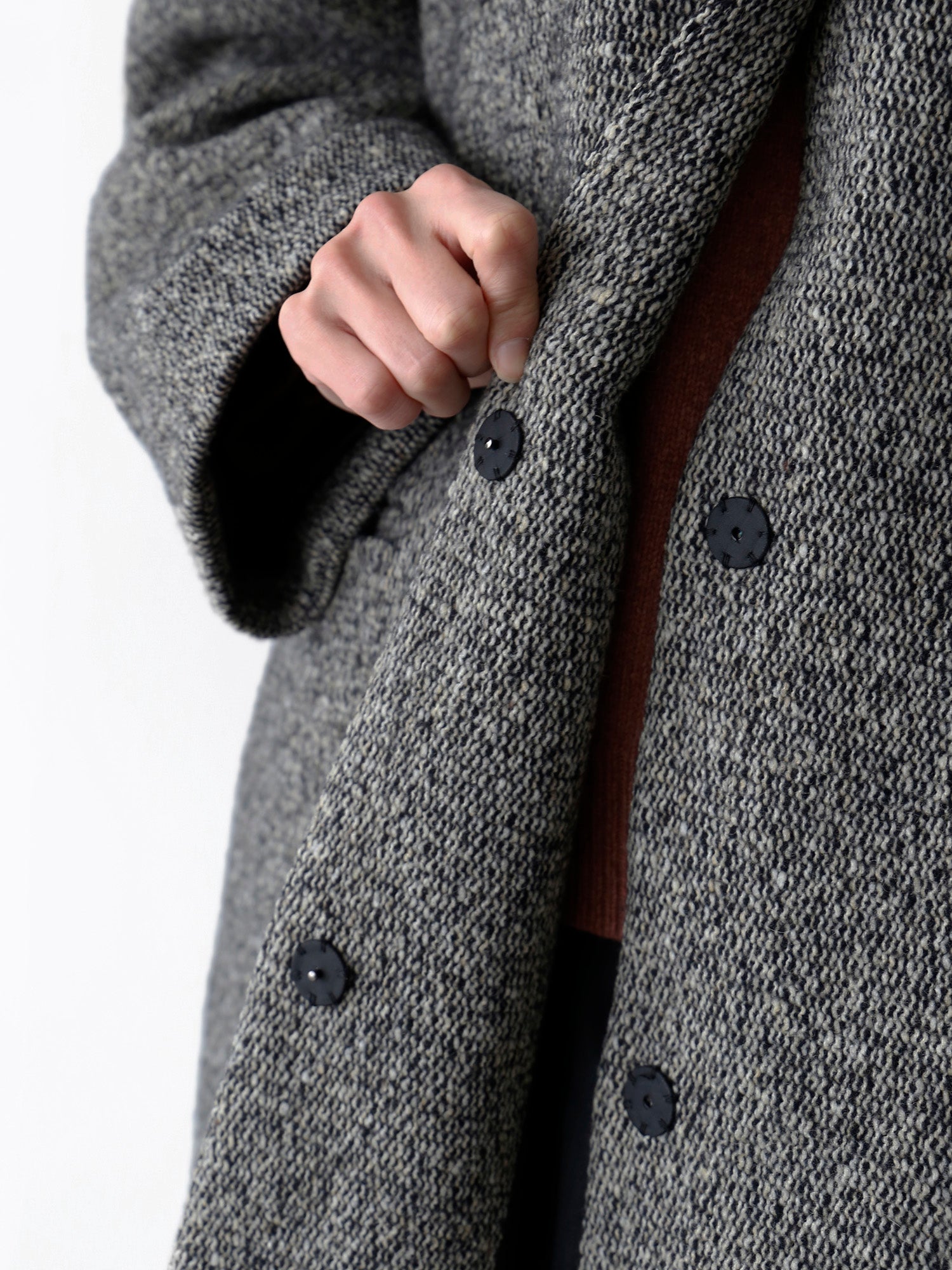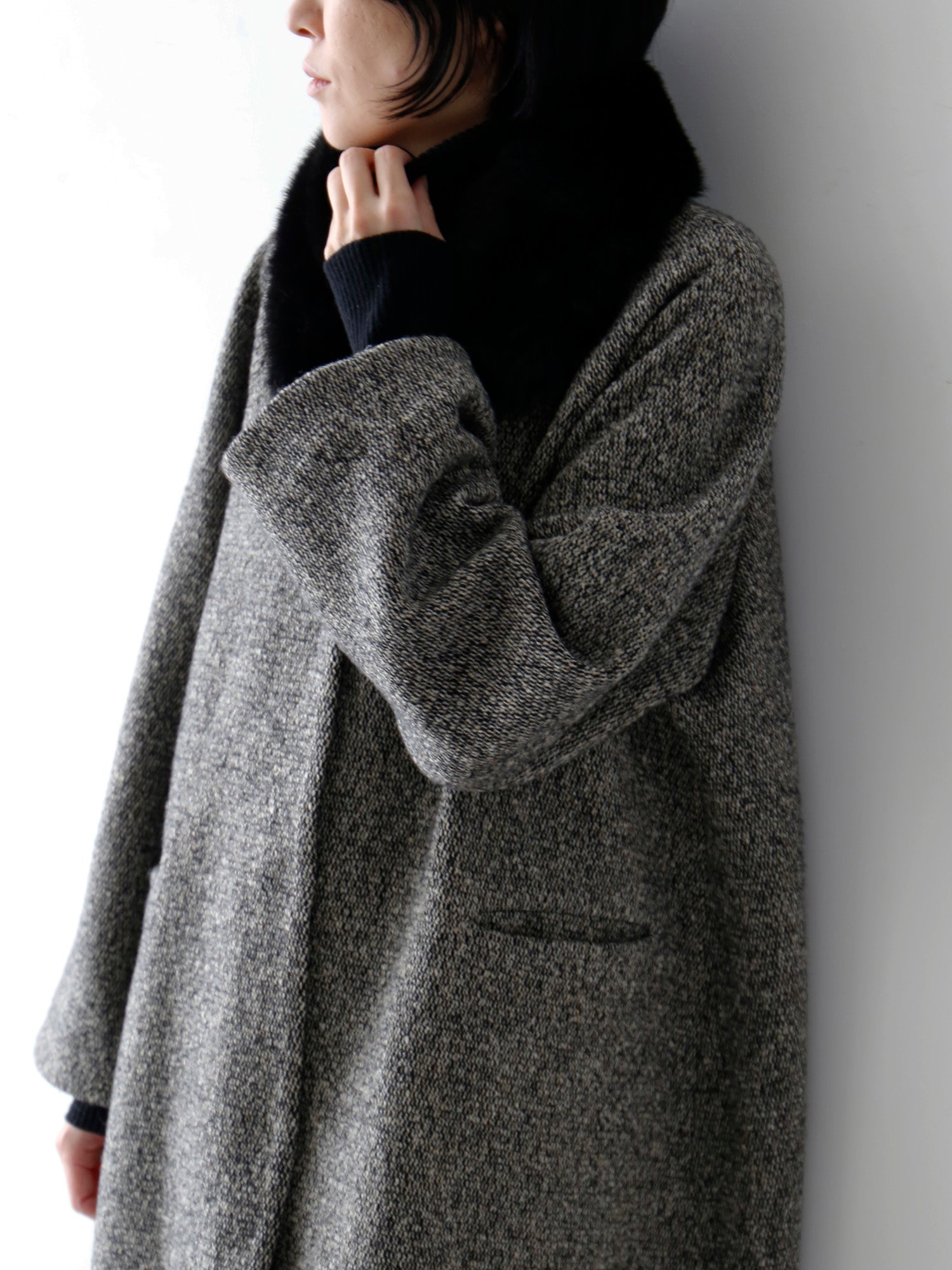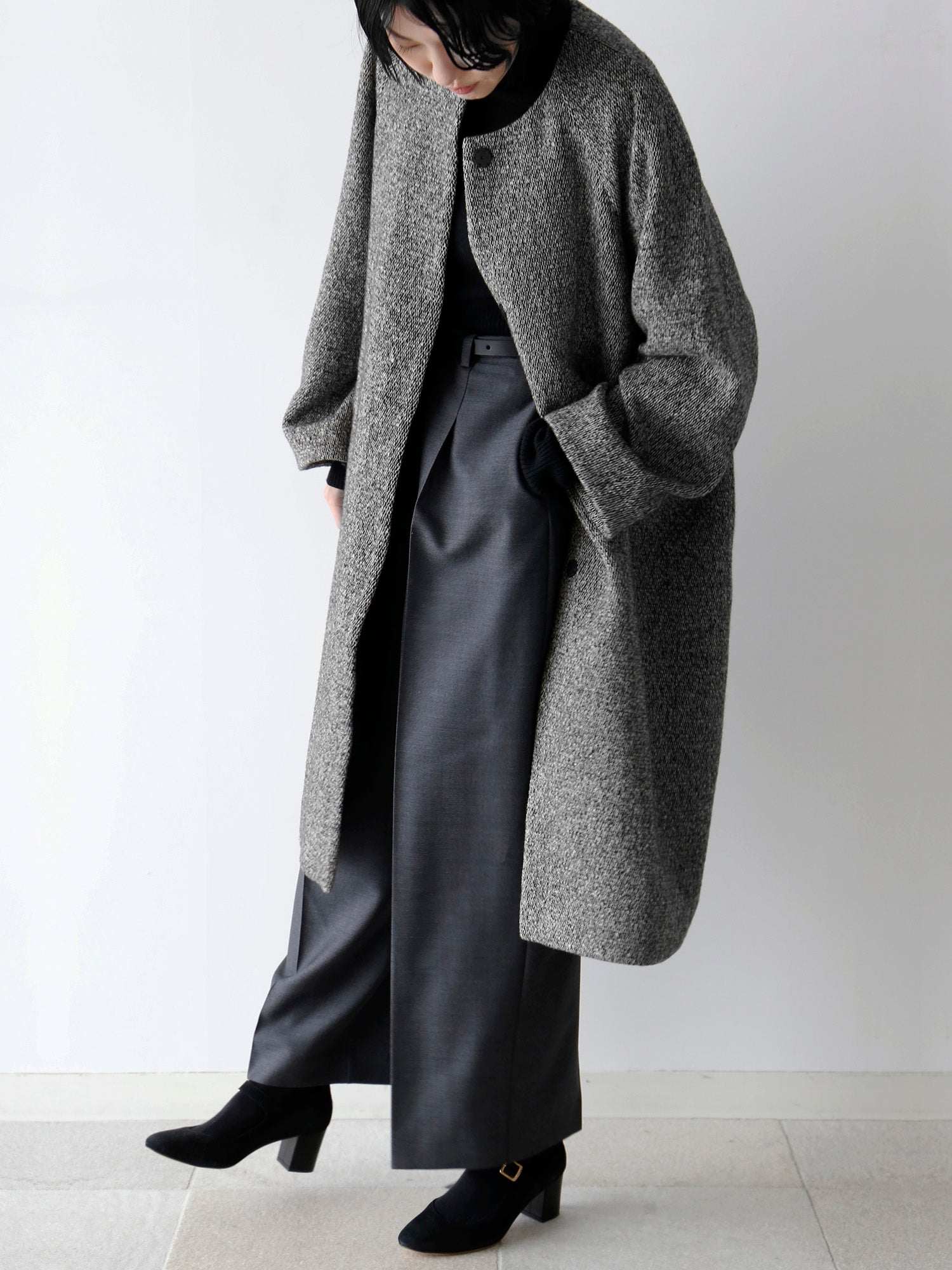 上質なループヤーンを使用したブークレ地は、軽くてあたたか。繊細な杢調の表情が、奥行きのあるグレーを生み出しています。