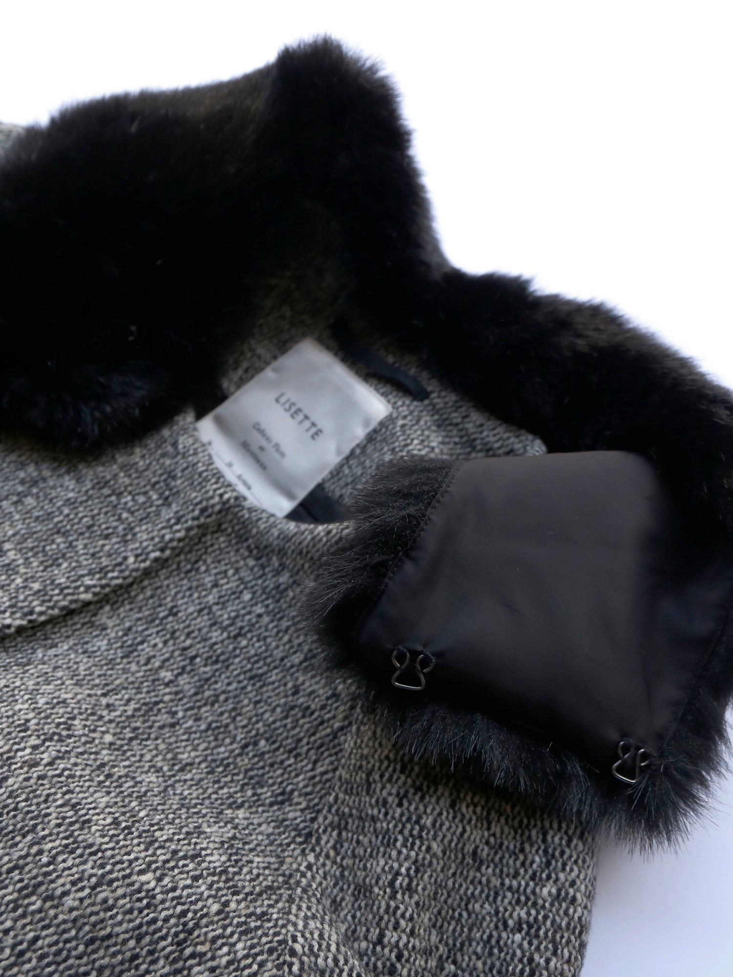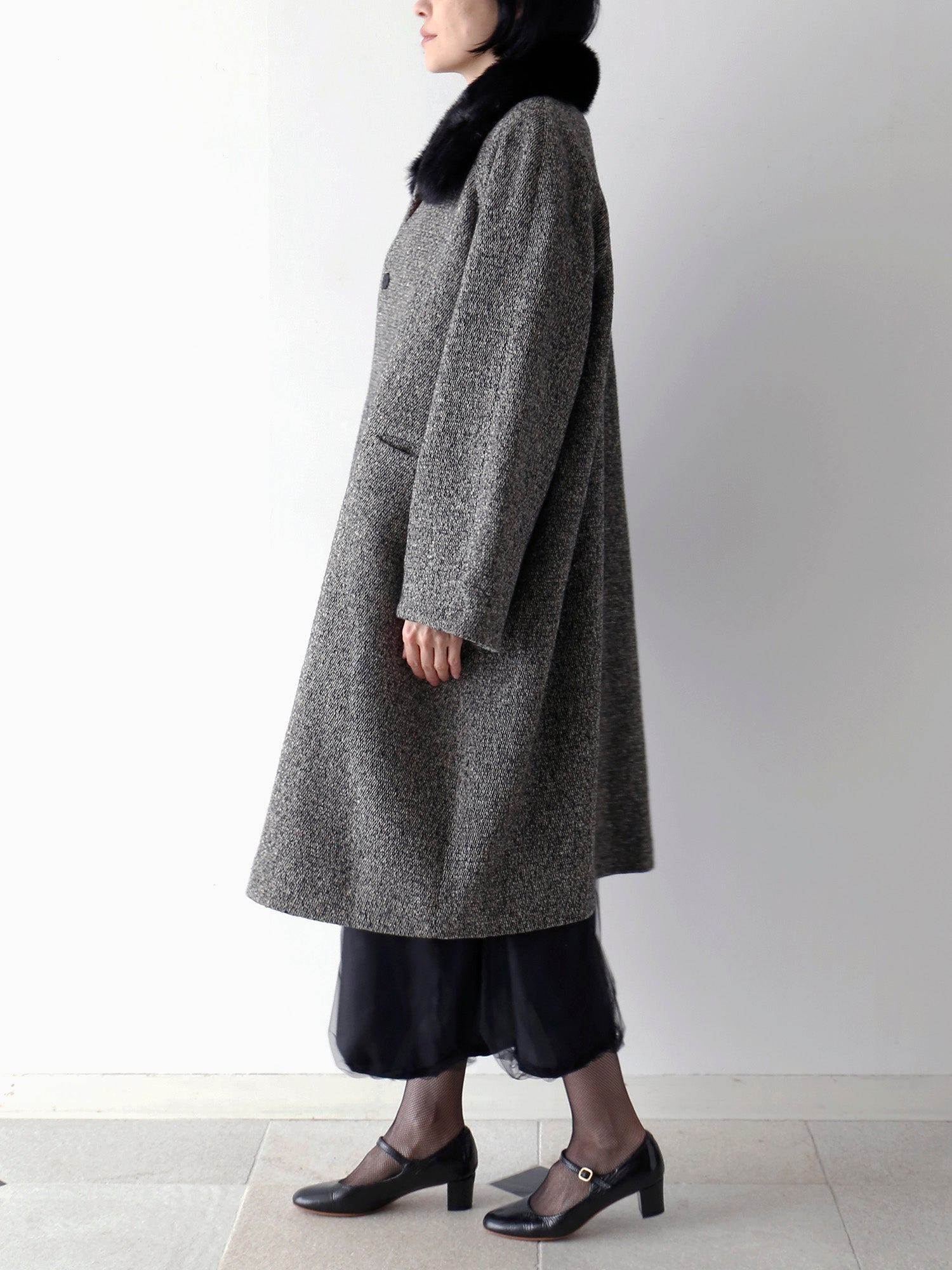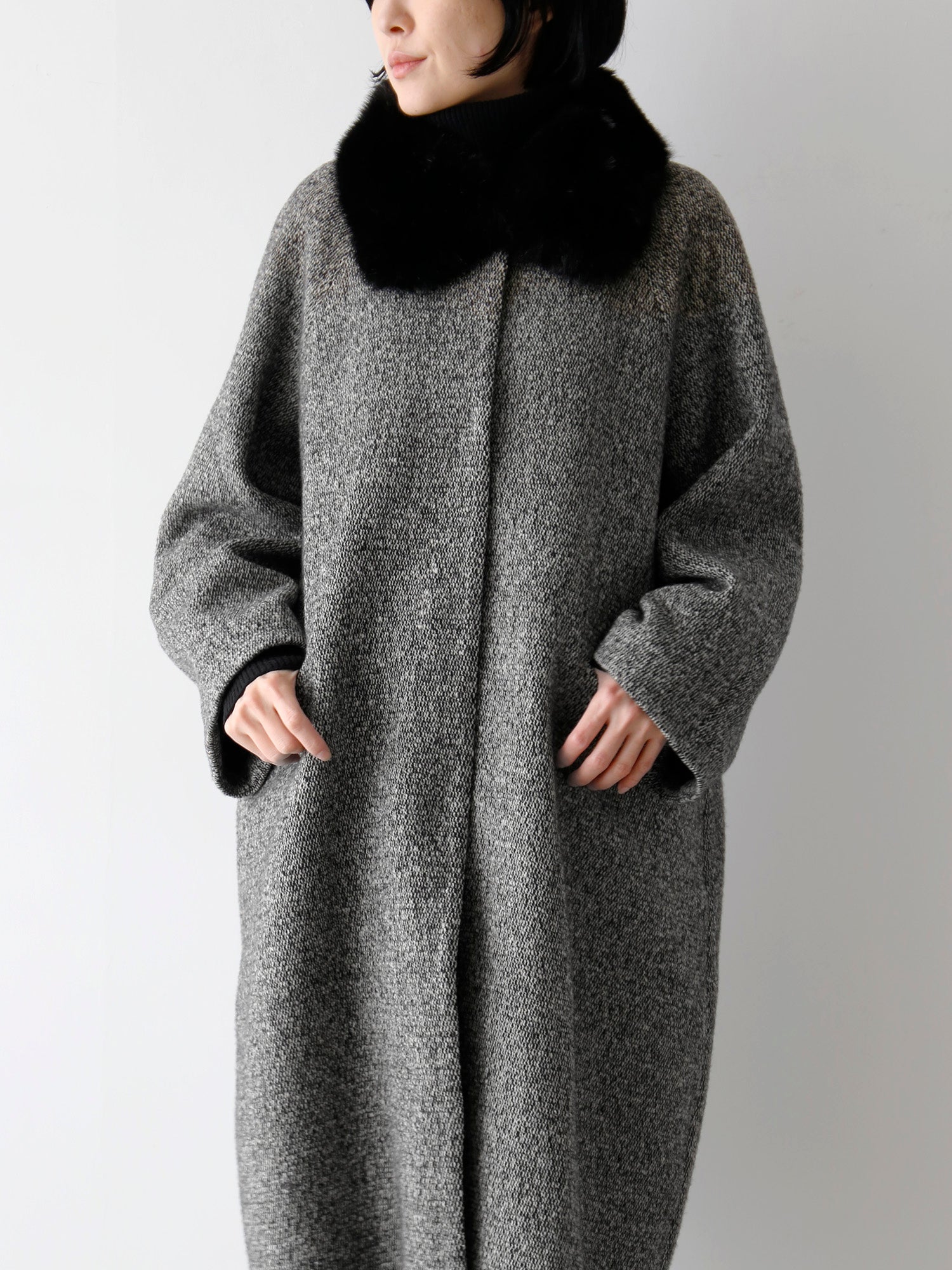 ノーカラーのコートには、ボタンで取り外しができるフェイクファーカラーが付属。その日の装いに合わせて、ファーを付けてアレンジしても。