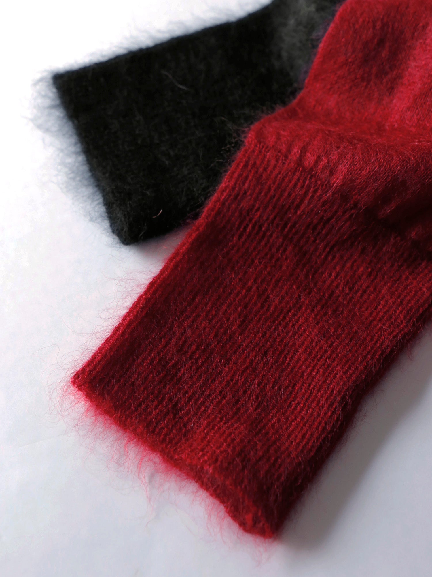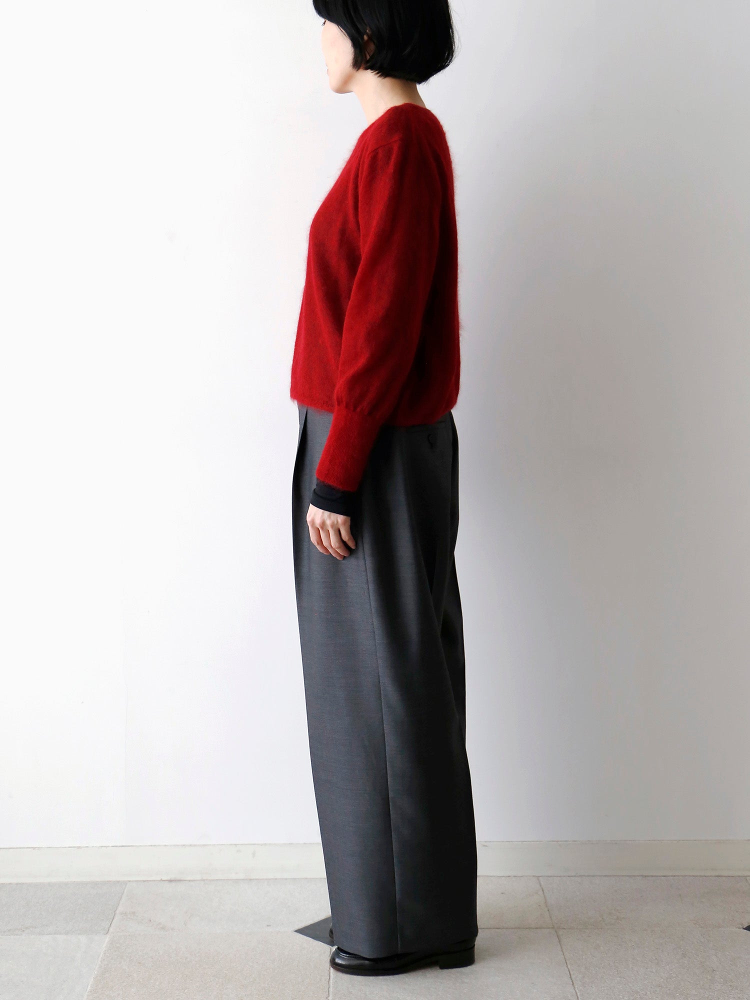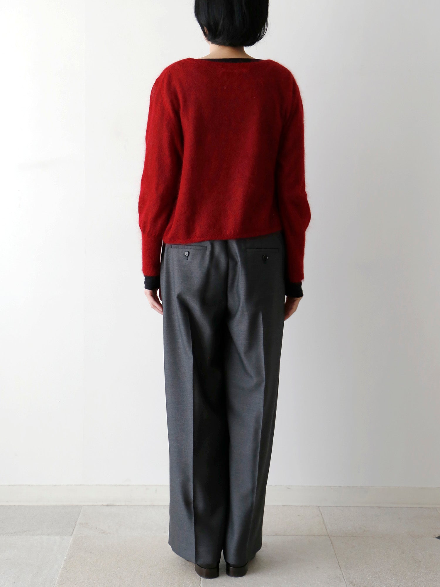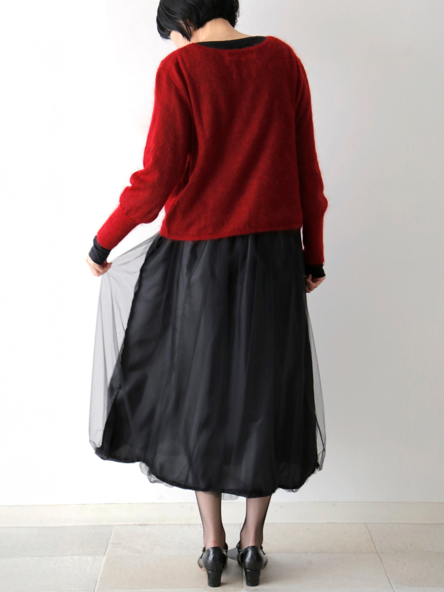 カラーは2色。《ルージュ》は、深い赤。装いの軸になるような華やかな色です。《ノアール》は、静かに輪郭を引き締める黒。毛足のふわりとした質感が、黒の印象をやさしく整えます。