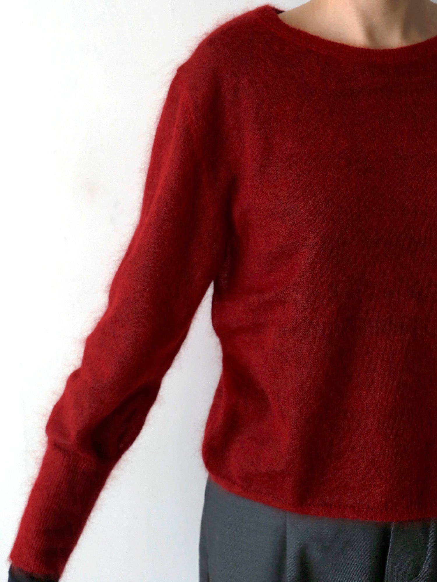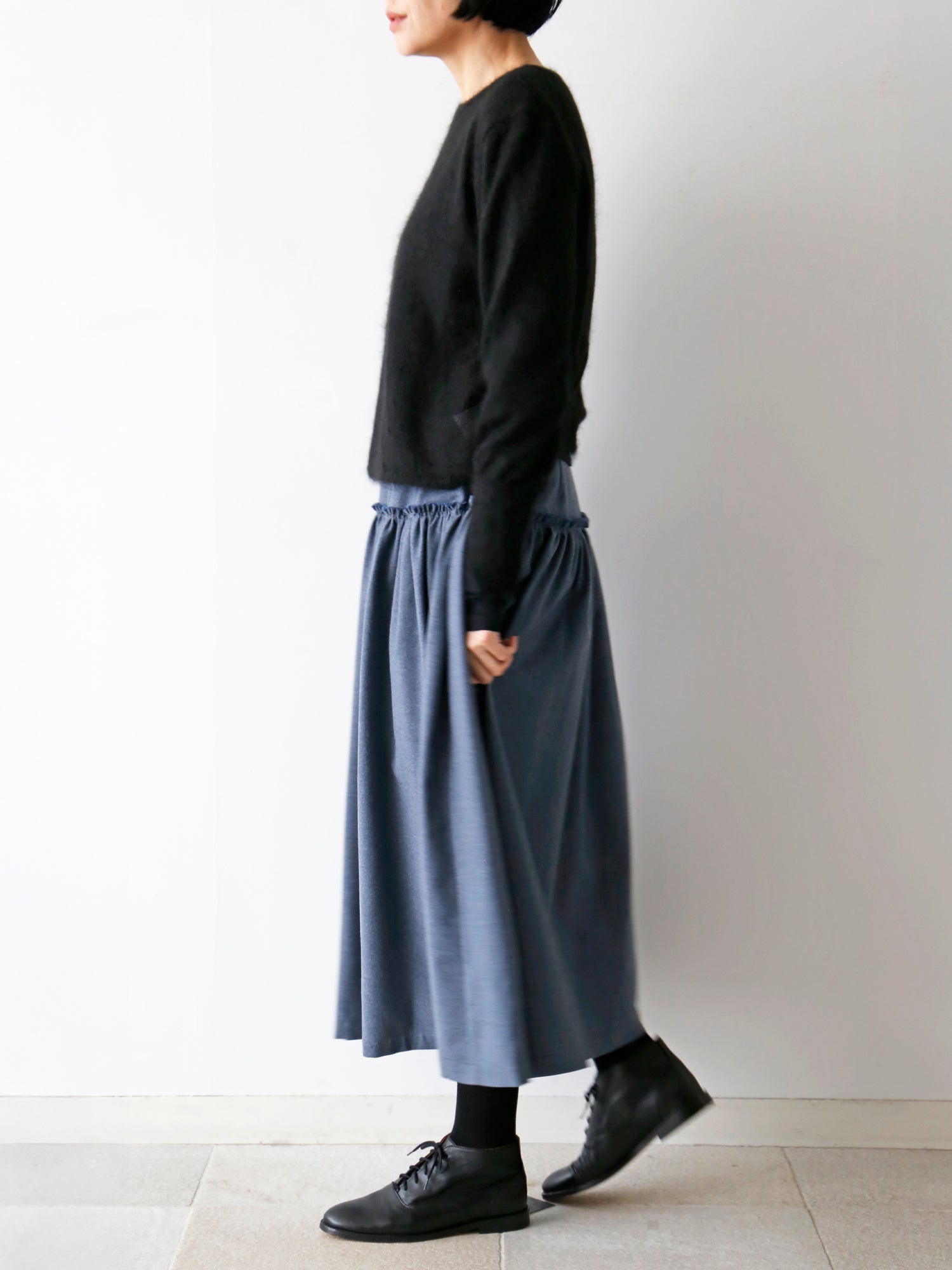 袖丈は長めで袖口リブも長めにつくっています。クシュクシュっとさせて。プレーンなデザインのなかに女性らしい表情のある1枚です。