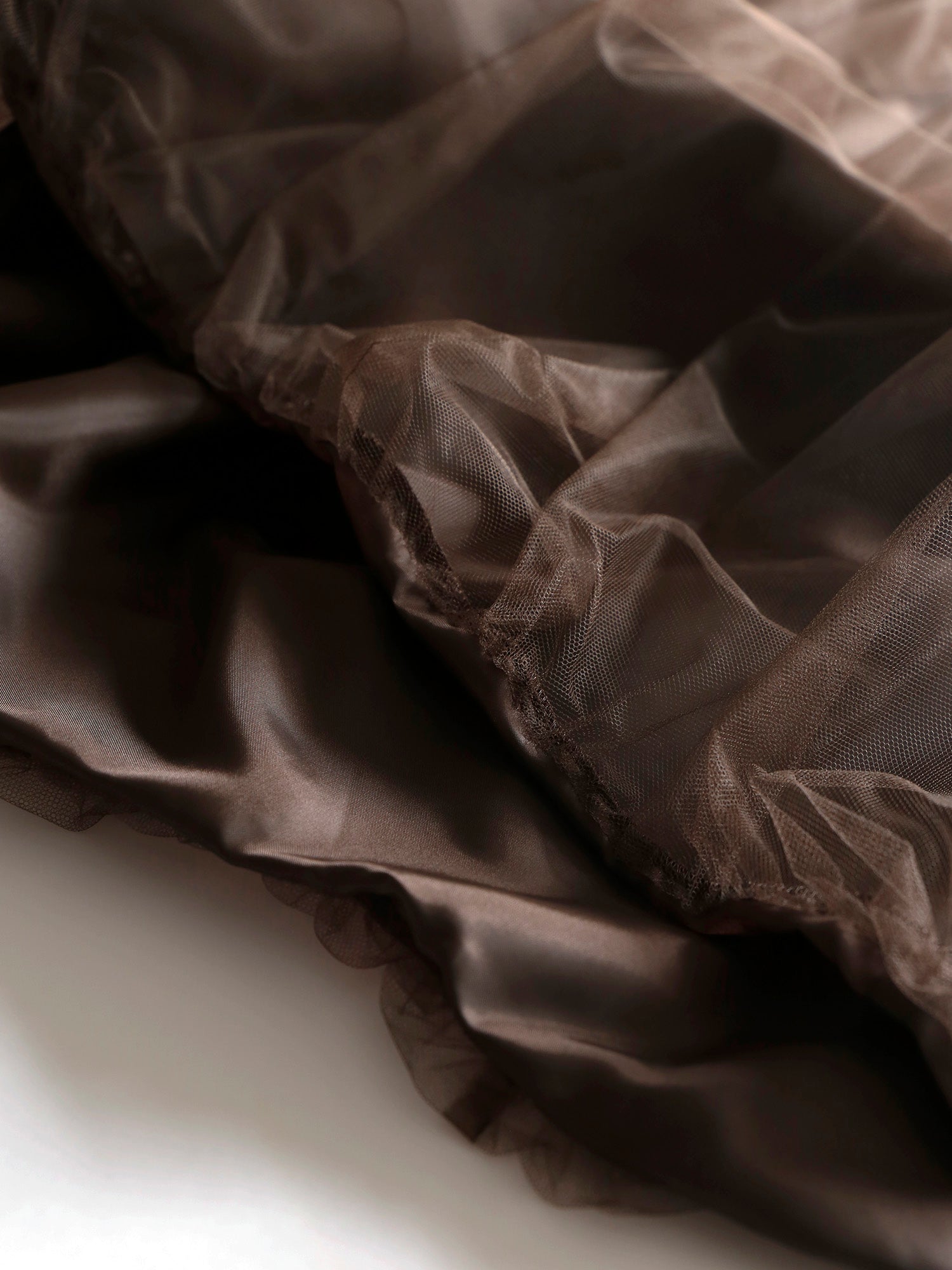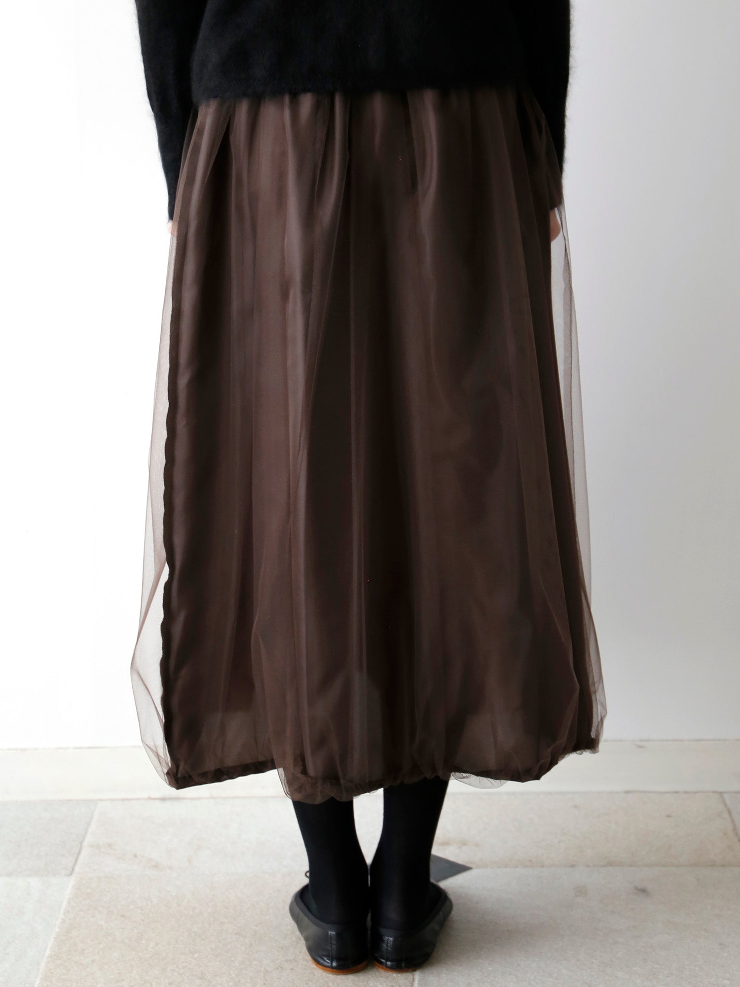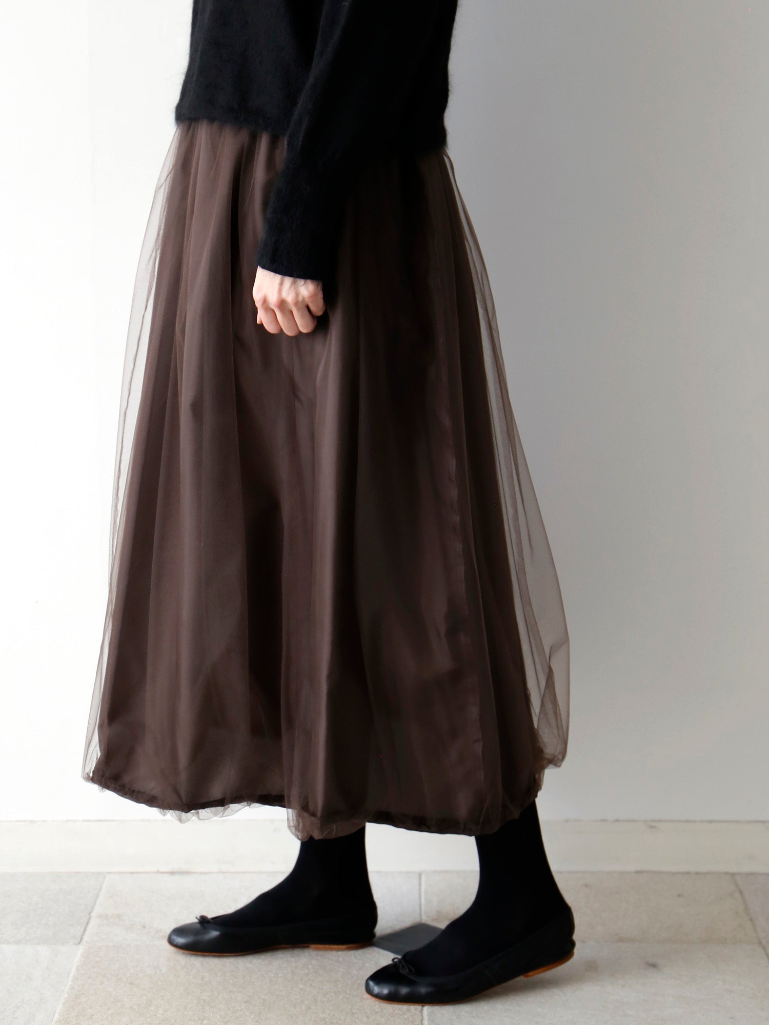 軽やかなフランスチュールを重ね、裾にかけてやわらかく丸みを帯びたバルーンシルエットのスカート。