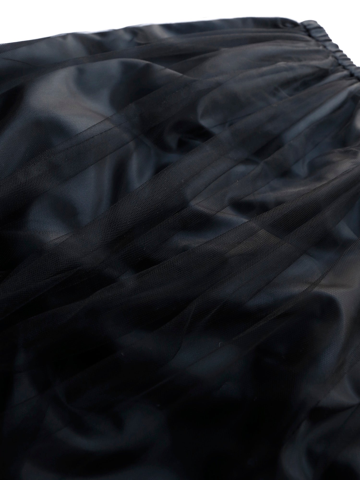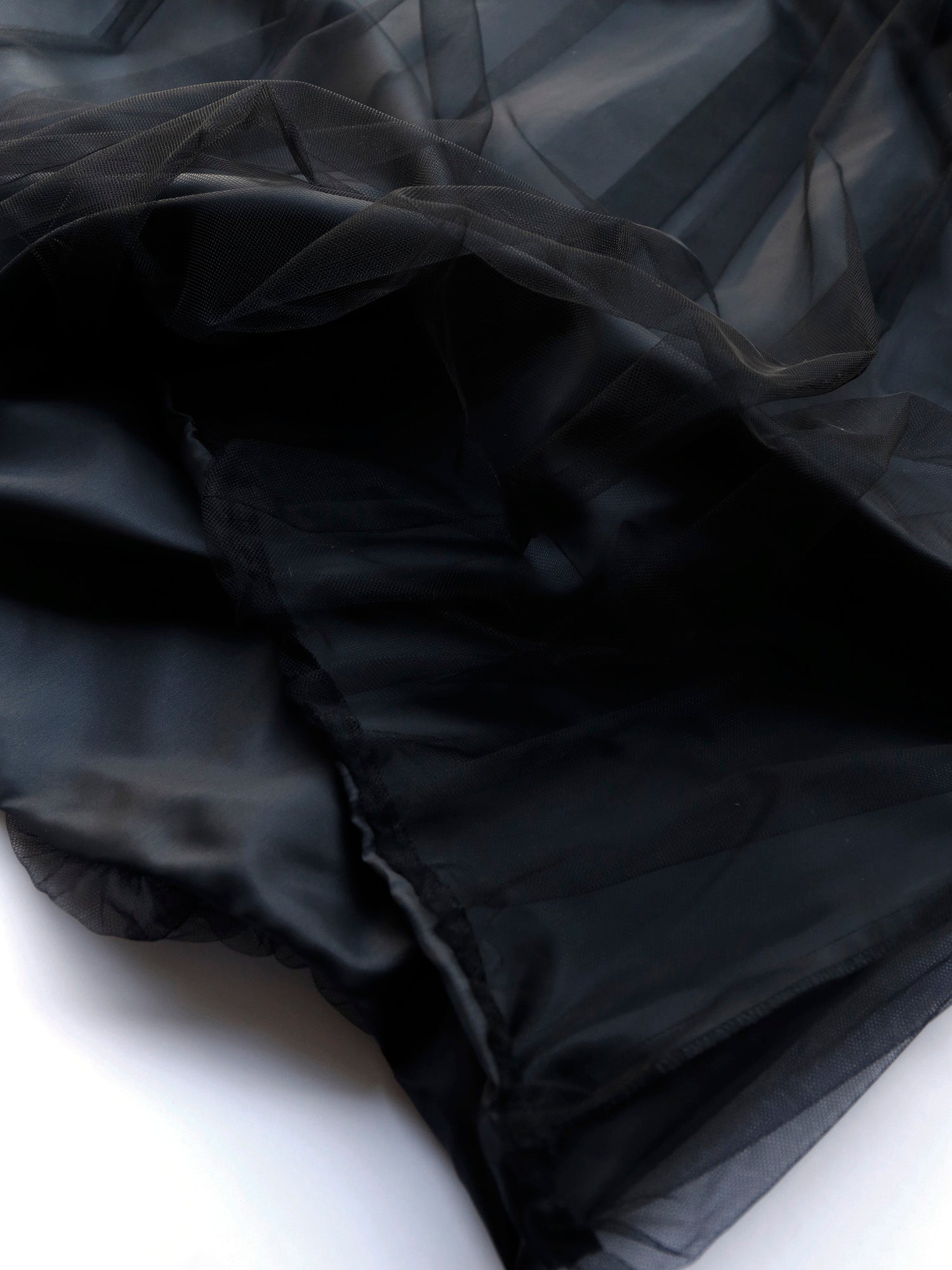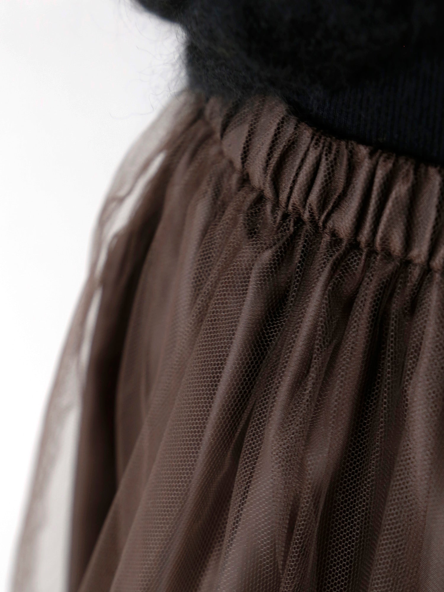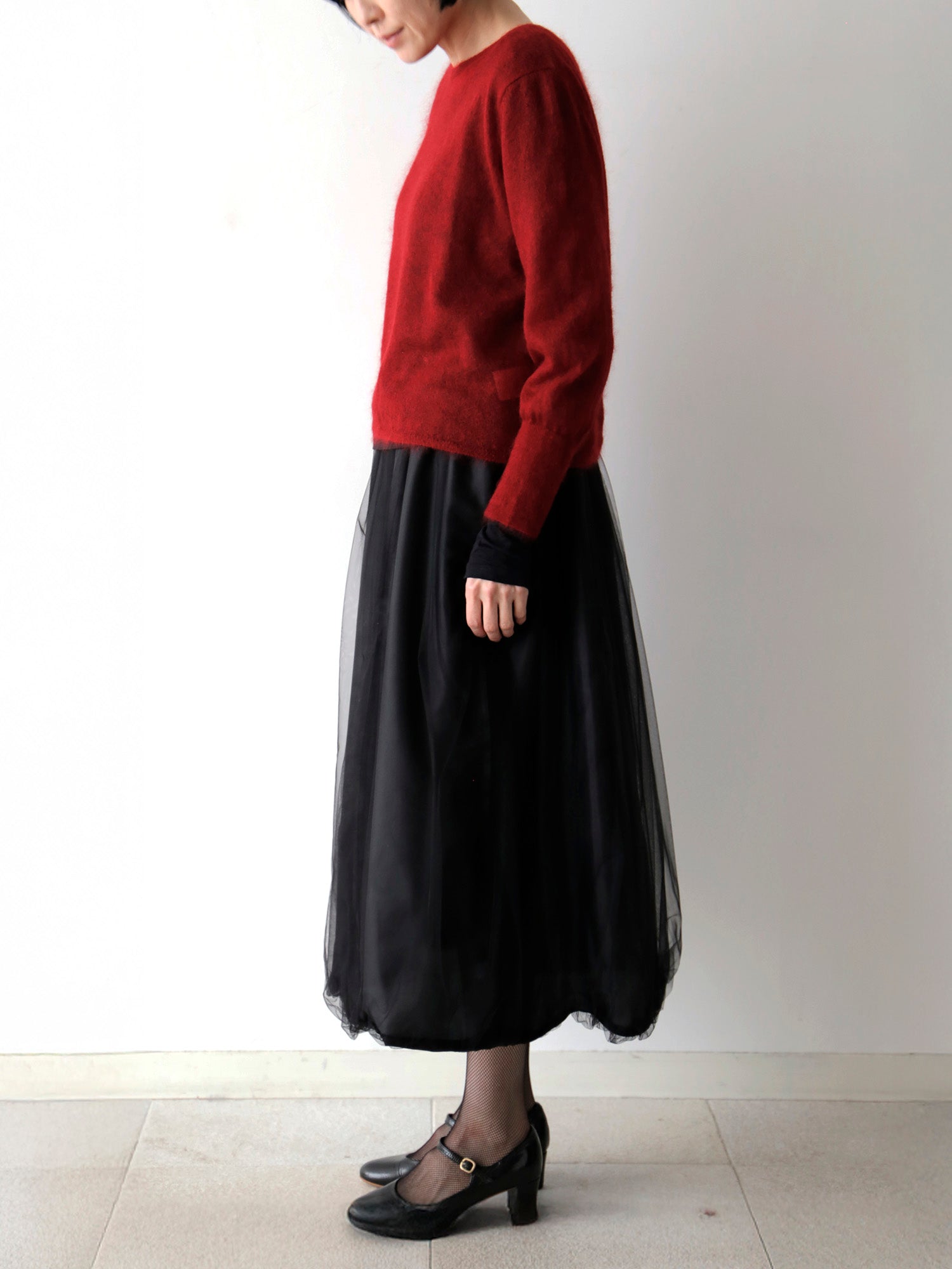 軽やかなフランスチュールを重ね、裾にかけてやわらかく丸みを帯びたバルーンシルエットのスカート。