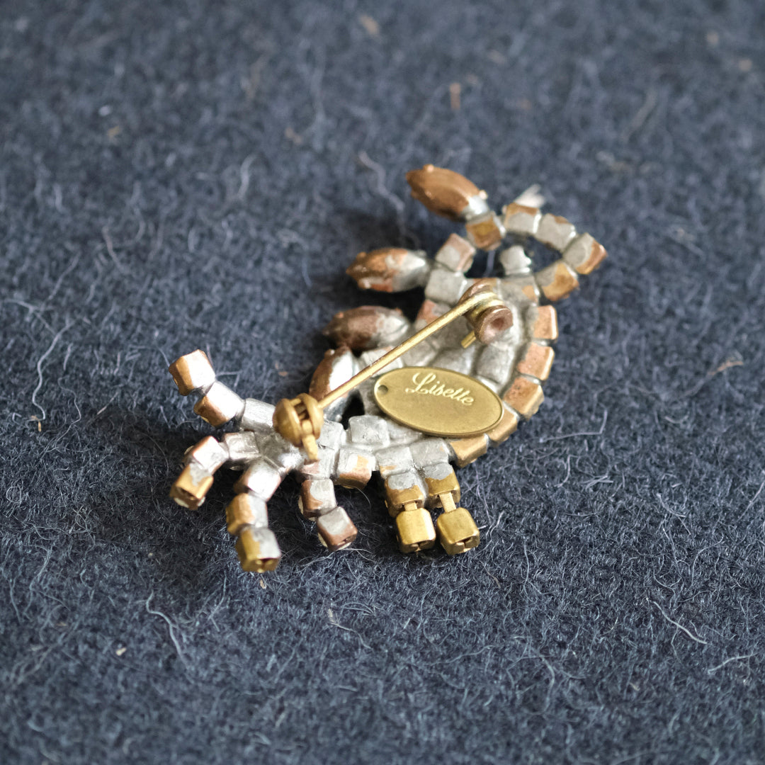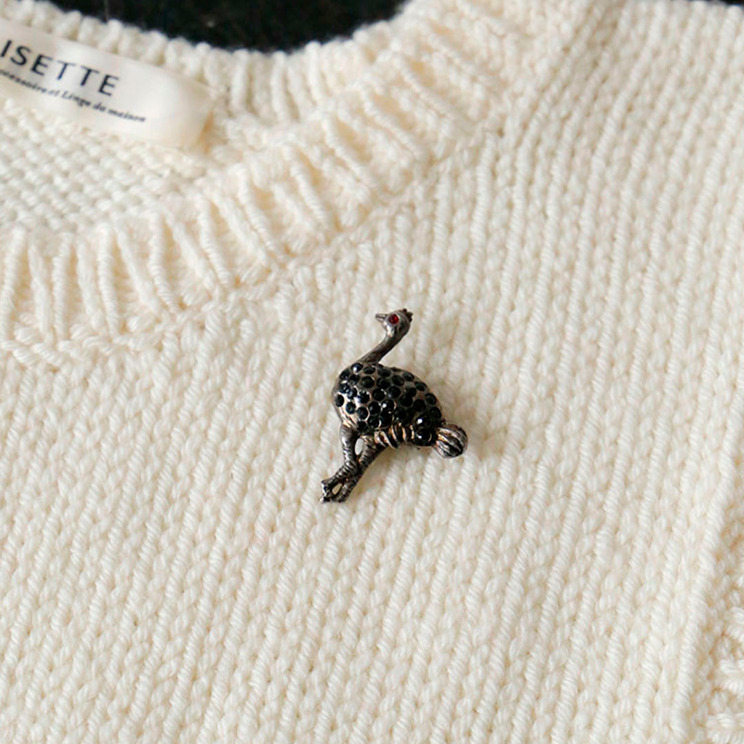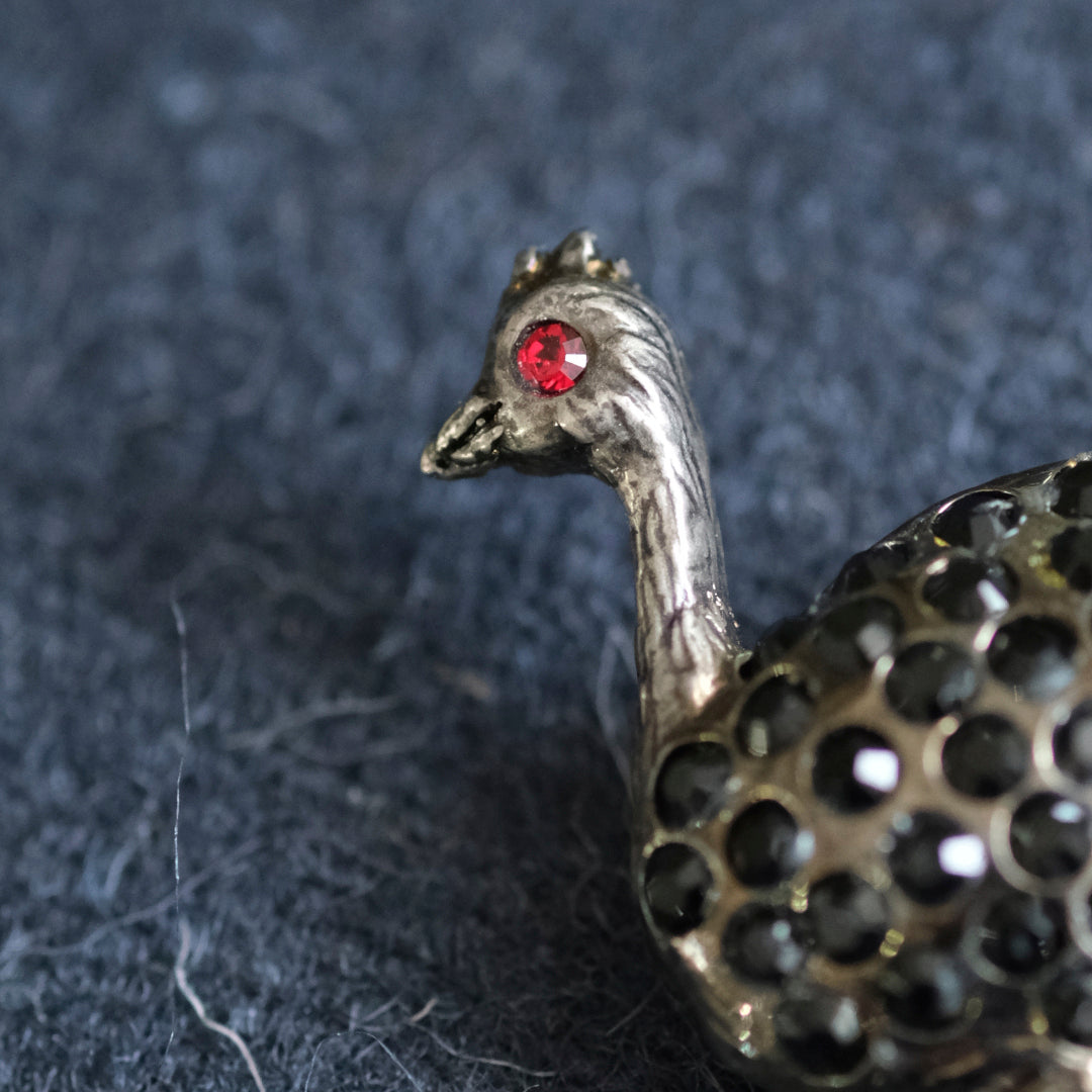 「フロロンス」と名づけた鳥をモチーフにした、ラインストーンのブローチ。