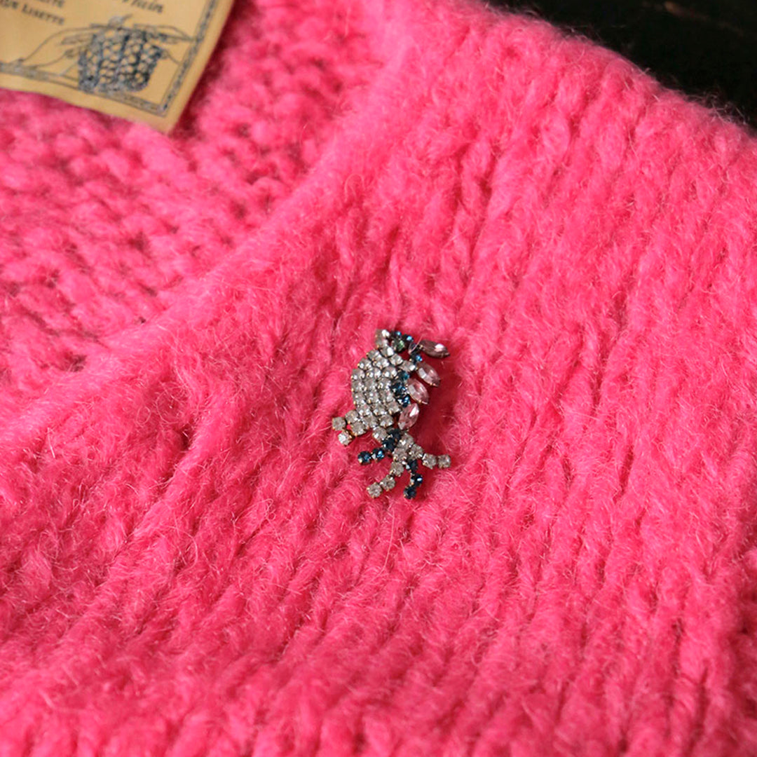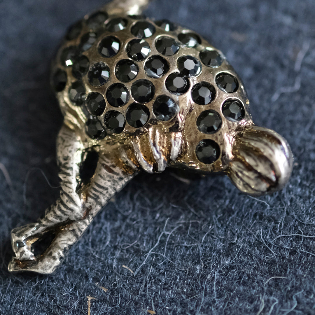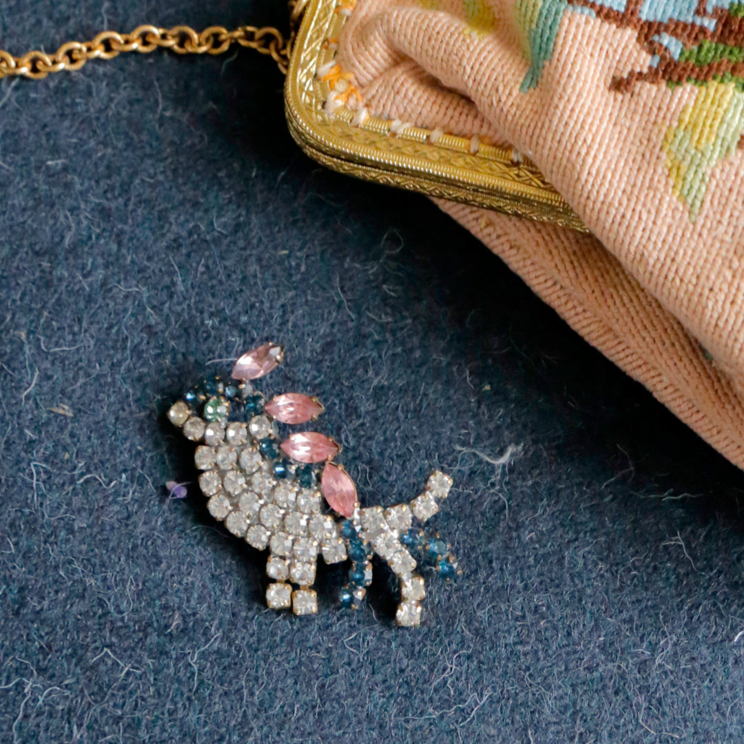 「フロロンス」と名づけた鳥をモチーフにした、ラインストーンのブローチ。
