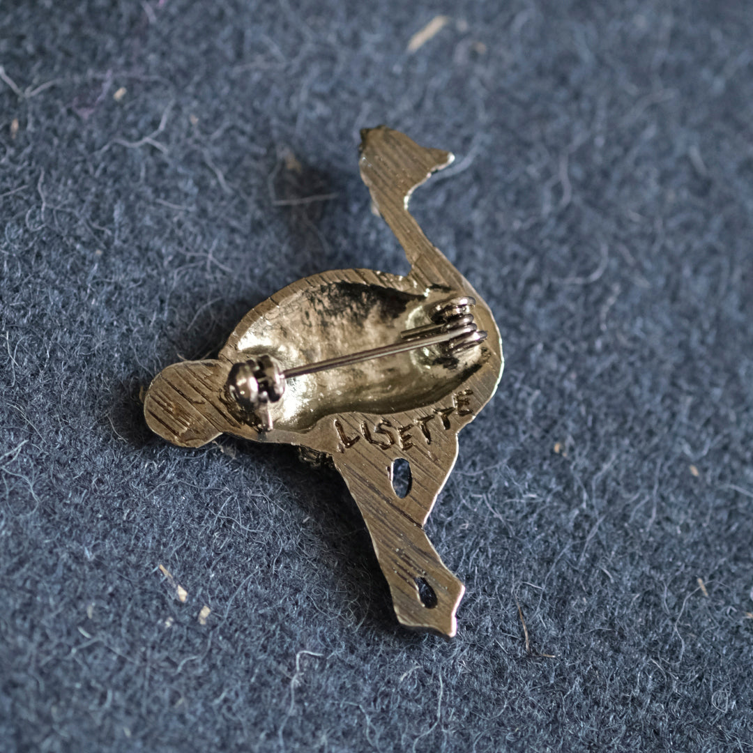 リゼッタのアトリエで、ブローチの土台となる部分をワックスでつくり、だちょうの羽根の流れやくちばし、長い脚のテクスチャまで緻密に仕上げました。裏面には手書きの“LISETTE”の刻印入り。