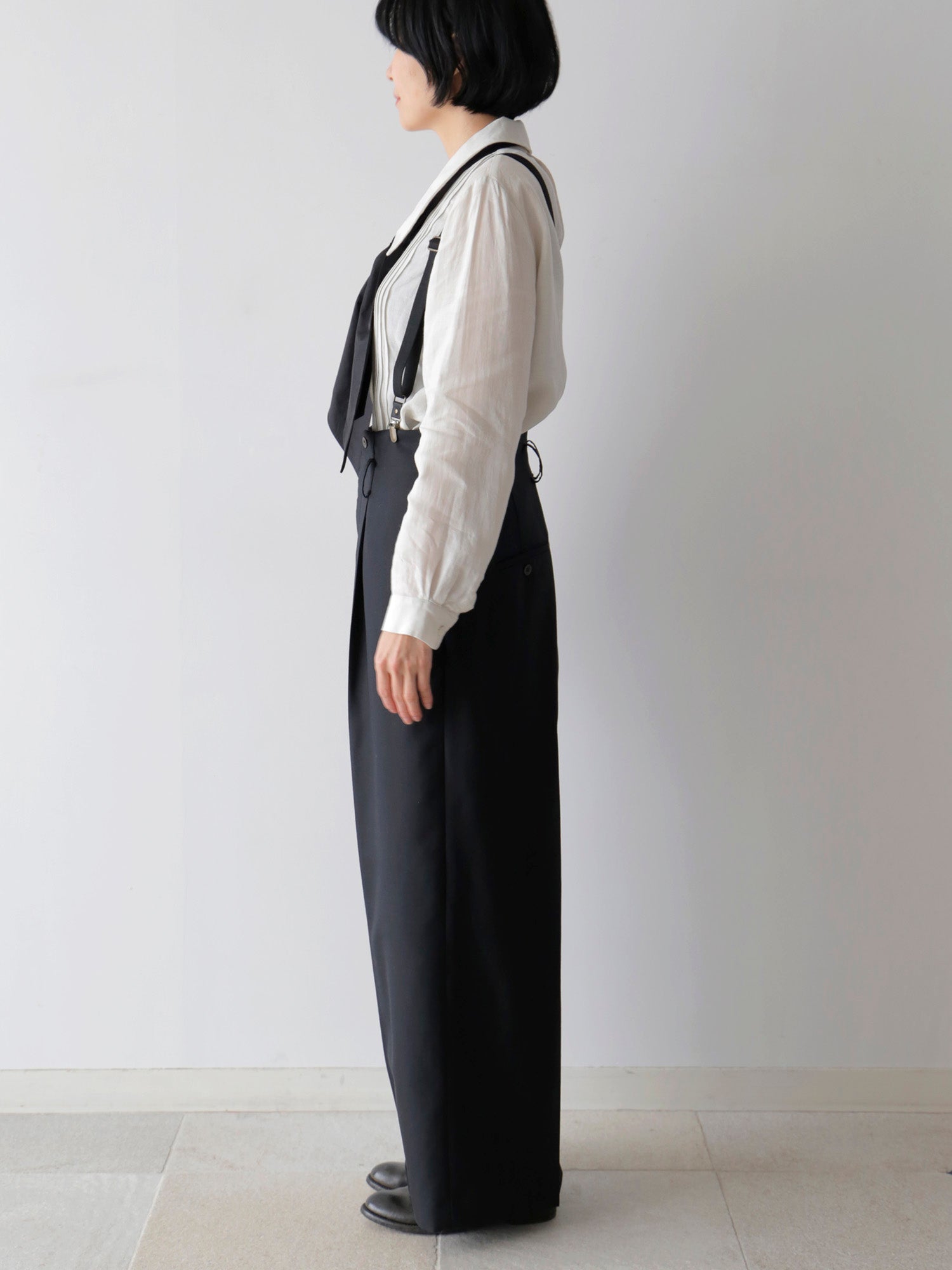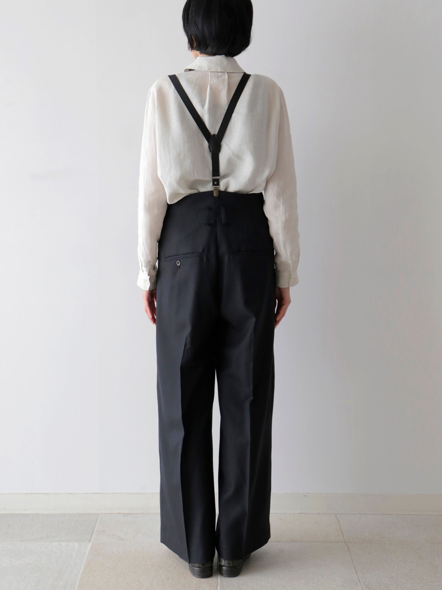 ハイライズのワイドパンツ「ヘンリー」とサスペンダー「ブルテル・マルソー」の特別セット。サスペンダーを合わせて、クラシックな雰囲気を引き立てるマニッシュな着こなしを。