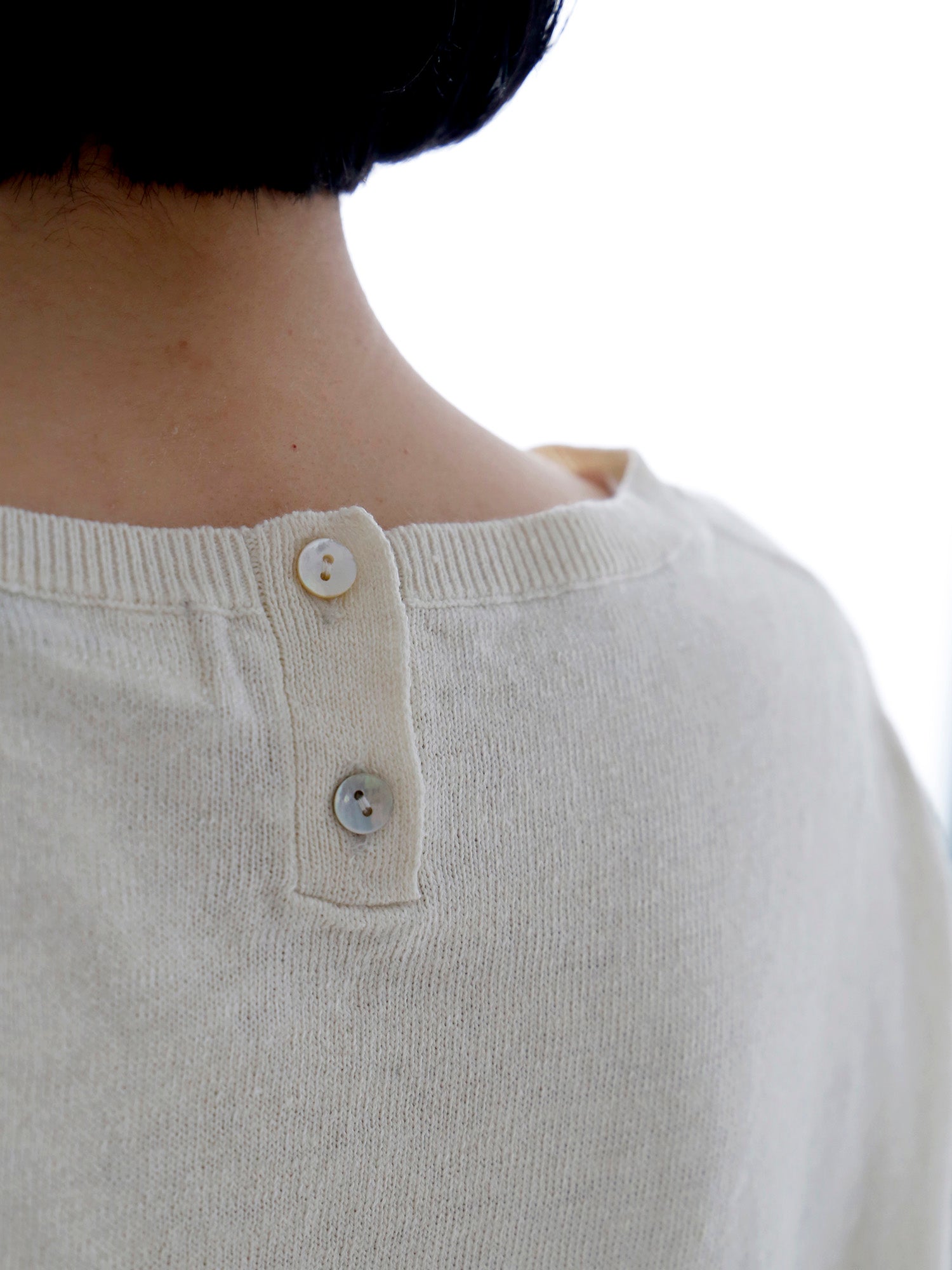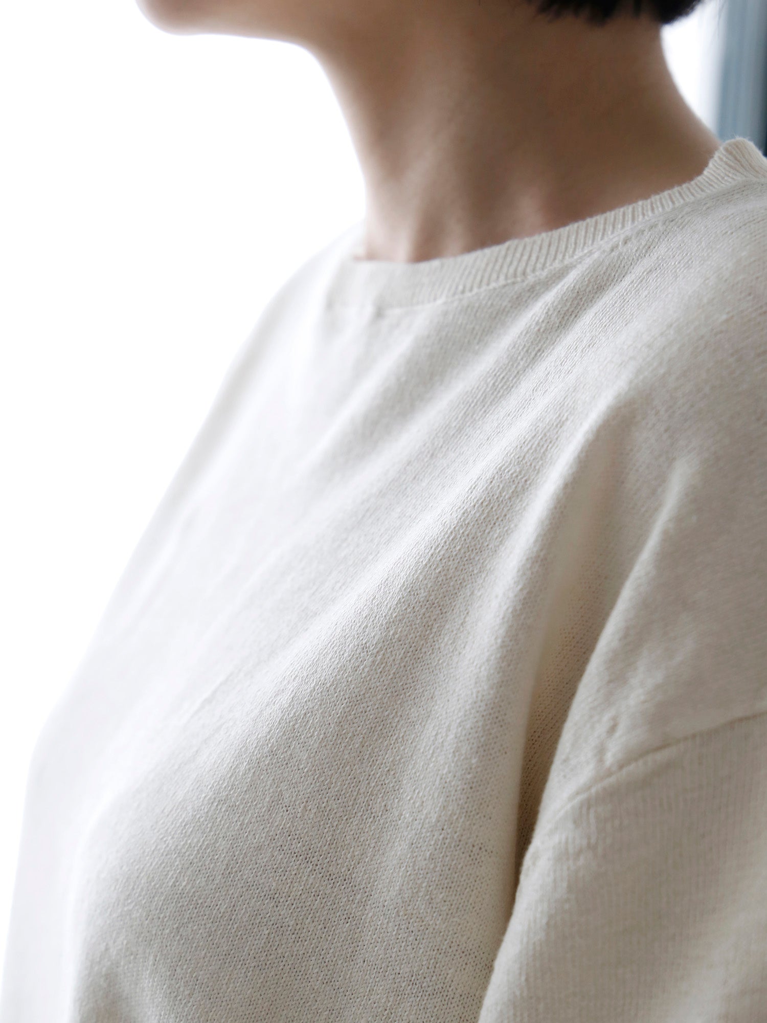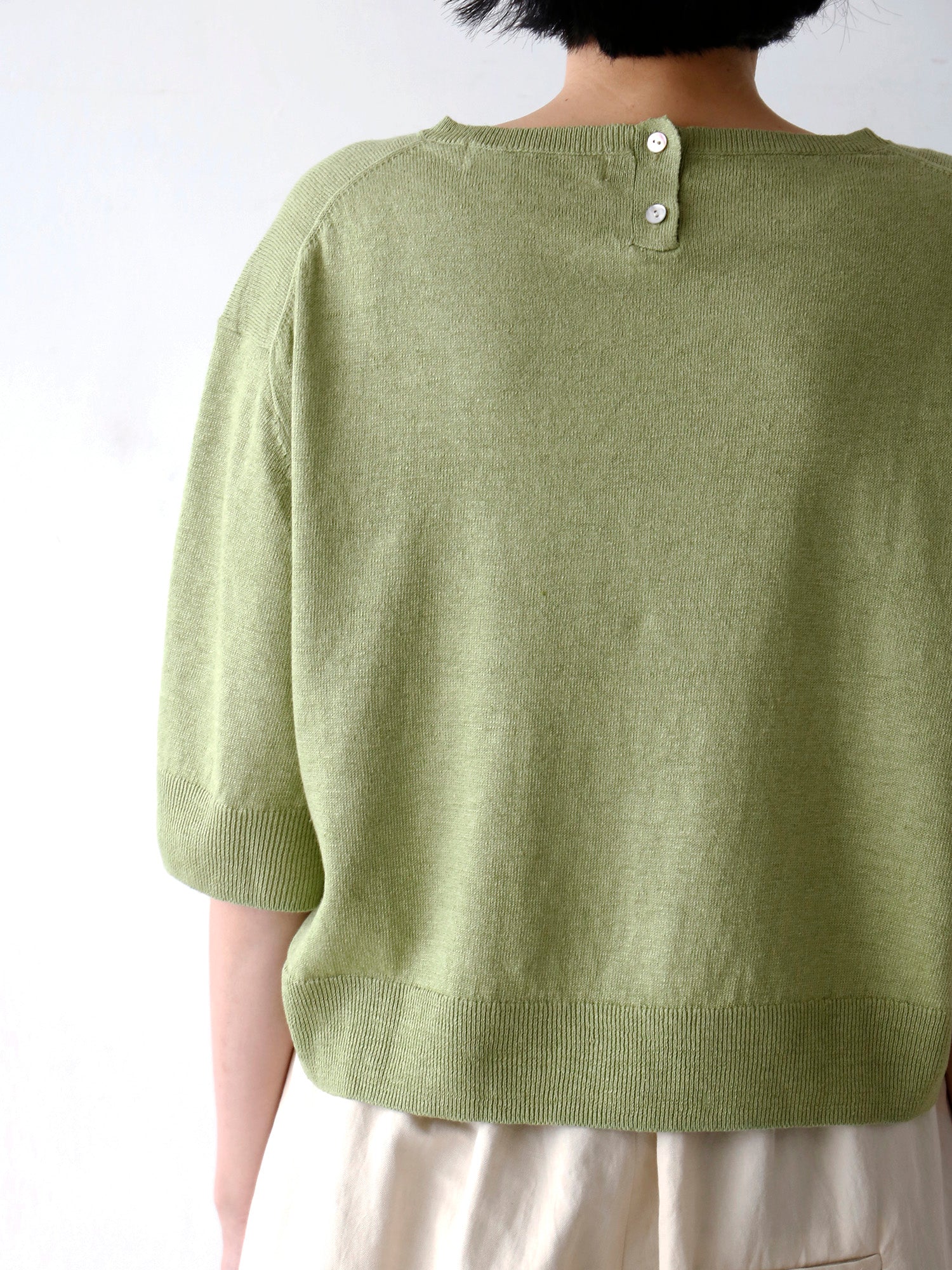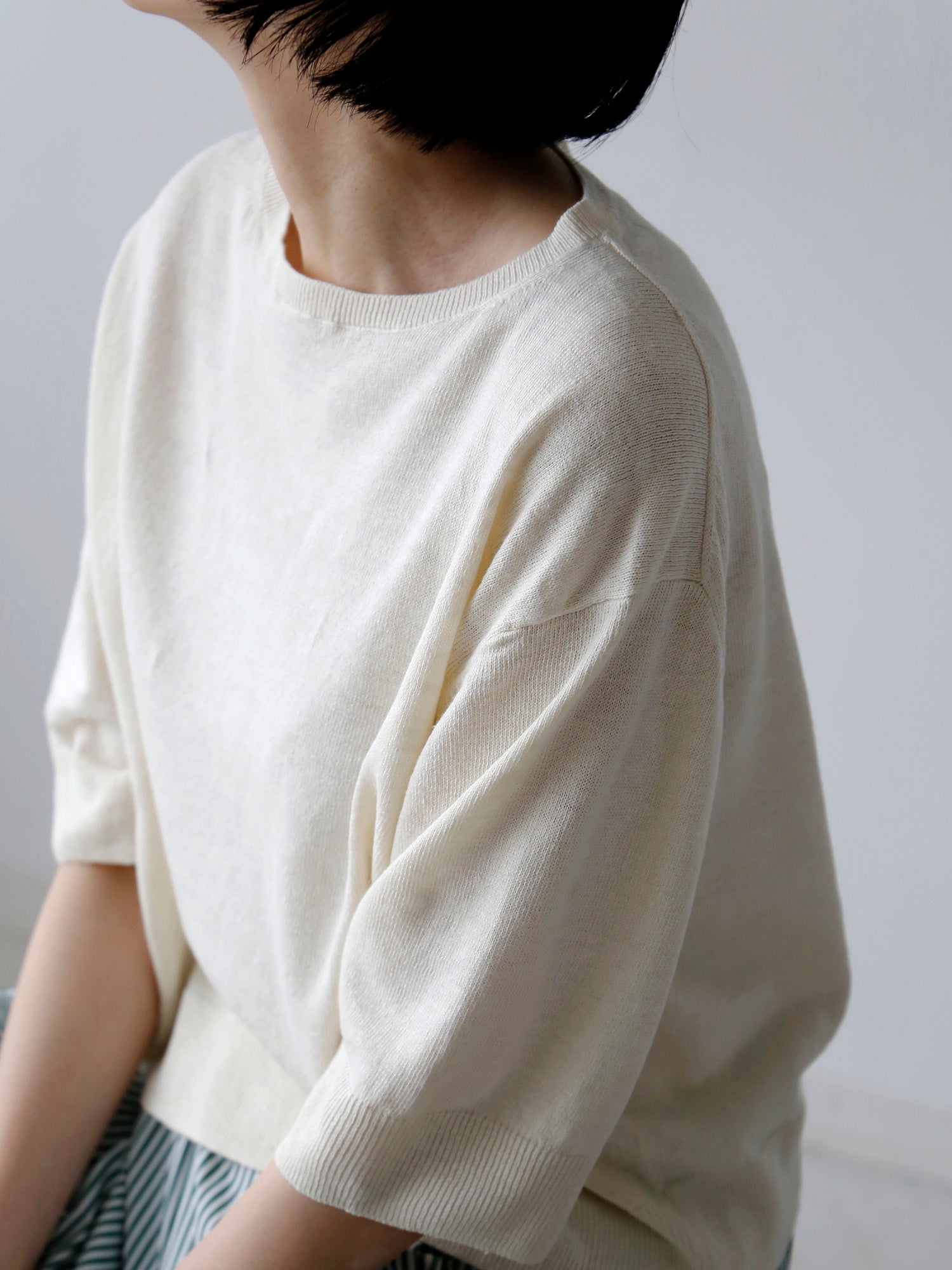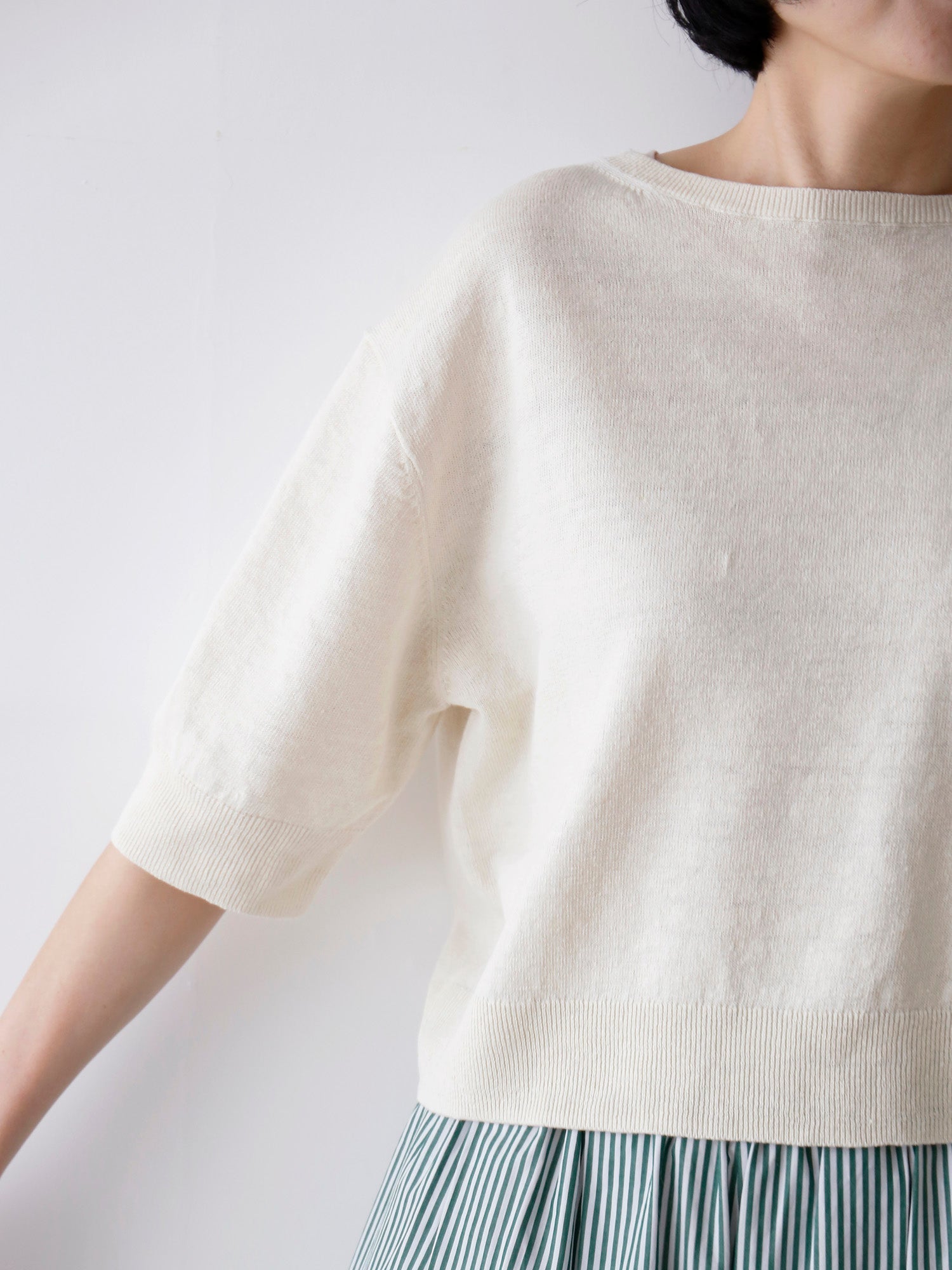 イタリア糸ならではの軽やかさと、リネンの清涼感をあわせ持つ5分袖ニット。