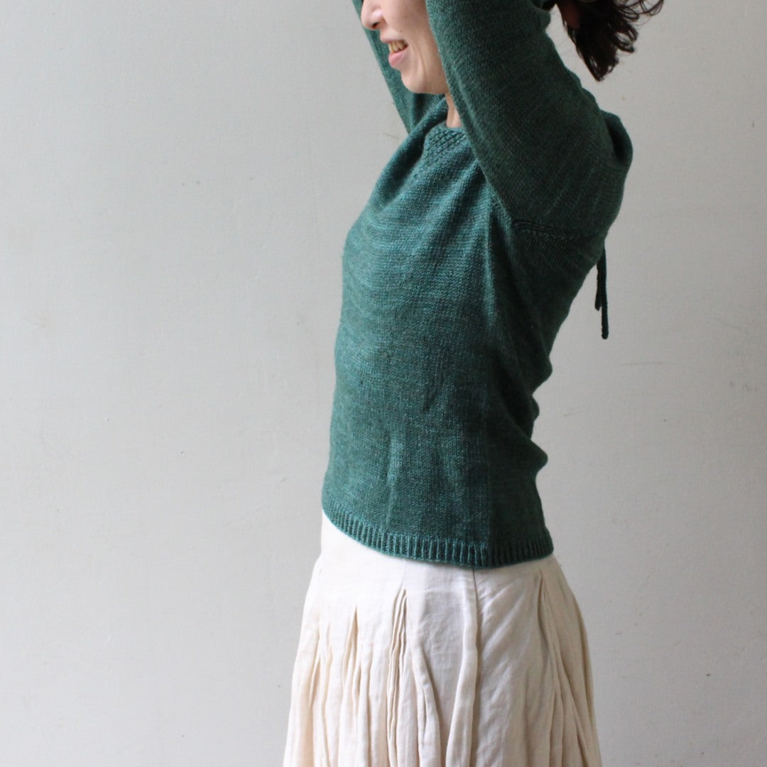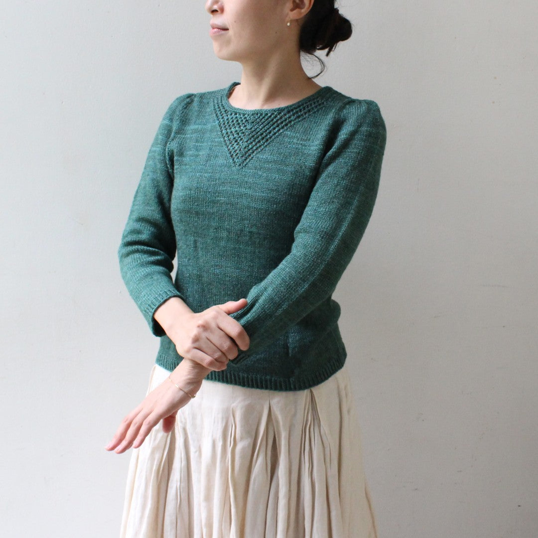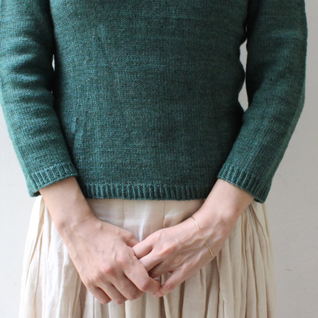 春先または秋口に活躍する長袖のデザインで、胸囲77.5cm~101cmのサイズが編めるパターン)です。