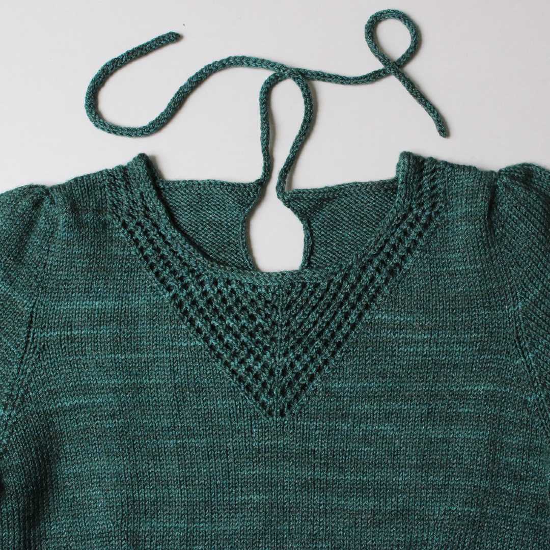 レース模様に加え、ふっくらとした袖山や後ろリボンになっているネックラインなと、シンプルなプルオーバーに愛らしいアクセントを盛り込んだニットウェア。