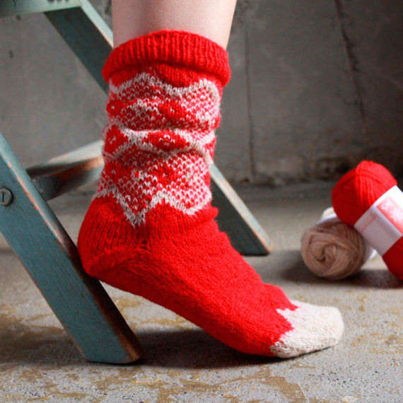 ウール100%の糸で2色を細かく編み込むソックスは、模様の部分が地厚になるので、とてもあたたか。