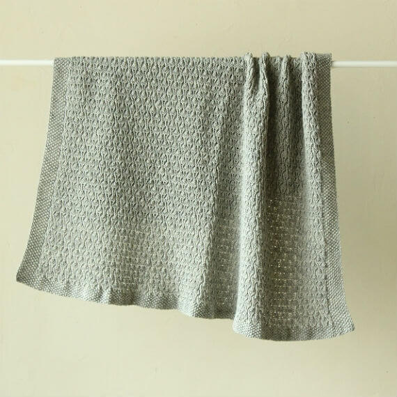 縦のラインが波のように連なる地模様に、かのこ編みの縁がついたベビーブランケット。