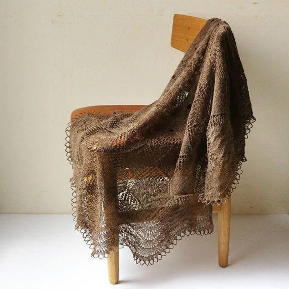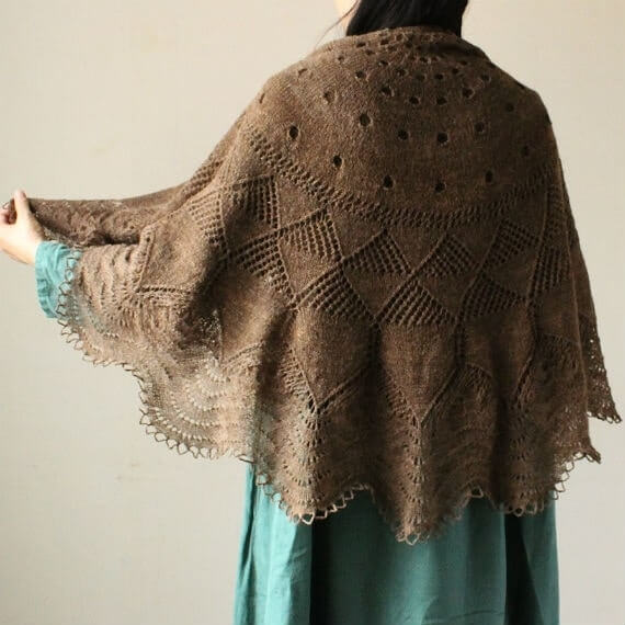 中心から編みはじめるエレガントな円形のショールを編むパターンです。