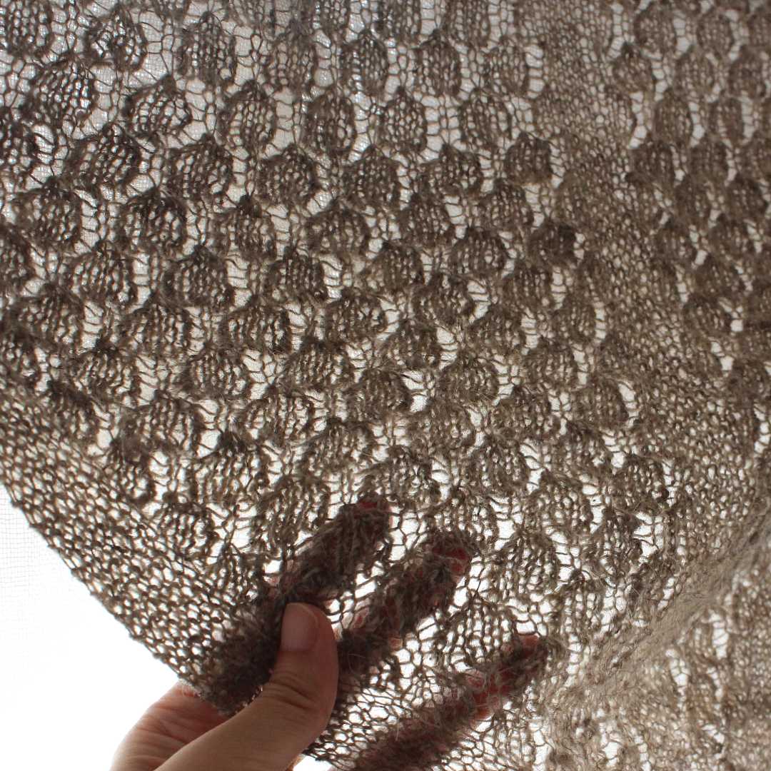 ウォルナットの模様は、毎段、かけ目・減目をしてつくるレースパターン。